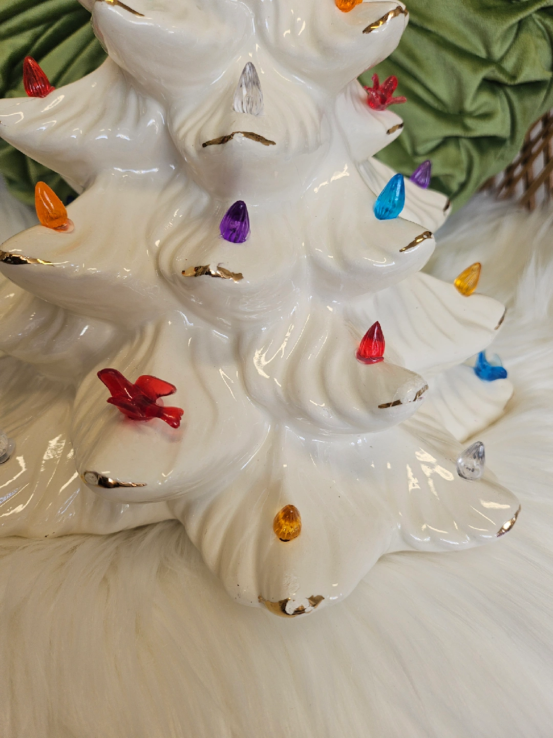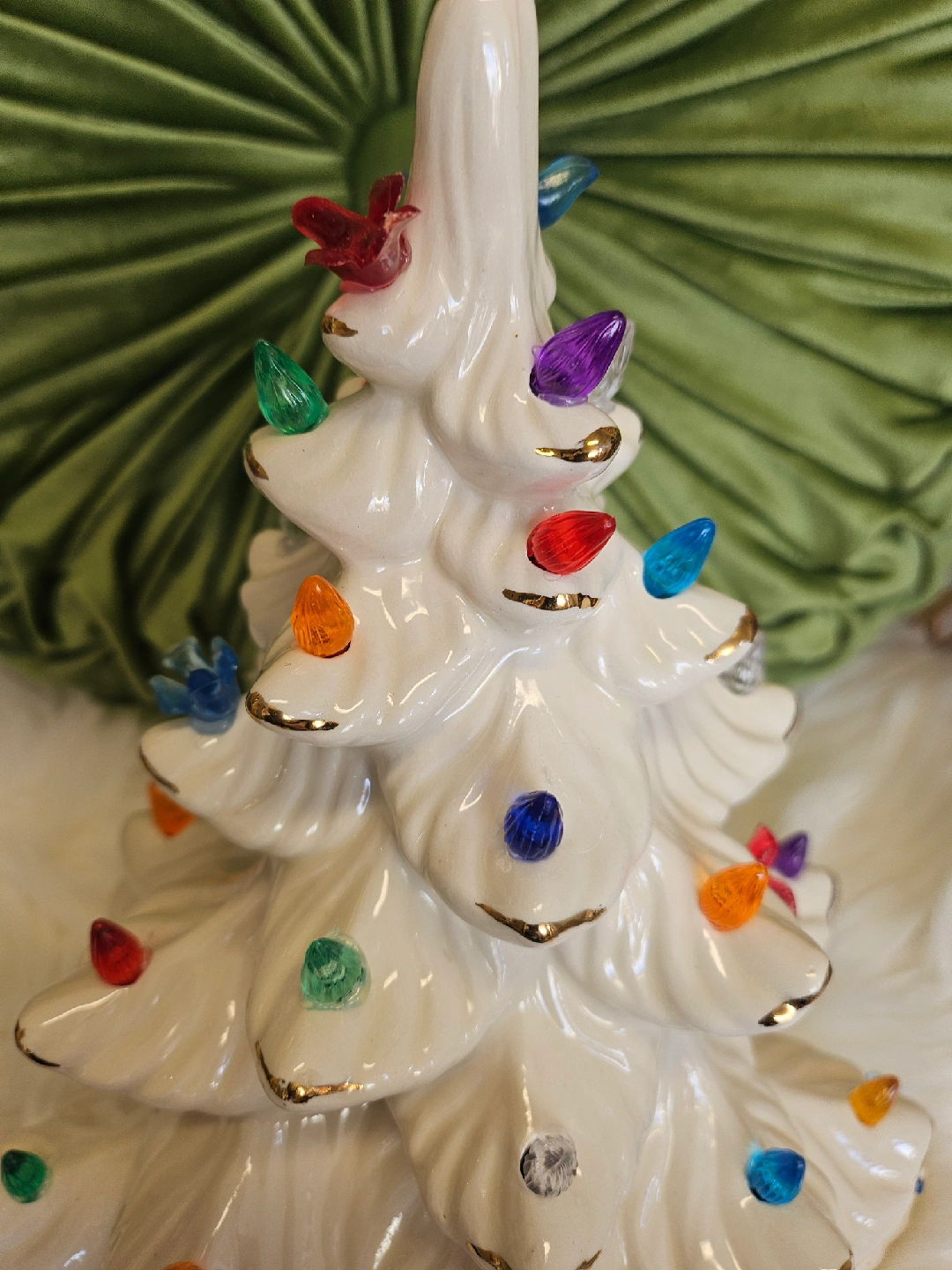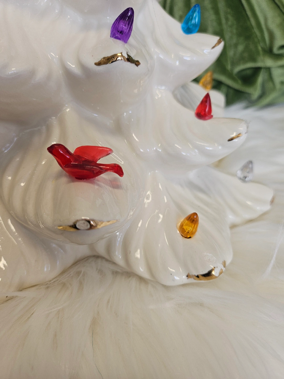 21Looking to add a bit of vintage charm to your holiday decor? This ceramic Christmas tree is just the thing! It's got a lovely white finish, little birds, and colourful lights. It's in great condition and ready to brighten up your home this season. the base is missing.