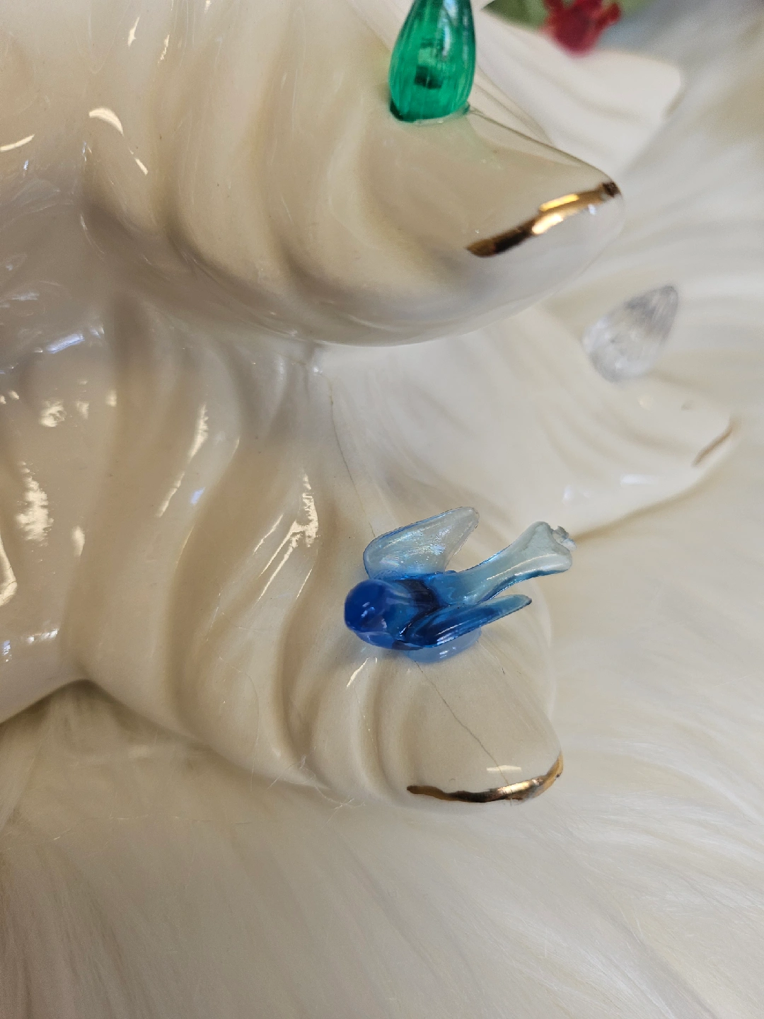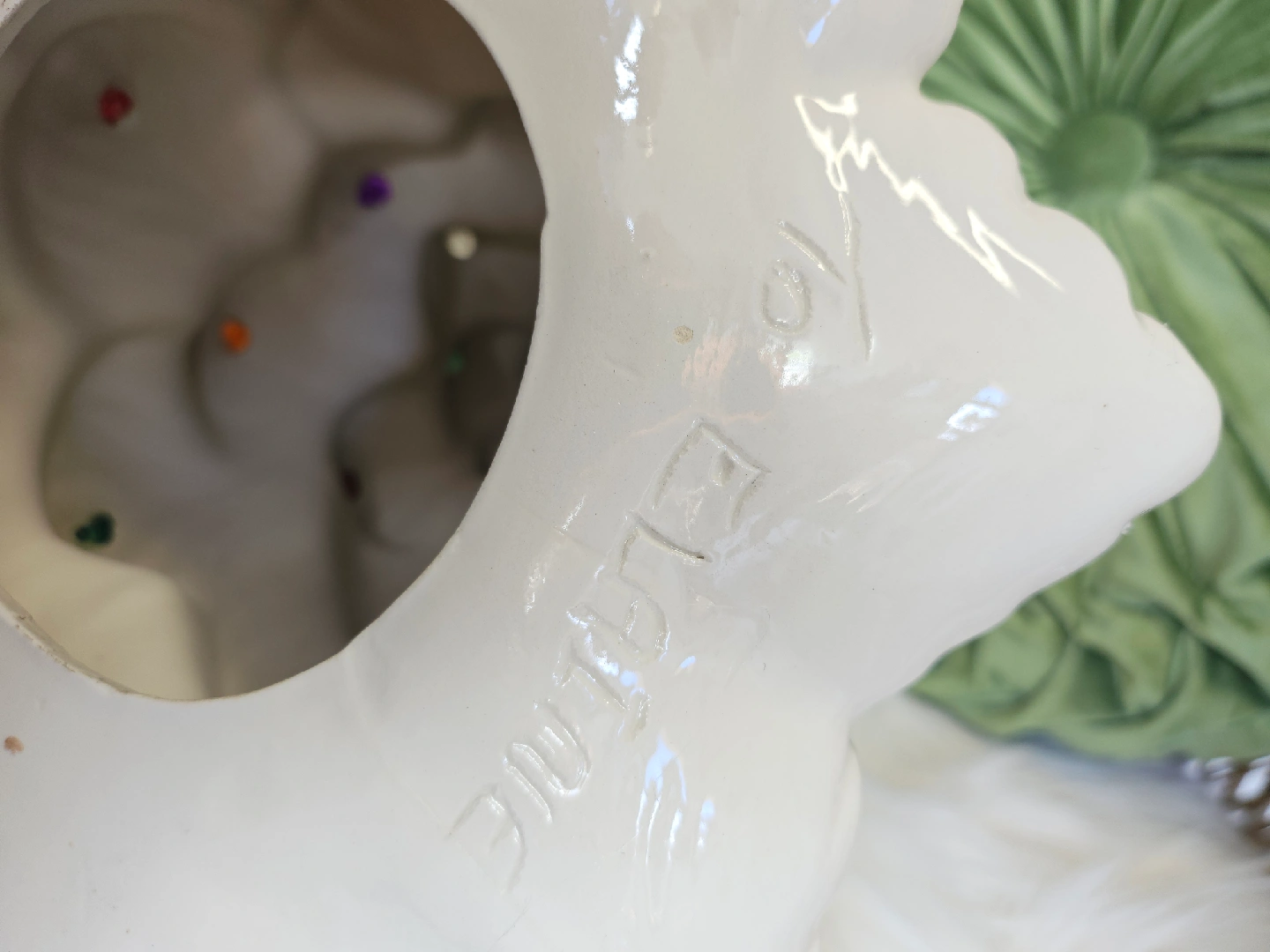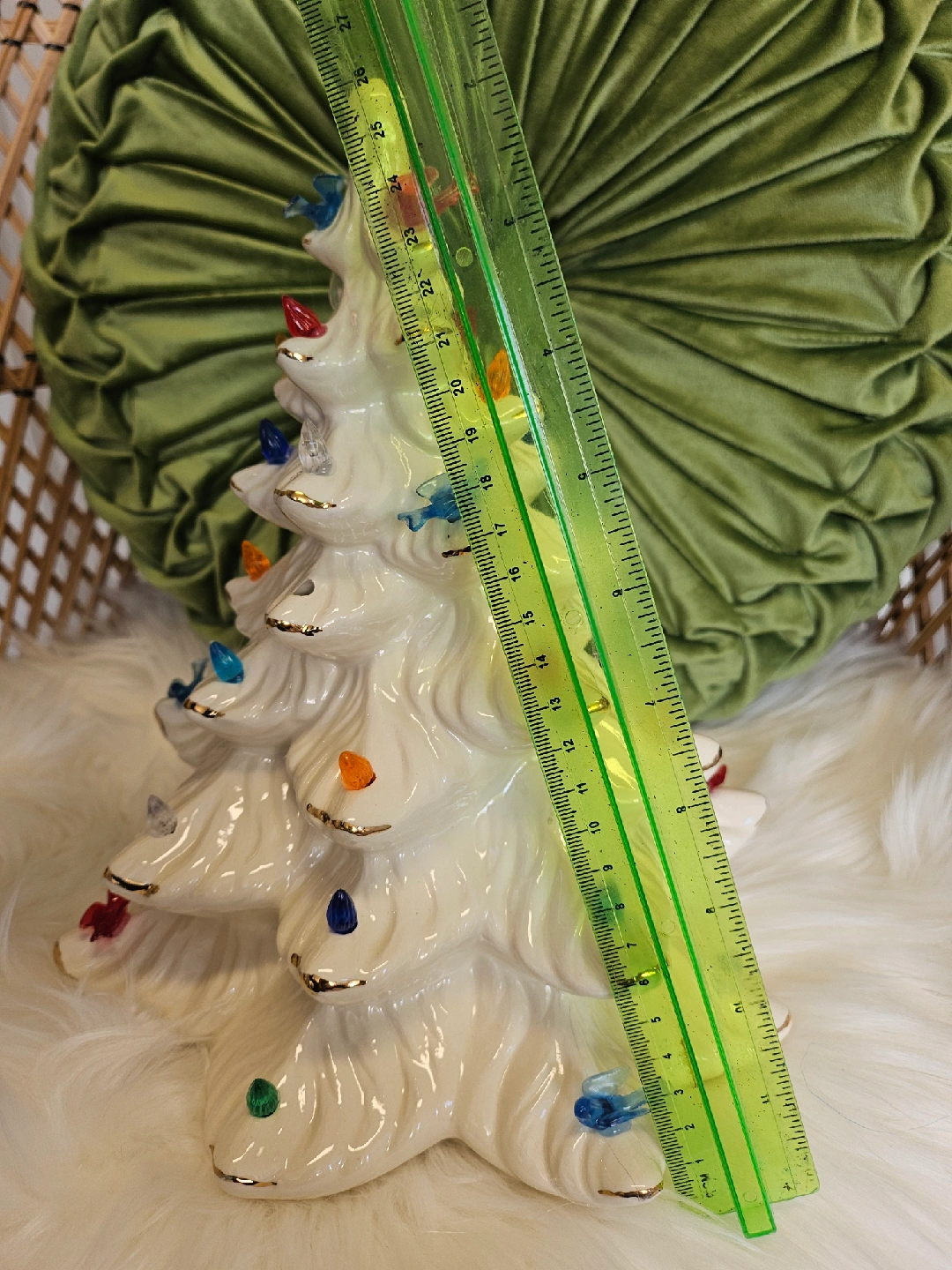 21Looking to add a bit of vintage charm to your holiday decor? This ceramic Christmas tree is just the thing! It's got a lovely white finish, little birds, and colourful lights. It's in great condition and ready to brighten up your home this season. the base is missing.