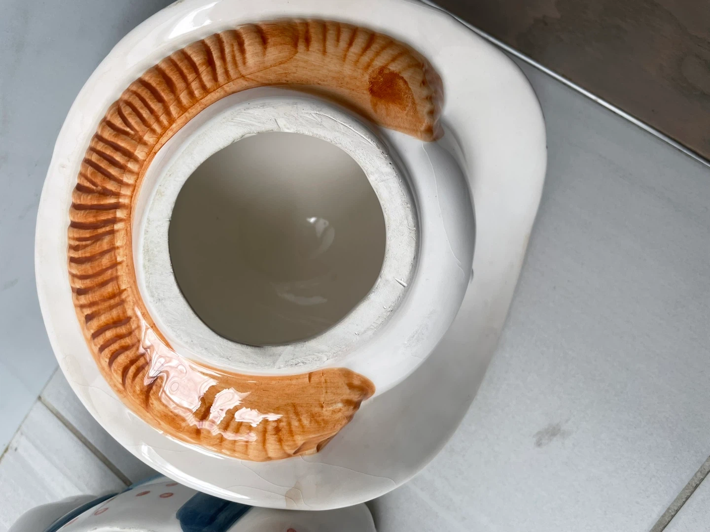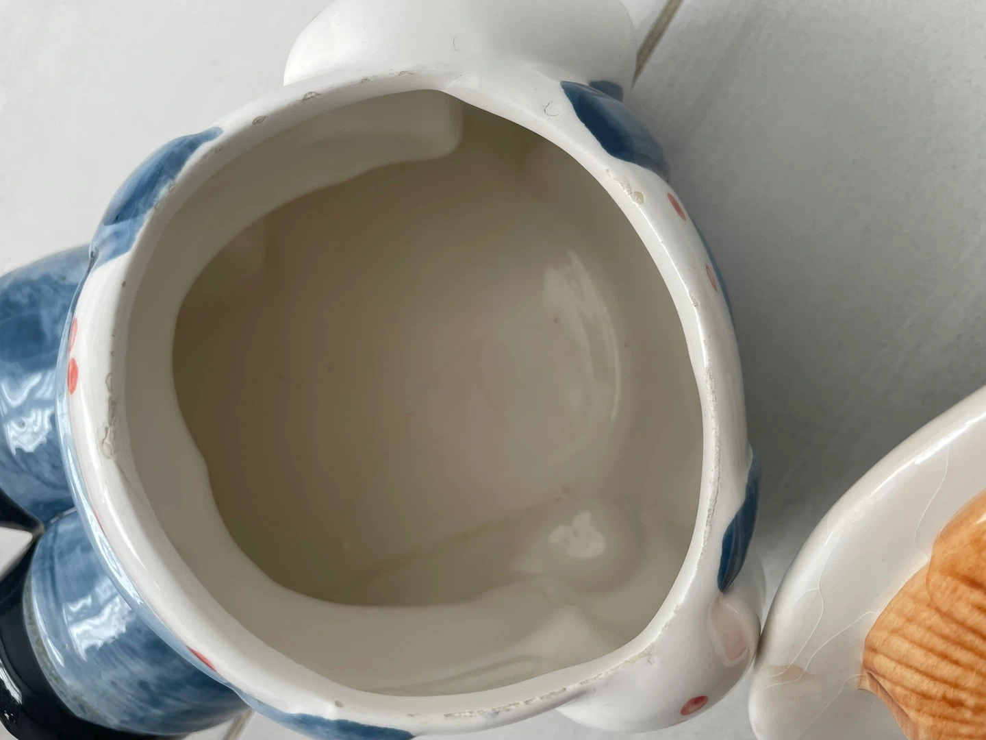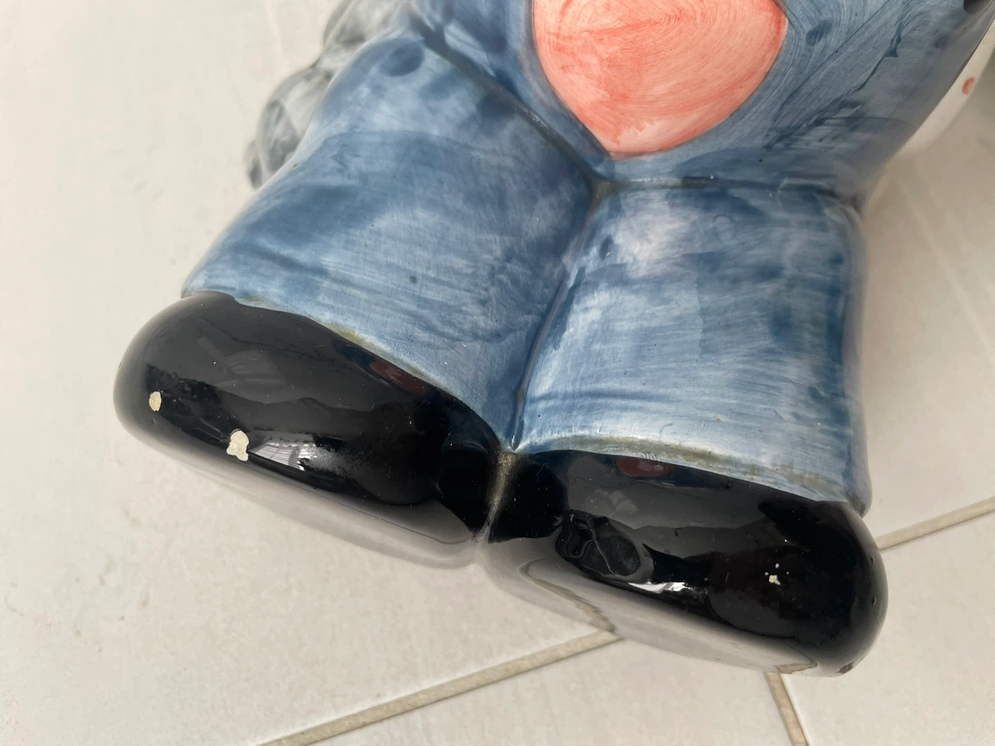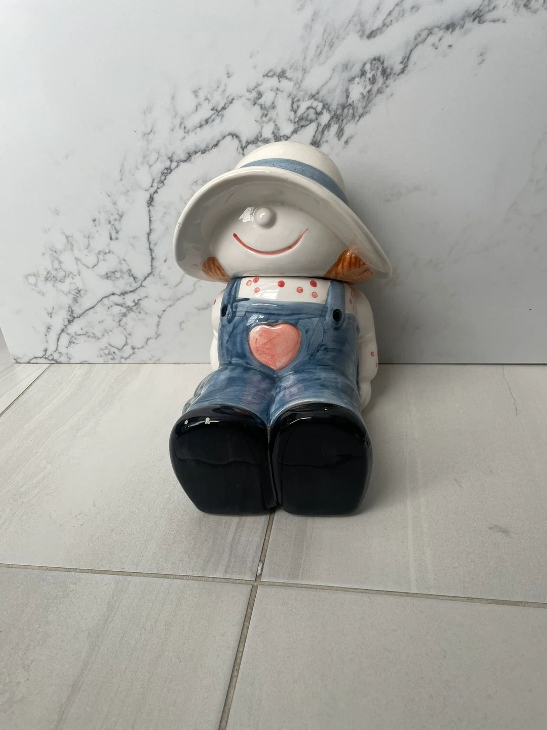 Selling a unique vintage ceramic cookie jar shaped like a girl in overalls and a sun hat. It has some minor wear and tear, as shown in the photos, but it's still a charming piece for your kitchen or collection!
