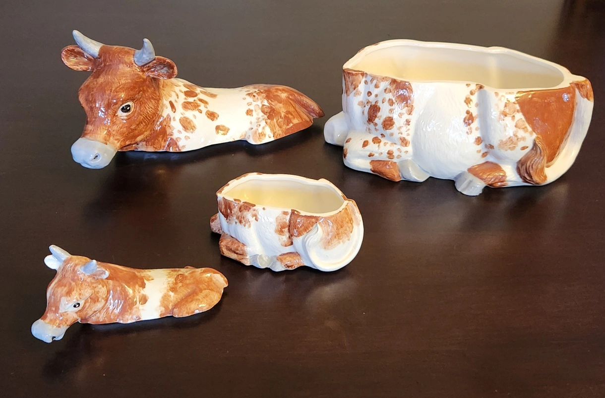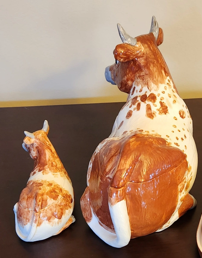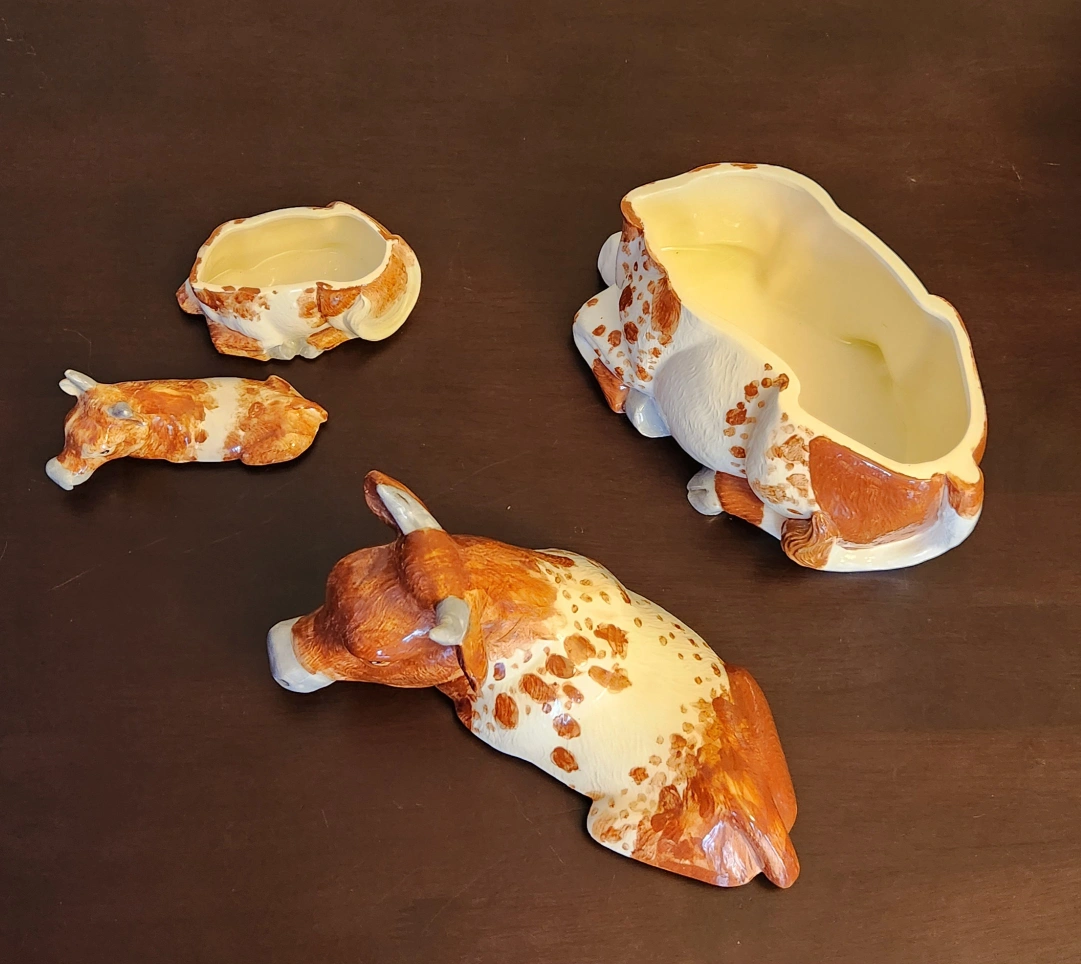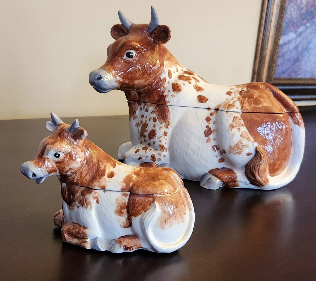 30Adorable vintage ceramic cow dish set. Features two charming cows, one larger and one smaller. Hand-painted details. Perfect for kitchen décor or storing treats.