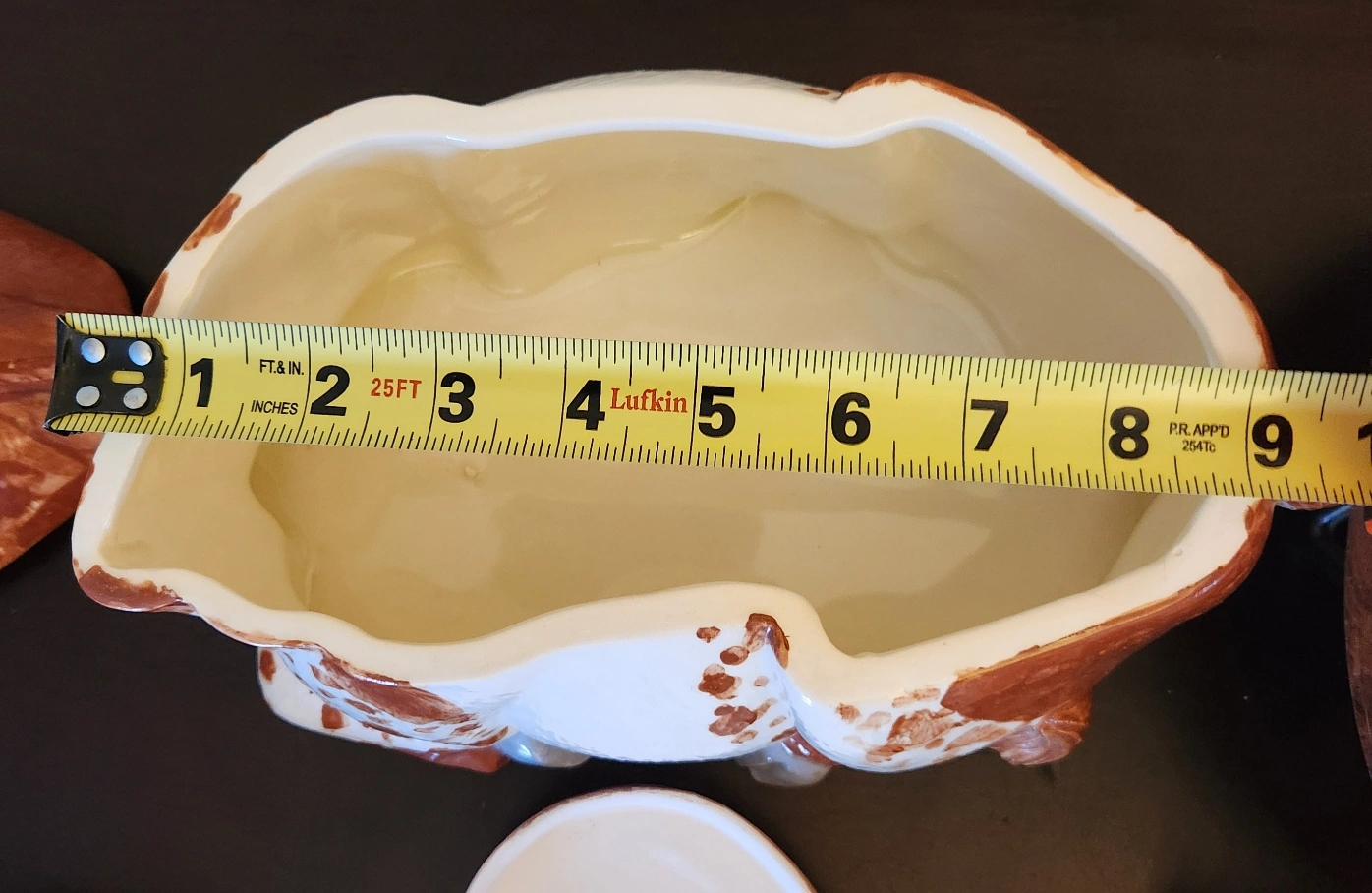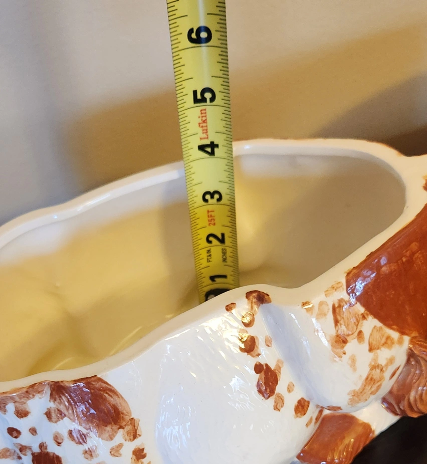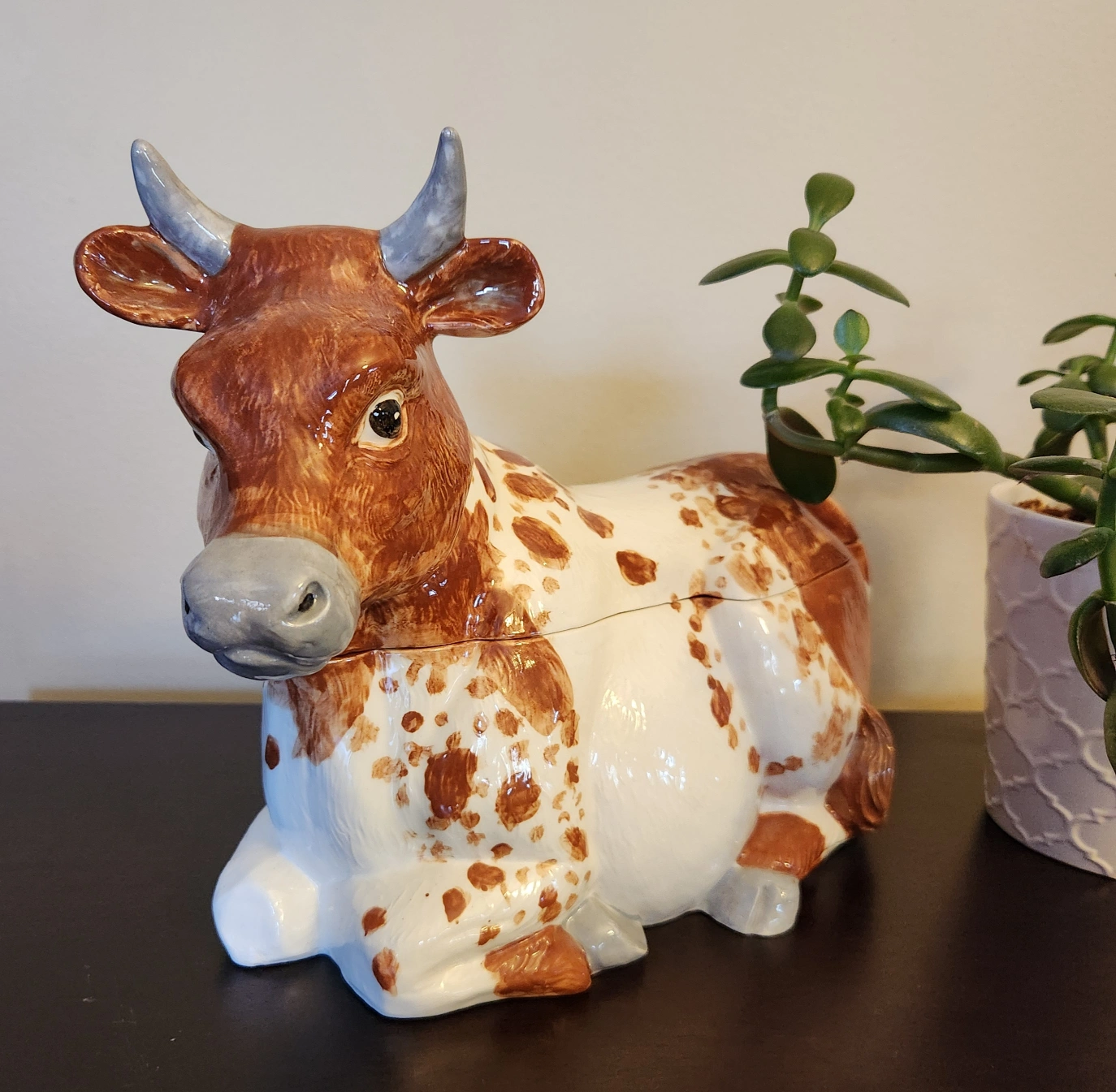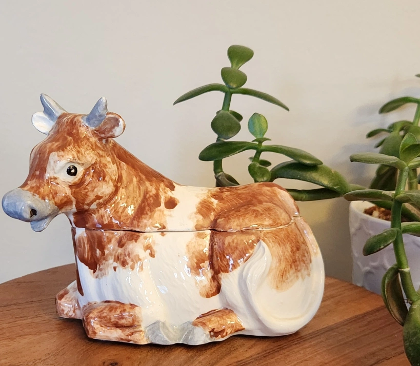 30Adorable vintage ceramic cow dish set. Features two charming cows, one larger and one smaller. Hand-painted details. Perfect for kitchen décor or storing treats.