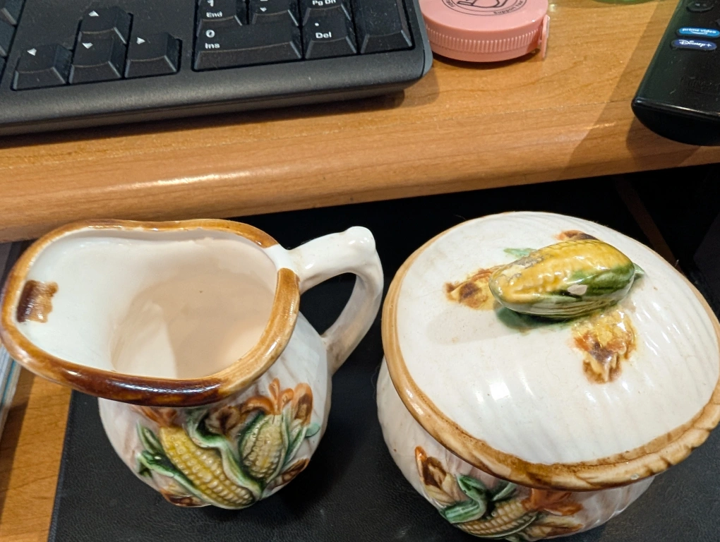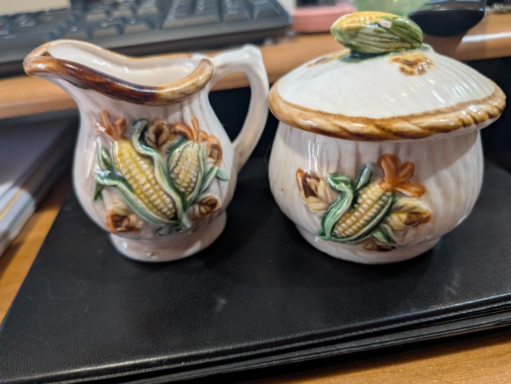 70Here's a charming vintage creamer and sugar bowl set! The set features a lovely corn design. It's perfect for adding a touch of retro flair to your kitchen or dining table. There is a marking on the bottom that says Japan.