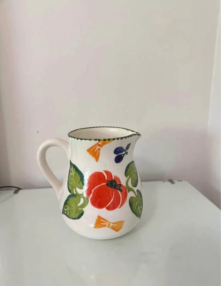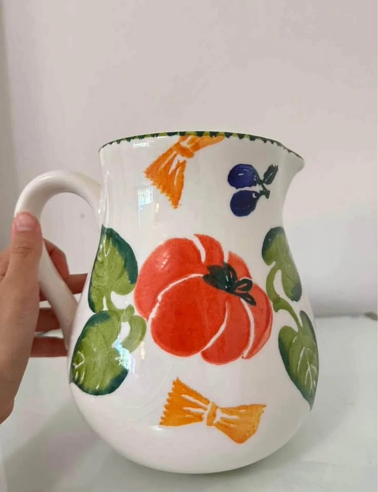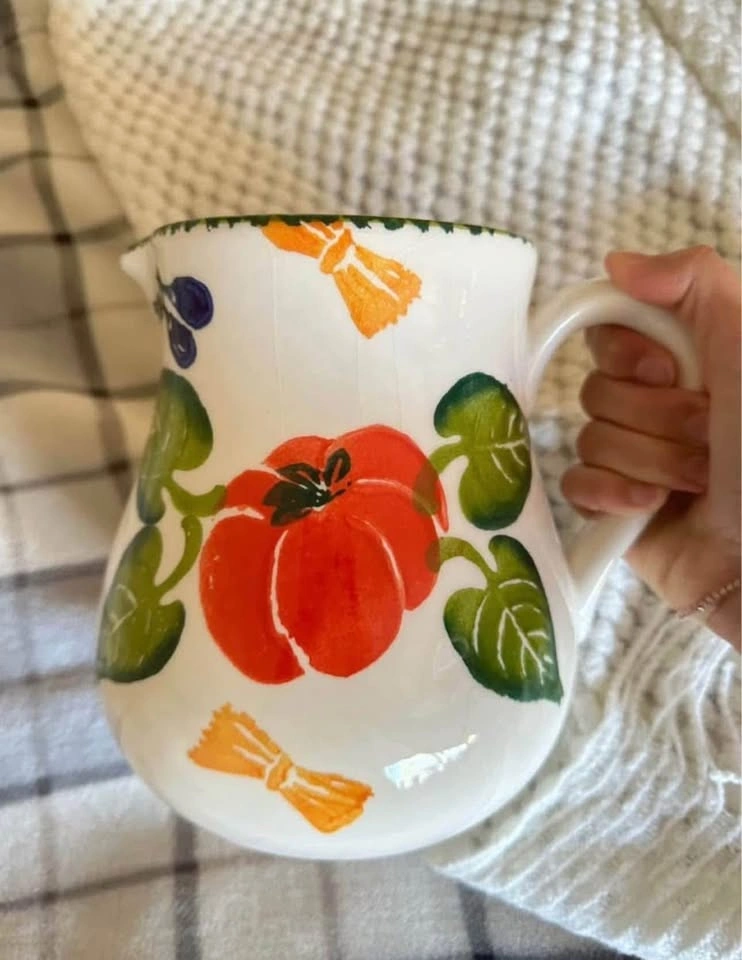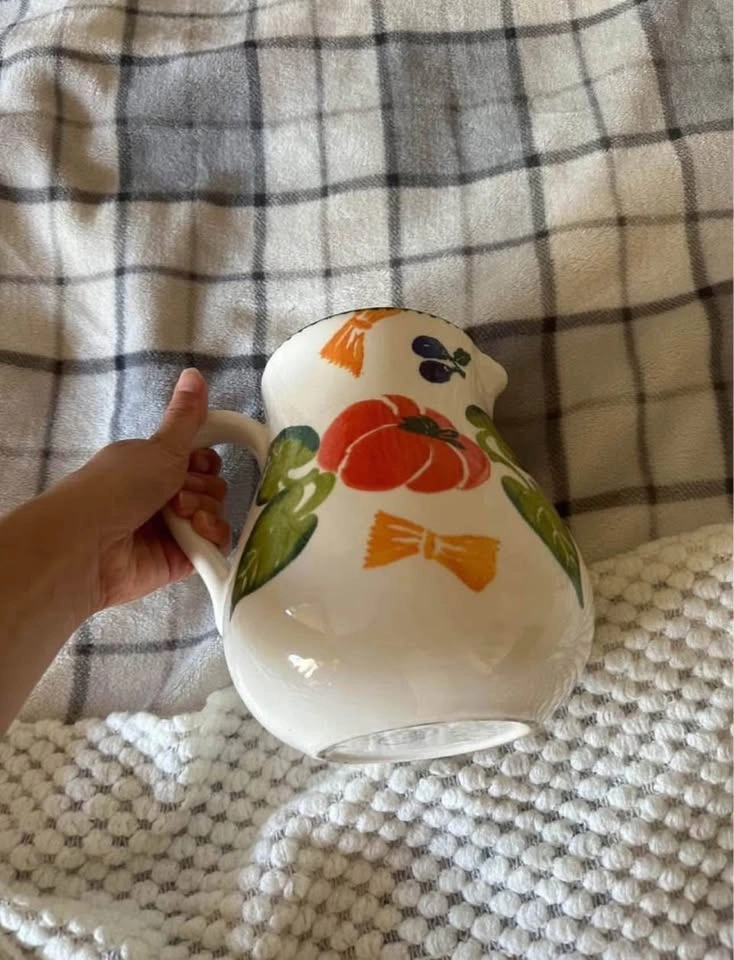 Colorful ceramic pitcher decorated with veggie motifs. Perfect for serving drinks, holding flowers, or as a kitchen decor piece. In excellent condition. Have other similar listings.
