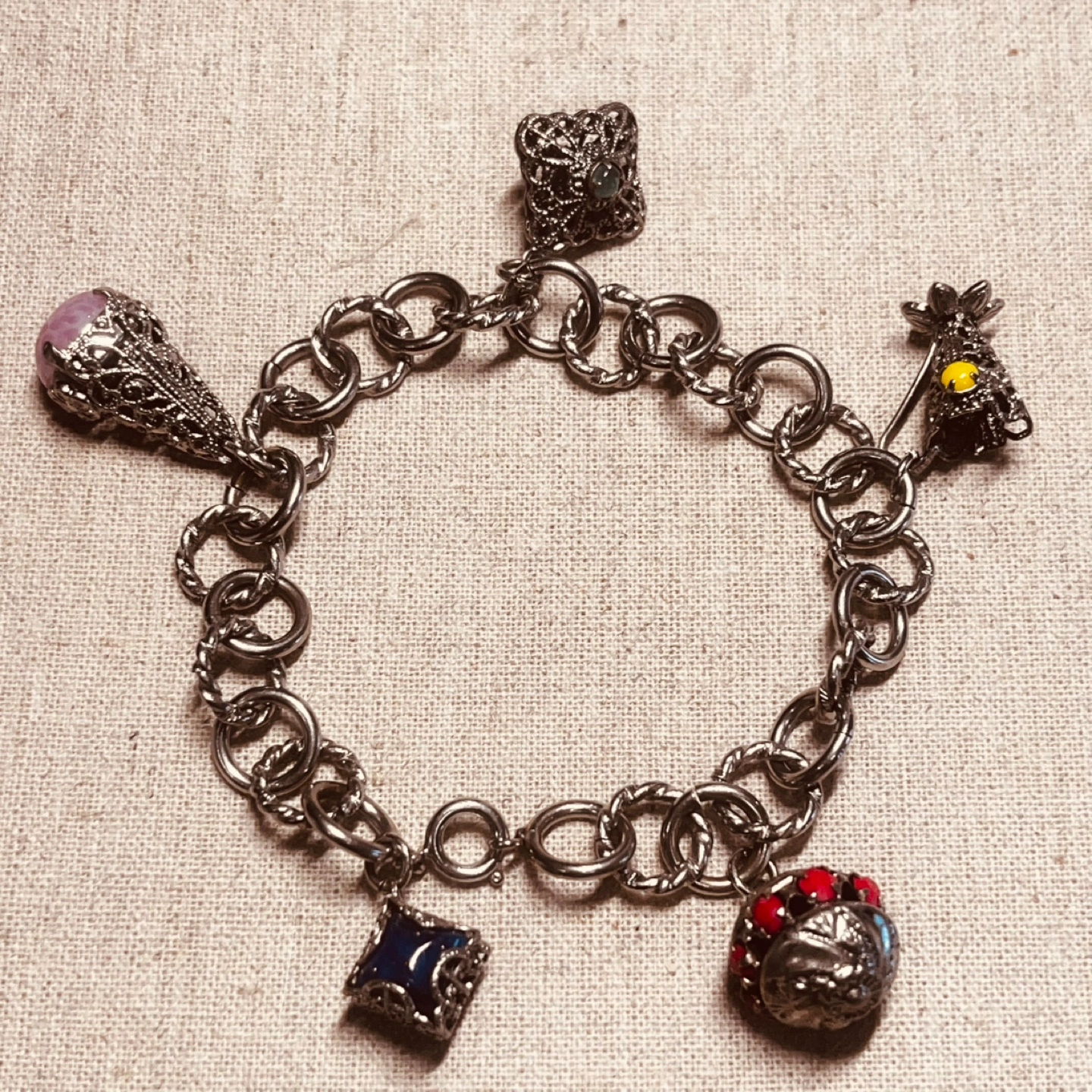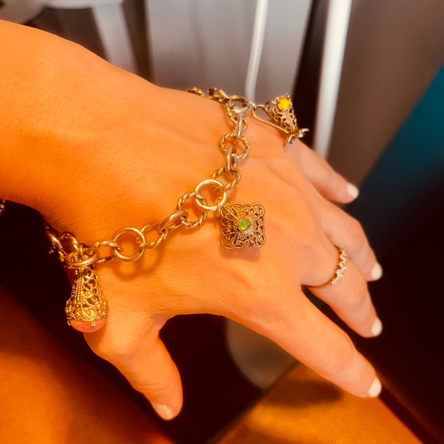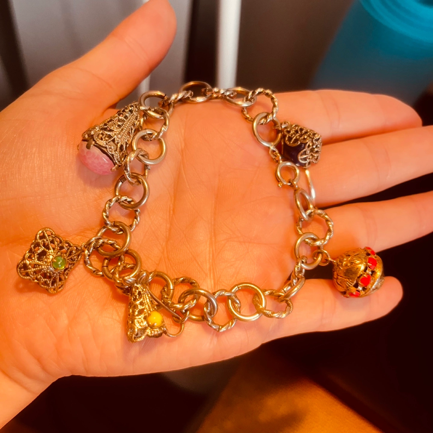 84Beautiful vintage charm bracelet. Features a gold-toned chain and several ornate charms. Some charms feature coloured stones. Unique and eye-catching piece.