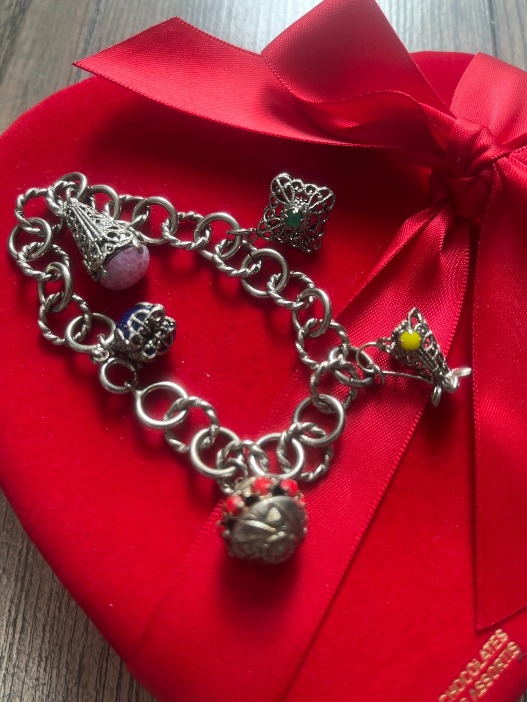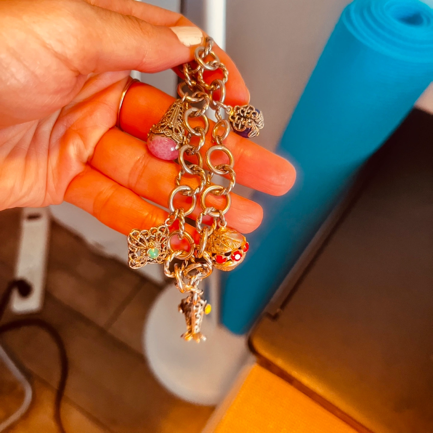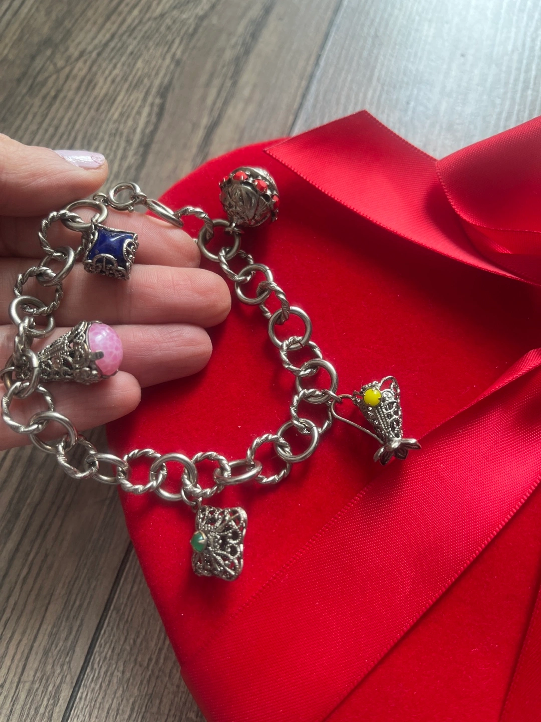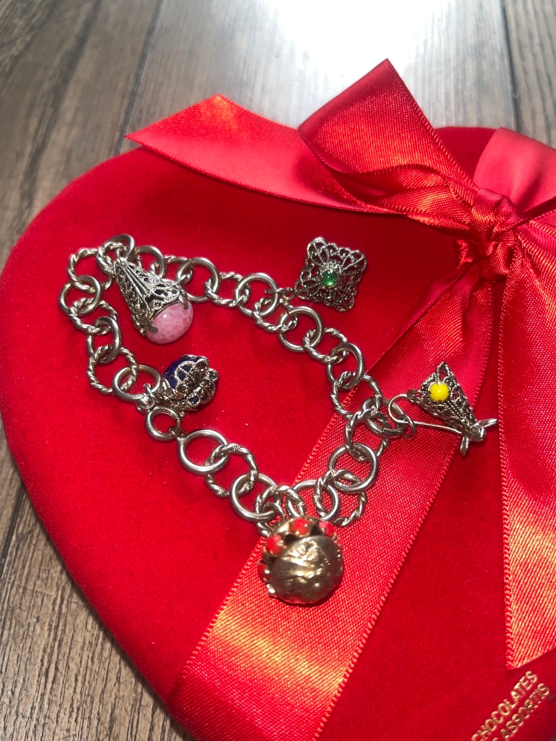 84Beautiful vintage charm bracelet. Features a gold-toned chain and several ornate charms. Some charms feature coloured stones. Unique and eye-catching piece.
