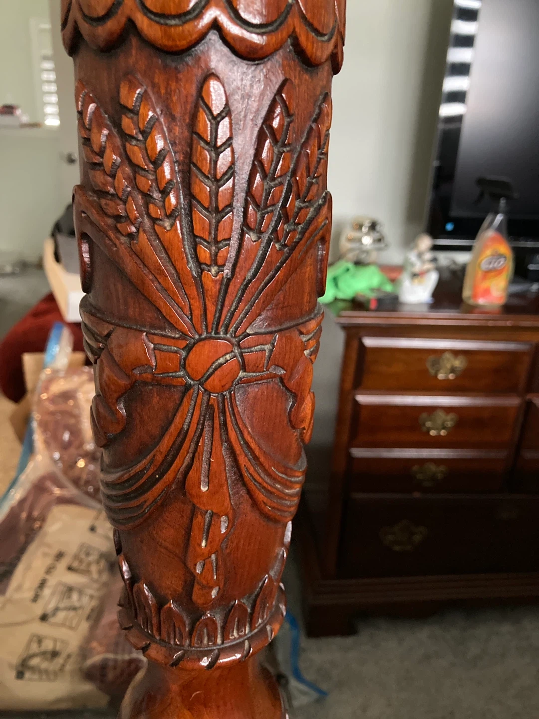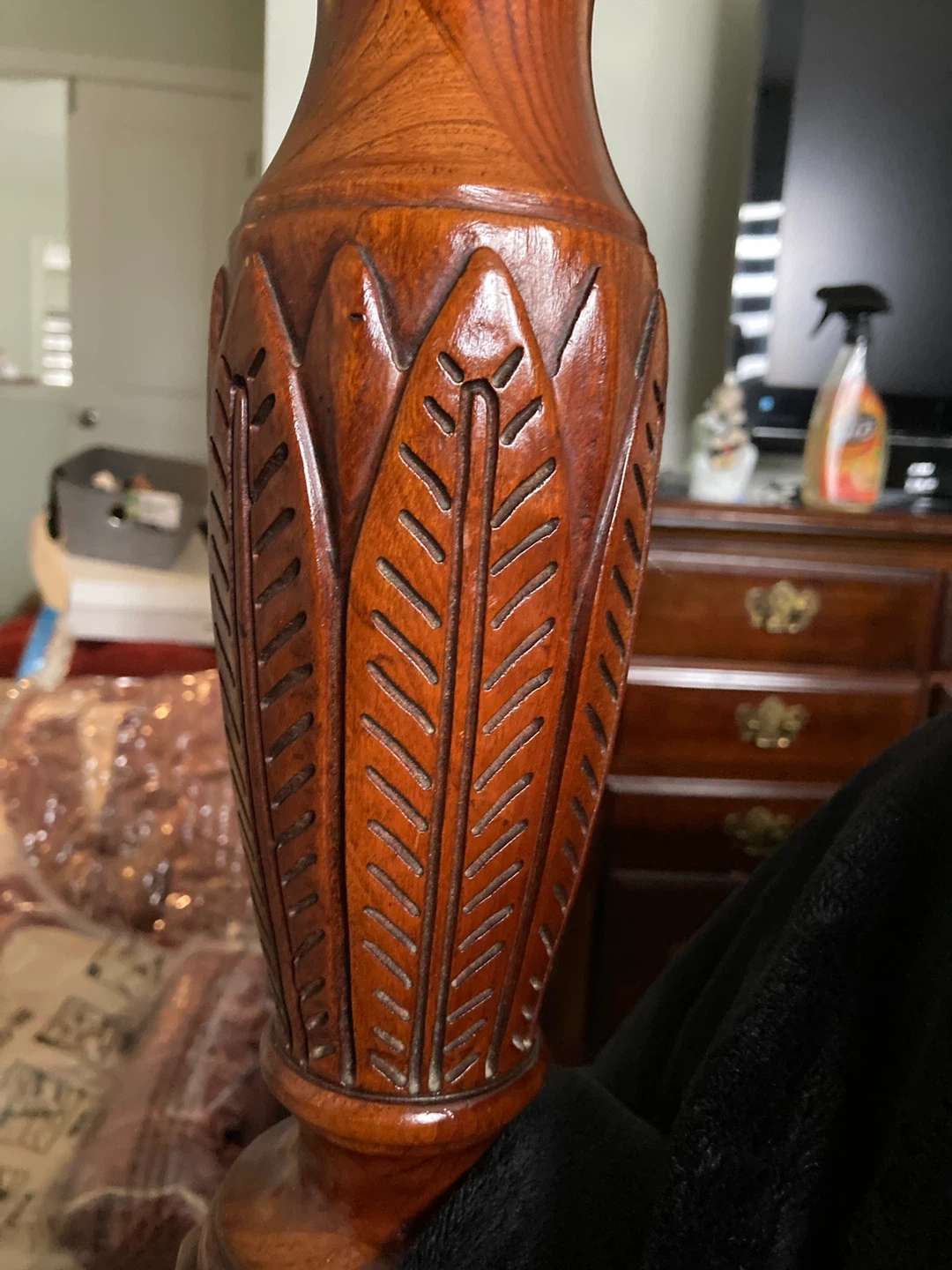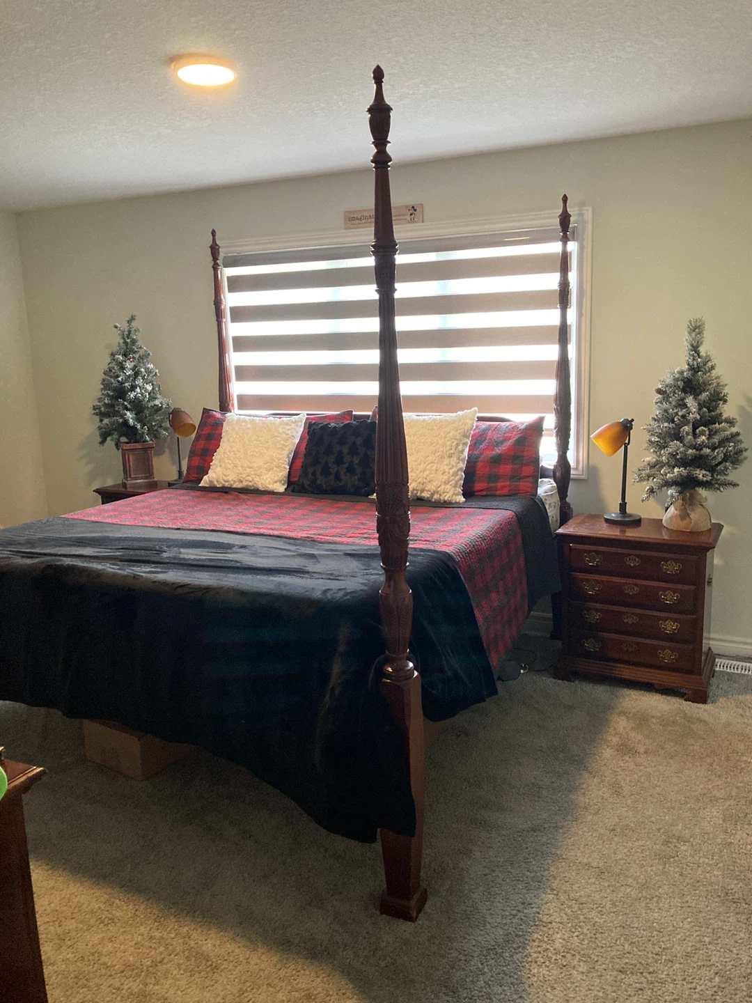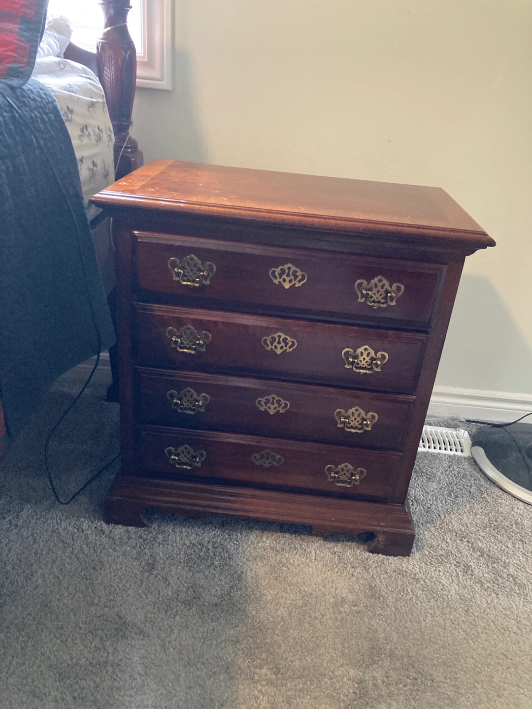 20🌸 Vintage Cherrywood Four-Poster Bedroom Set + California King Endy Mattress 🌸 $690 OBO — Pickup in London, ON Selling my beautiful vintage cherrywood four-poster bed frame, matching dresser, and two nightstands, plus a California King Endy foam mattress and box spring. The pictures make the wood look a bit more brown, but it’s actually a rich cherry tone with gorgeous carved details. This set has been in my family for decades — it’s full of character and still very solid and functional — but it does show some age as shown in pics • Normal wear and tear such as scratches and finish fading • Two dresser drawers need the bottom rail repaired (they still slide, just open carefully) • One nightstand has a missing handle on the bottom drawer Despite that, it’s a classic, beautiful set that would add warmth and elegance to any bedroom! I had plans to refinish it in black with new hardware for a dramatic look, but I’m moving into a one-bedroom apartment and the king-size set just won’t fit. 🛏 Includes: • California King Endy foam mattress (bought a year ago — no stains, still like new, removable washable cover) • Box spring • Optional: matching comforter, shams, curtains, and decorative pillow that complement the cherrywood perfectly it’s not the set that’s on these pics. if you’d like pics let me know it wouldn’t let me post more pics. 📏 Measurements: • Bed frame: 86” high × 89” long × 85” wide • Dresser: 19” deep × 34” high × 66” long • Nightstands: 15” deep × 26” long × 28” high Armoire - 18 deep X 38” wide X 82” high 🚚 Pickup Details: You’ll need to bring a couple of people to help move it — the bed comes apart easily. I’d help if I could, but I don’t want to risk breaking a hip in the process 😅 🏡 Smoke-free, pet-free home 💰 $690 OBO for everything — a great deal considering the Endy mattress alone cost me more than that a year ago!