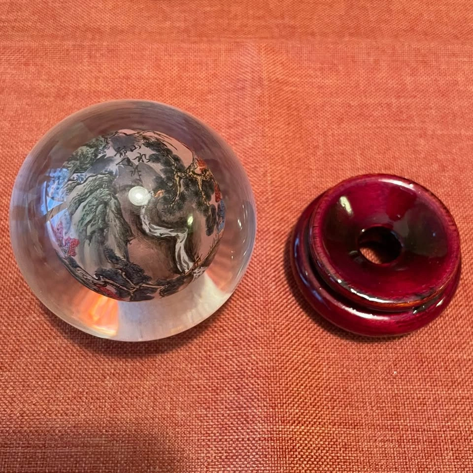 📍Pick up at Don Mils & Steeles Vintage Chinese Reverse-Painted Art Glass Globe This mini hand-painted glass globe features a beautiful traditional Chinese landscape (shanshui) scene. Includes a carved wooden stand. Condition: Good vintage condition. The box has some yellow spots from age. Pls see photos for details Perfect as a decorative collectible or display piece.