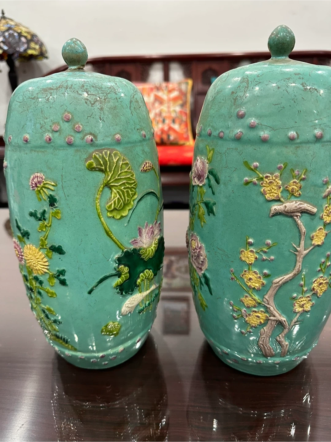 10Selling a pair of vintage turquoise ceramic vases. They feature a beautiful floral design. Perfect for adding a touch of elegance to any room!