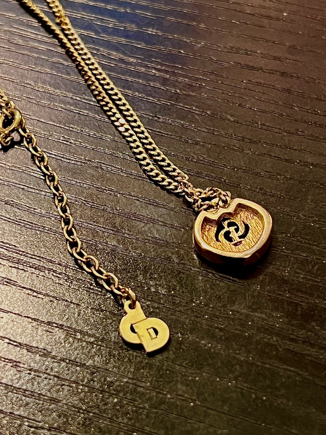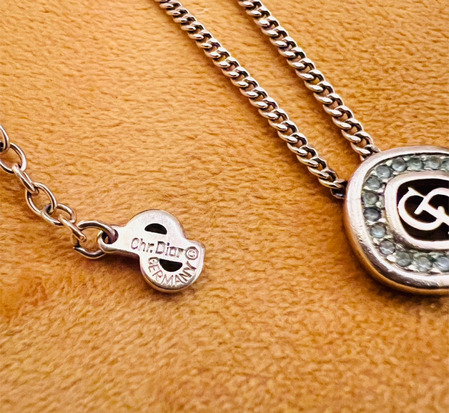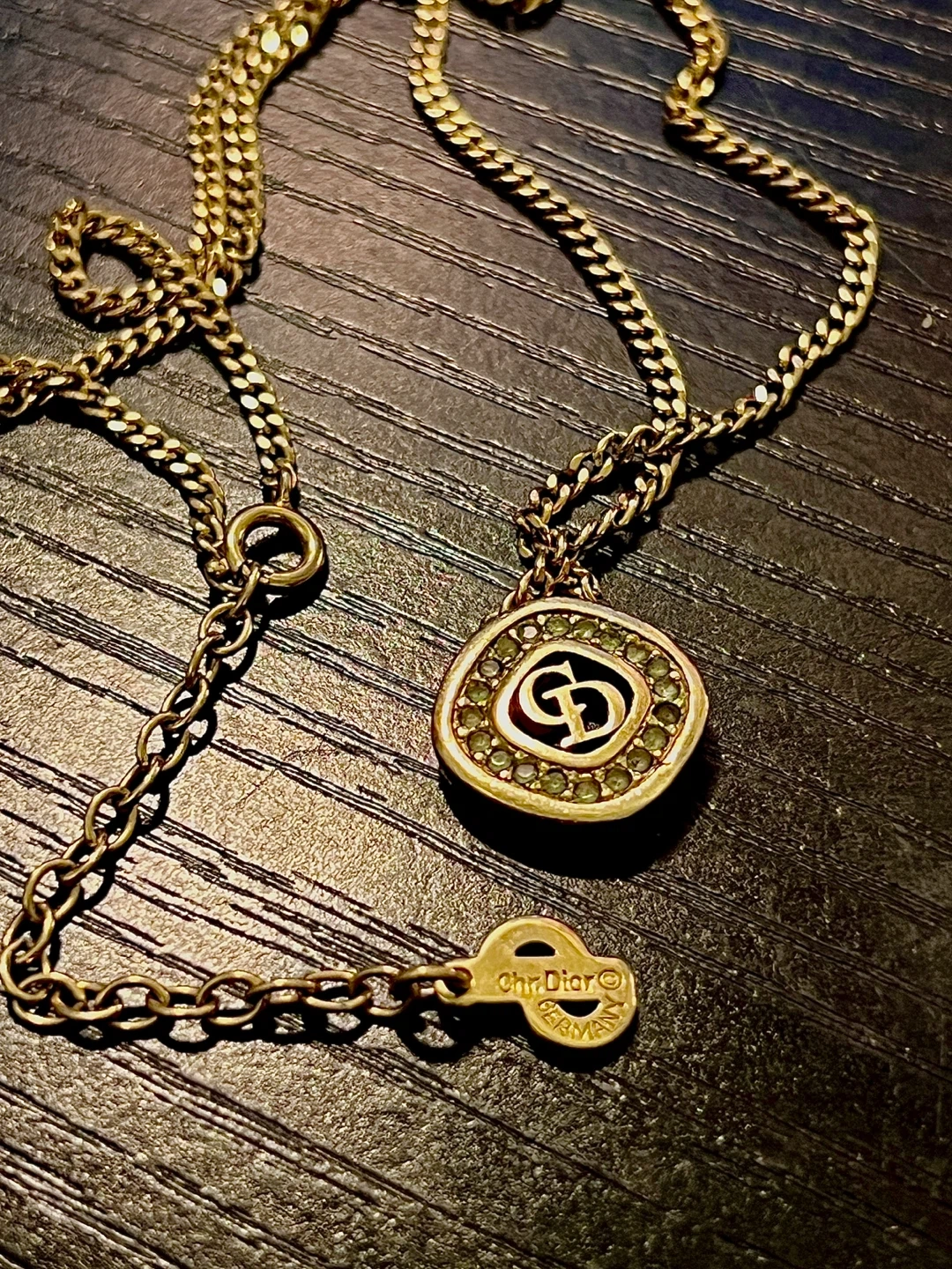 65Selling a beautiful Dior necklace in gold tone (see image with black background). The pendant features the iconic CD logo surrounded by small stones. It's a stylish piece to add to any outfit! Size is 15- 17 inches. Adjustable from the hook. Make in Germany Purchases from a certify vintage shop in Hong Kong, but receipts is gone at $480+ tax Barely any scratches and all the gems are still in place.