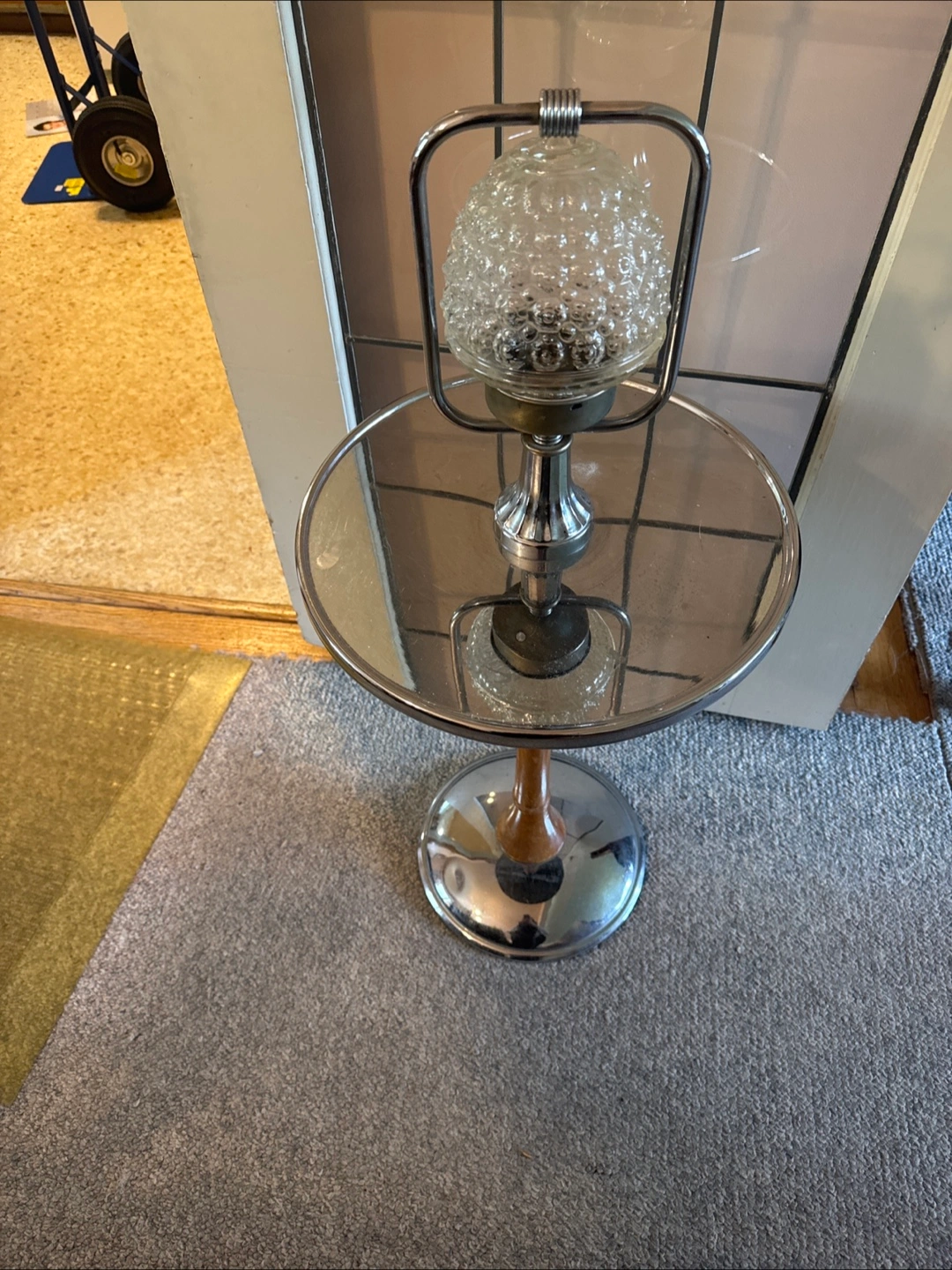 15This rare and stylish vintage side table features a built-in bubble glass lamp and sleek chrome detailing—straight out of the space age era! A perfect accent piece for mid-century modern interiors, lofts, studios, or collectors of retro decor. • Authentic mid-century look from the 1960s–1970s • Built-in glass globe lamp with raised bubble texture • Chrome base and column with mirror-glass tabletop • Cast metal base—very sturdy and stable • Excellent condition for its age (light patina adds to charm) • Works great! Unique and eye-catching—ideal for a reading corner, entryway, or lounge space. Pickup only. Message to claim or ask questions