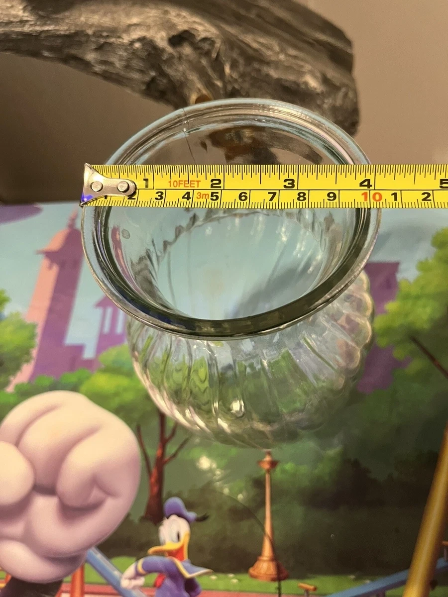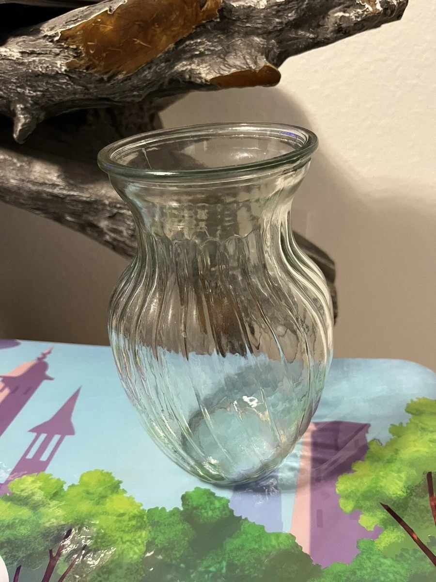 Selling a clear glass vase. It's about 9 inches tall and the top opening is approximately 4 inches in diameter. Perfect for displaying flowers or as a decorative piece!