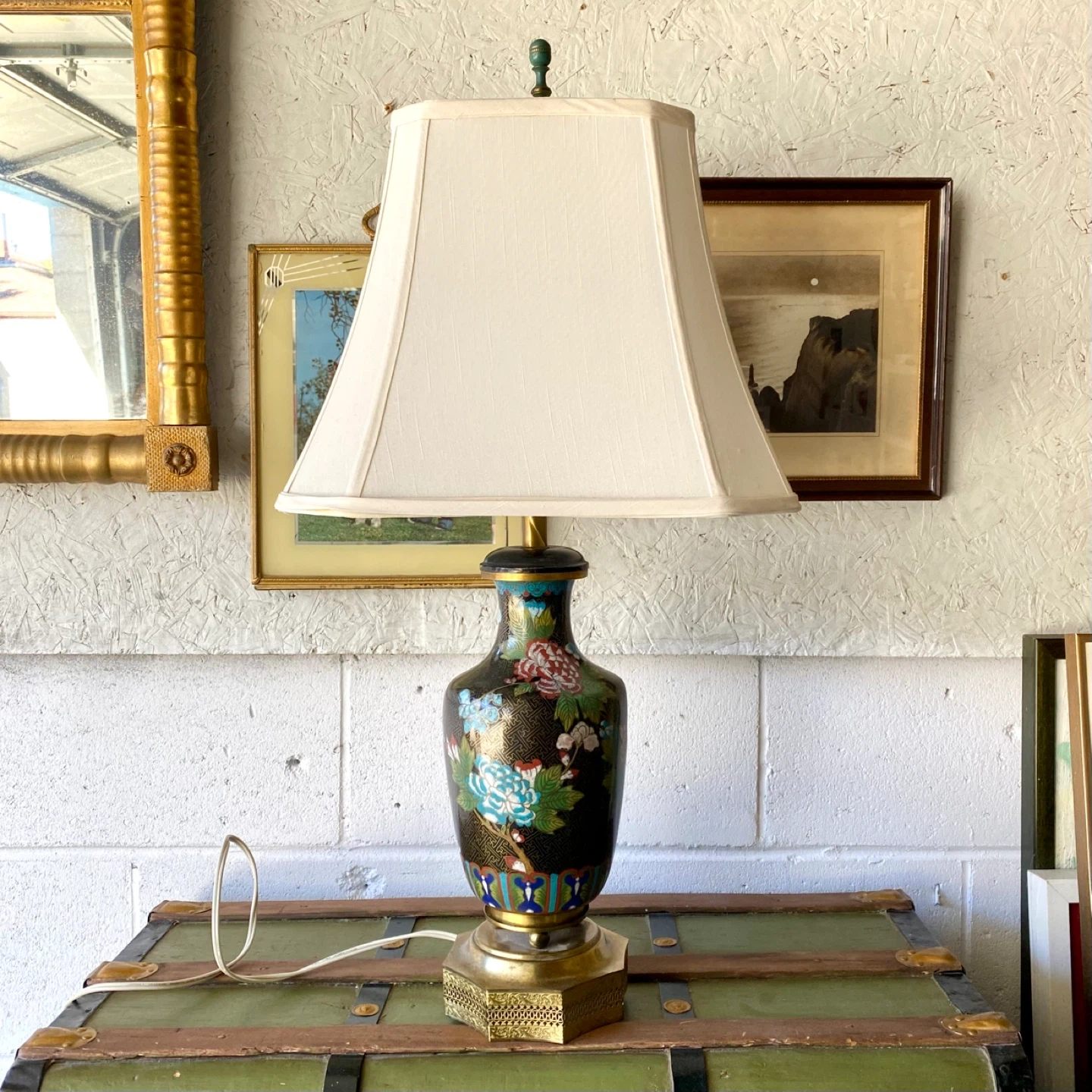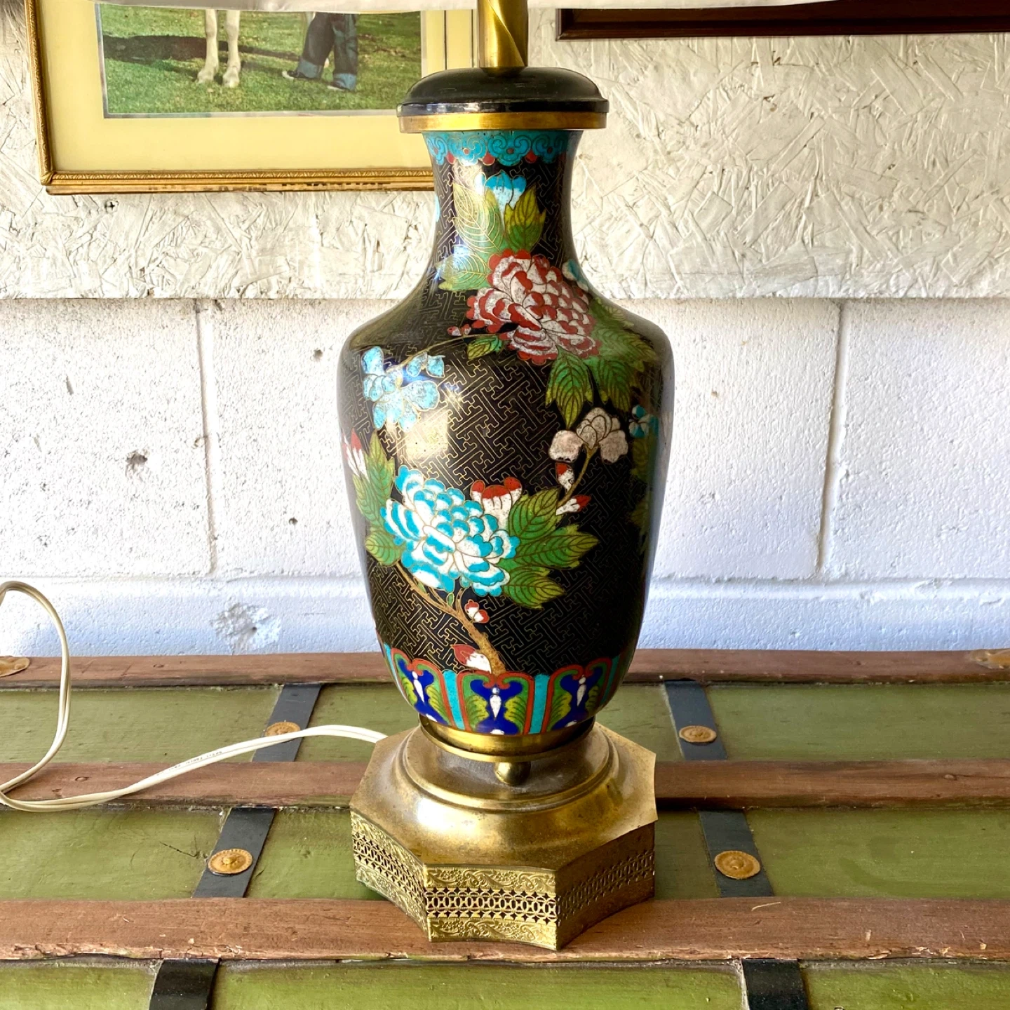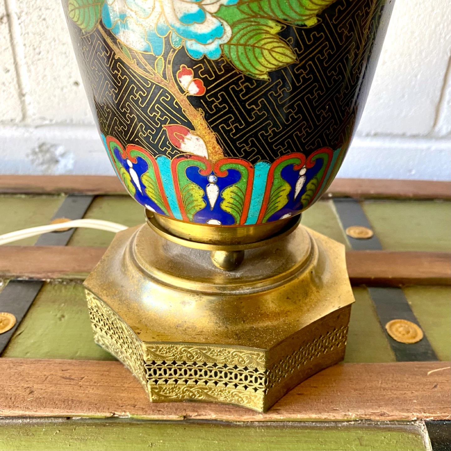 Working vintage cloisonné enamel table lamp with octagonal shade and brass base. ~27”h 💥$120 ✅ Yes, it is available 📍 Pick up near Bloor & Ossington 🚘 Downtown delivery extra