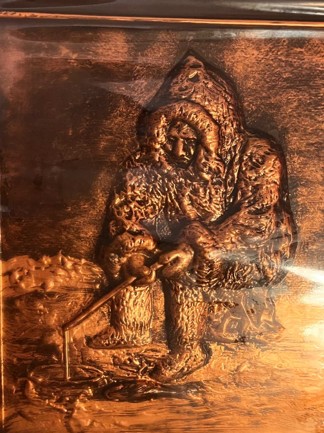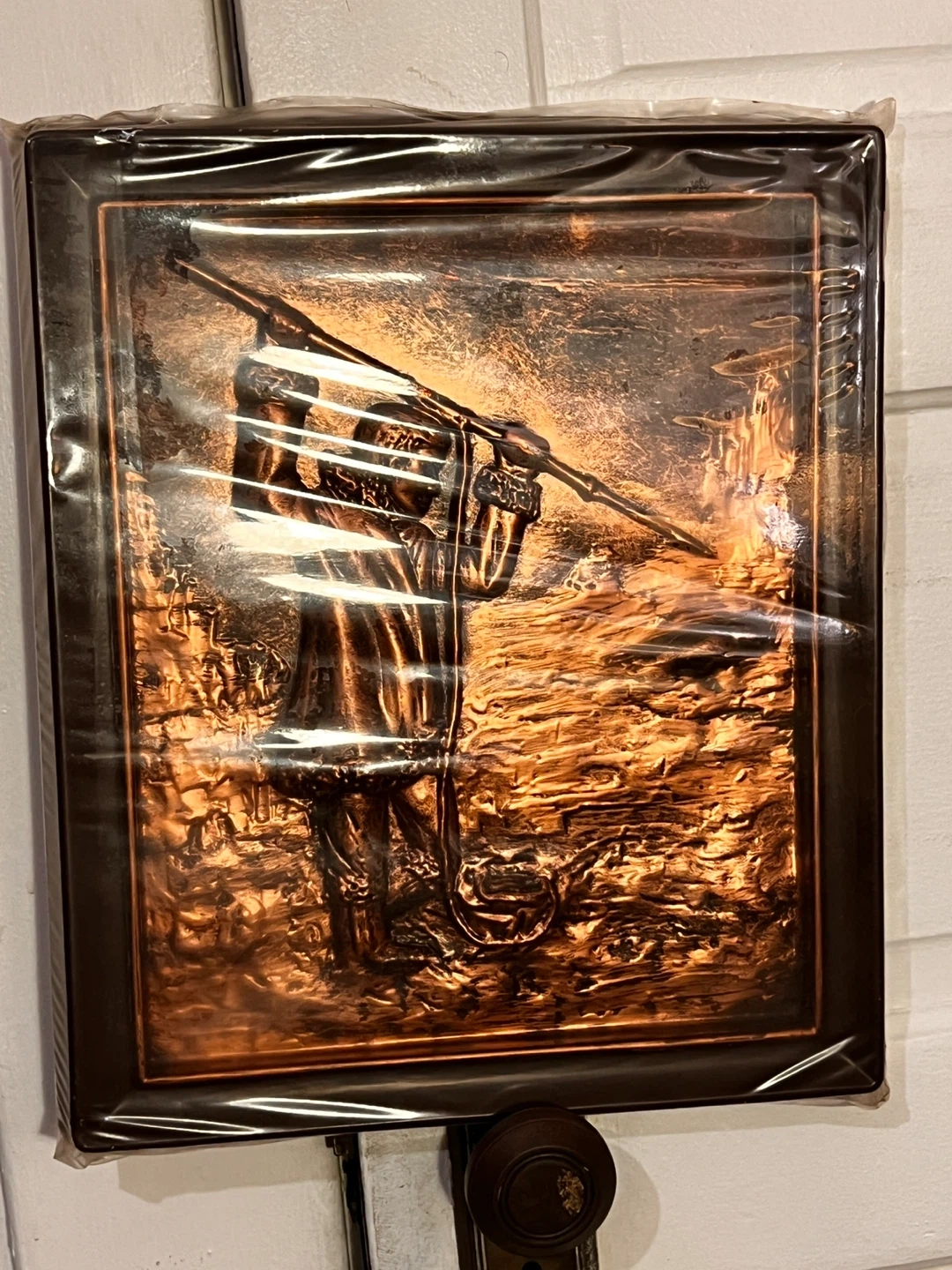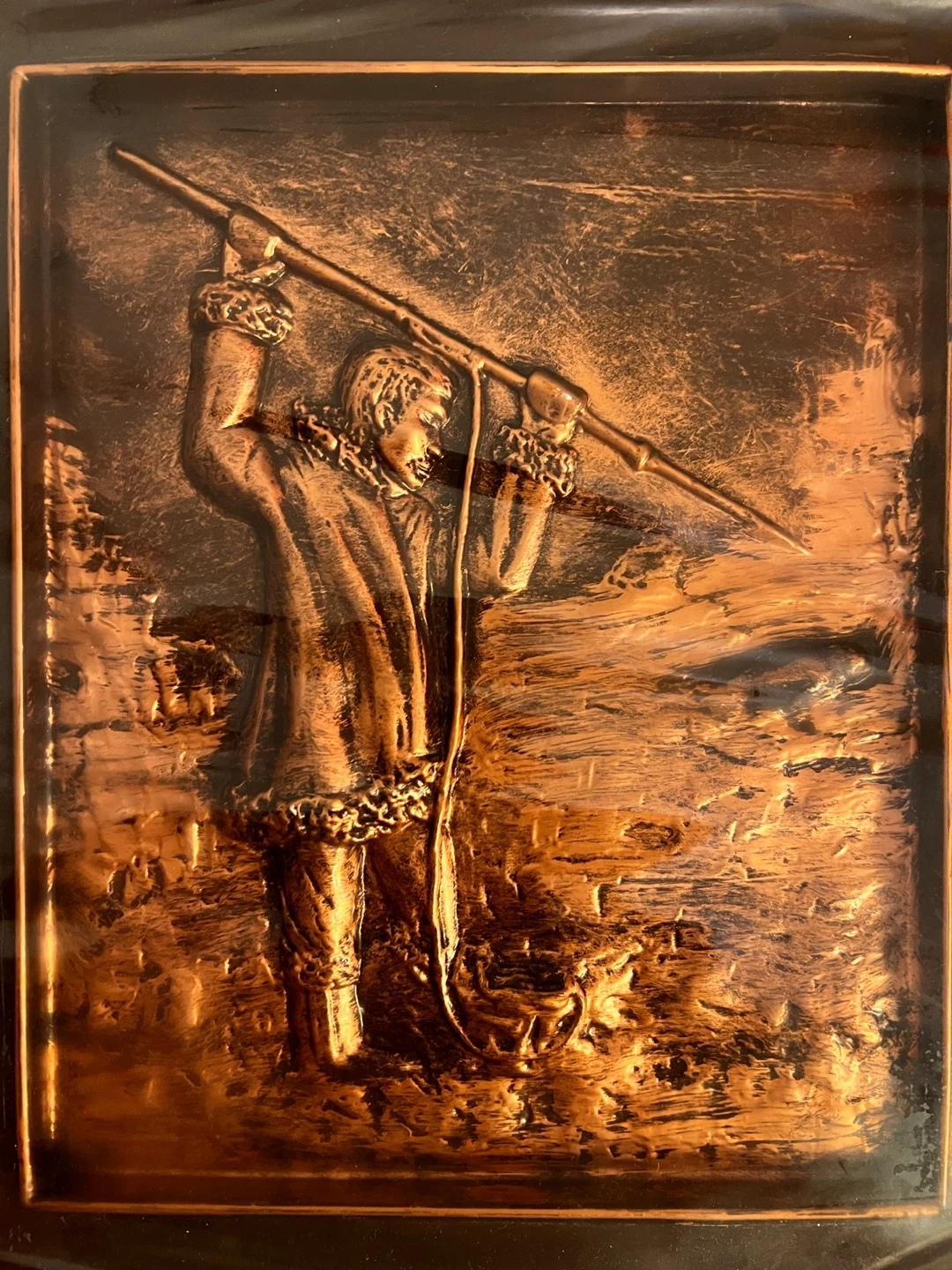 65Selling two vintage copper art pieces depicting an Inuit fisherman. It's a unique and detailed piece. The artwork is framed and in good condition.