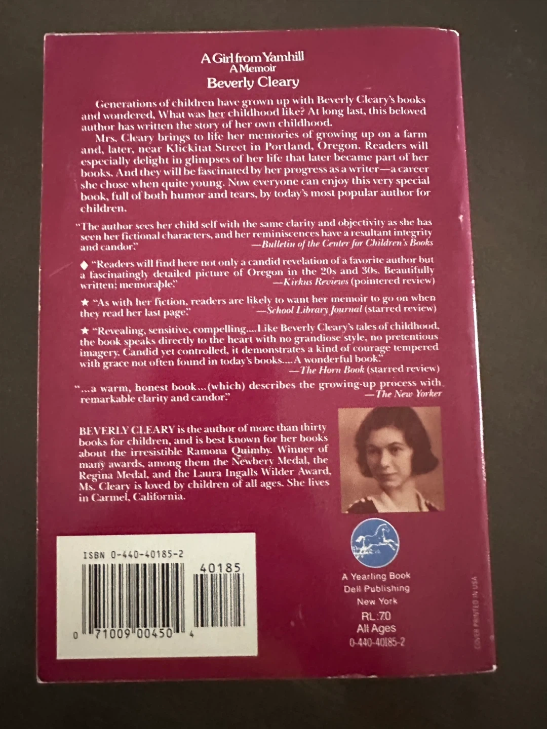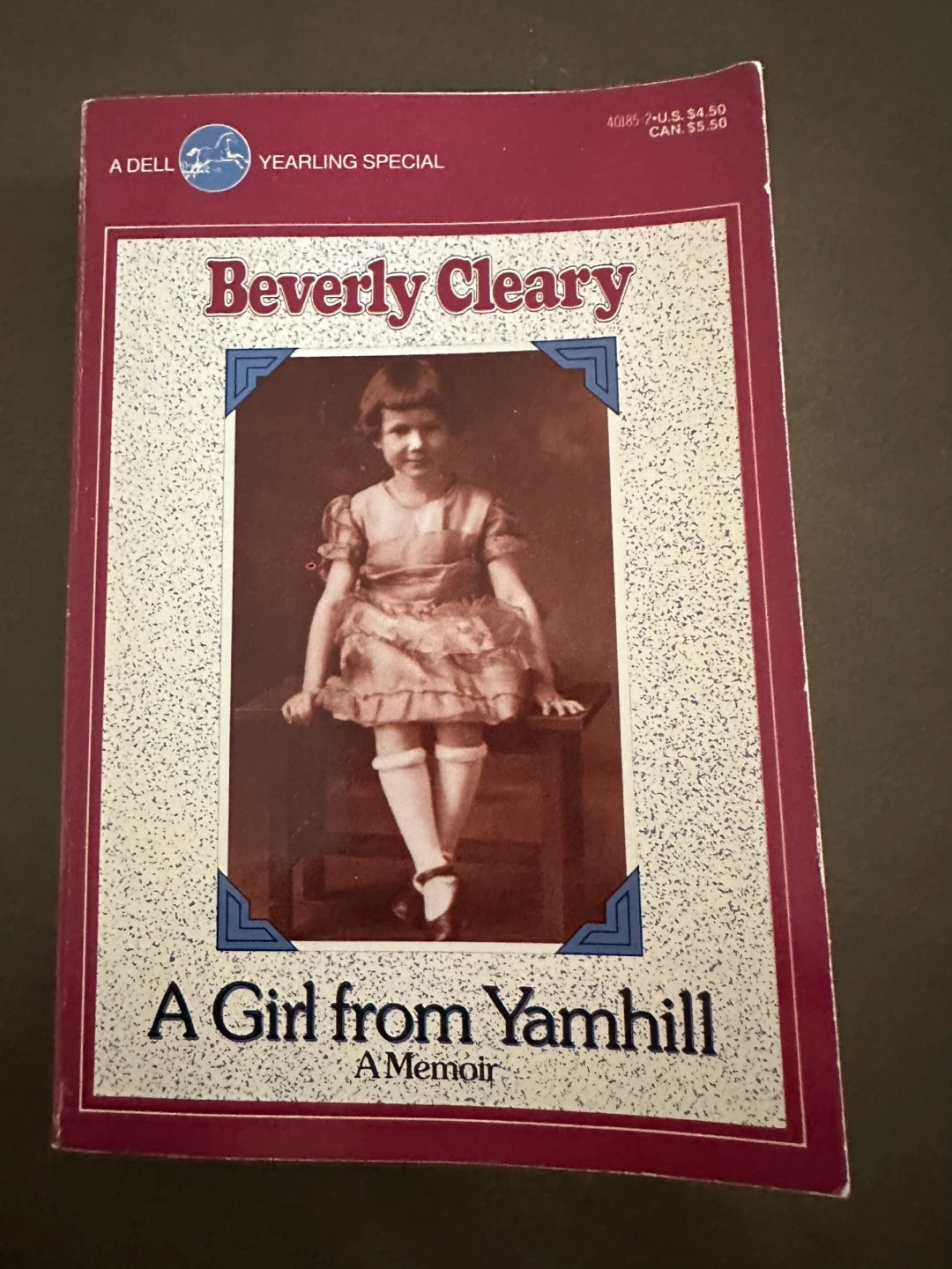 41Selling a vintage copy of "A Girl From Yamhill: A Memoir" by Beverly Cleary (printed in 1989). This book tells the story of Beverly Cleary's childhood and life growing up on a farm near Klikitat Street in Portland, Oregon. It's a fascinating read for anyone who has enjoyed her children's books!