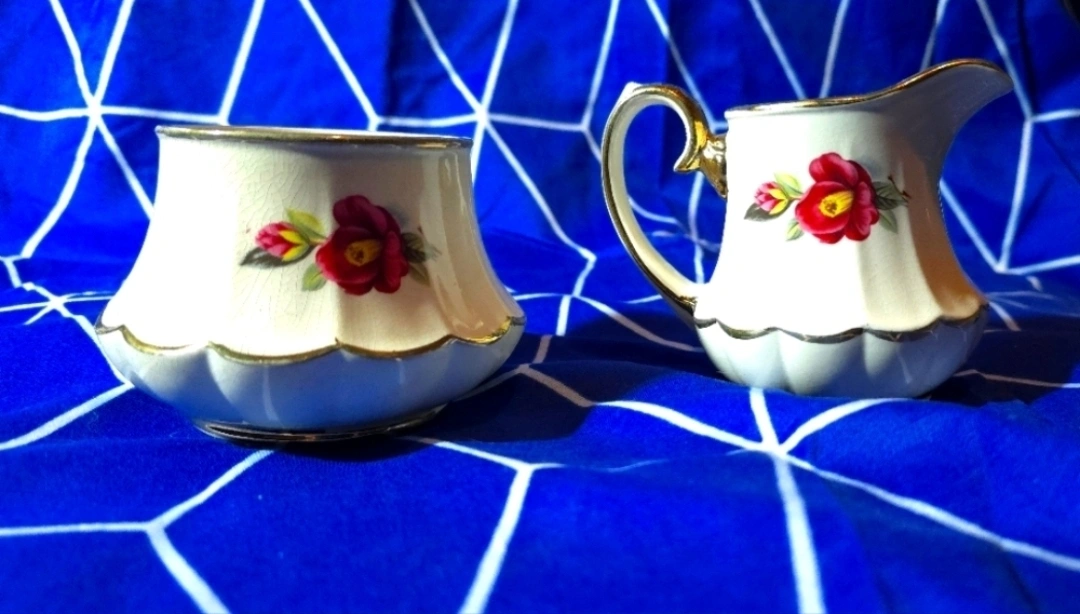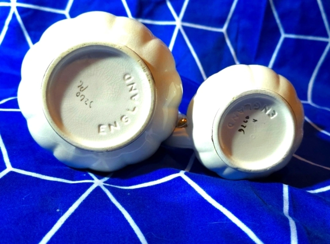 5Selling a lovely vintage creamer and sugar bowl set, made in England. These pieces are in great condition and would add a touch of elegance to any table setting. Perfect for tea parties or everyday use!