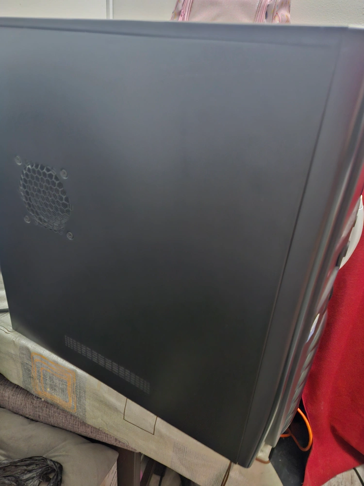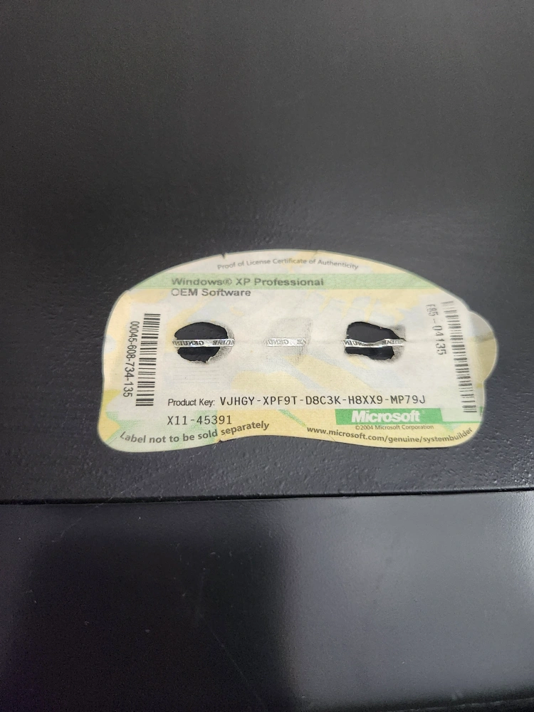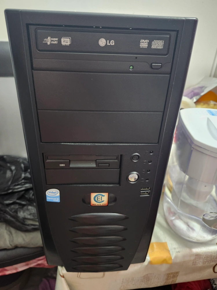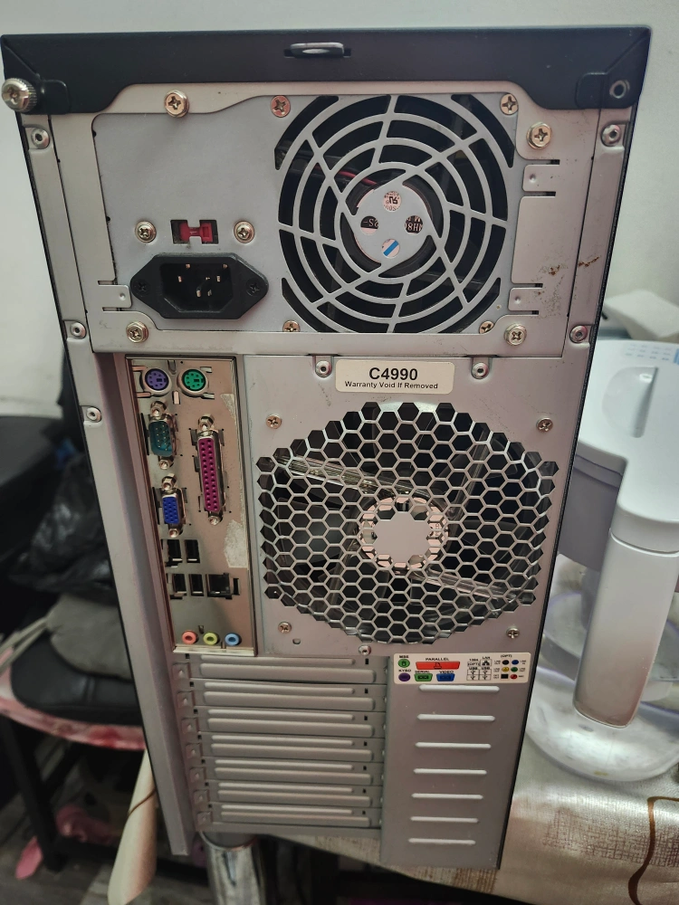 Selling a vintage custom built PC. It has an LG Super Multi DVD Rewriter and an Intel sticker. The back shows various ports and connections. It also has a Windows XP Professional OEM software sticker.