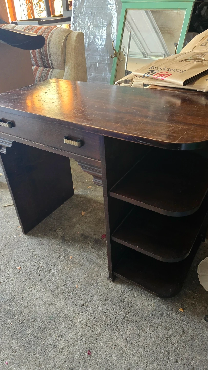 59Selling a vintage desk with a dark wood finish. It features a drawer and open shelving on one side. It has some signs of use, but it's still a functional and stylish piece for your home office or study area