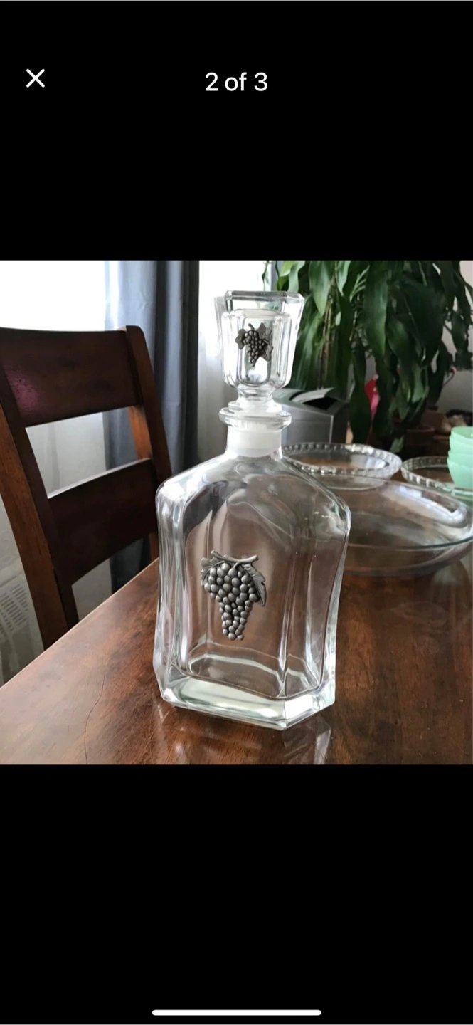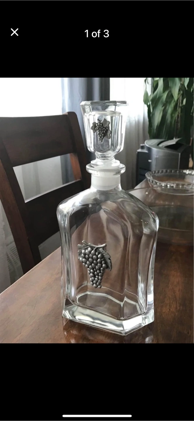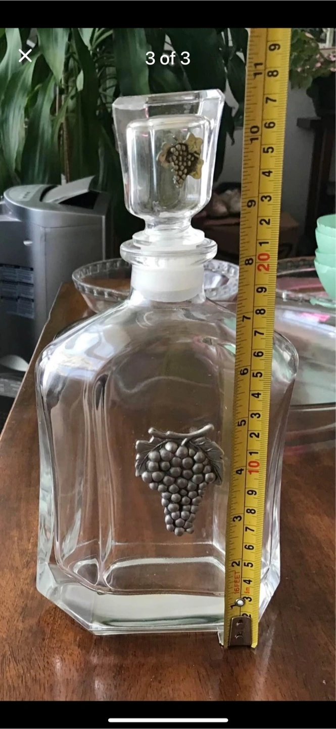 A beautiful vintage decanter. Clear glass with a decorative grape cluster on the front. Features a square top and a matching stopper. It can be displayed on a bar or buffet to store your favourite libations.