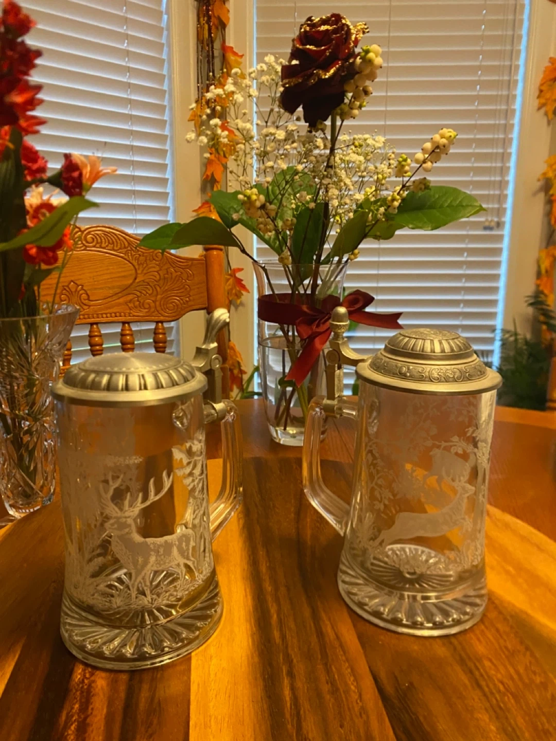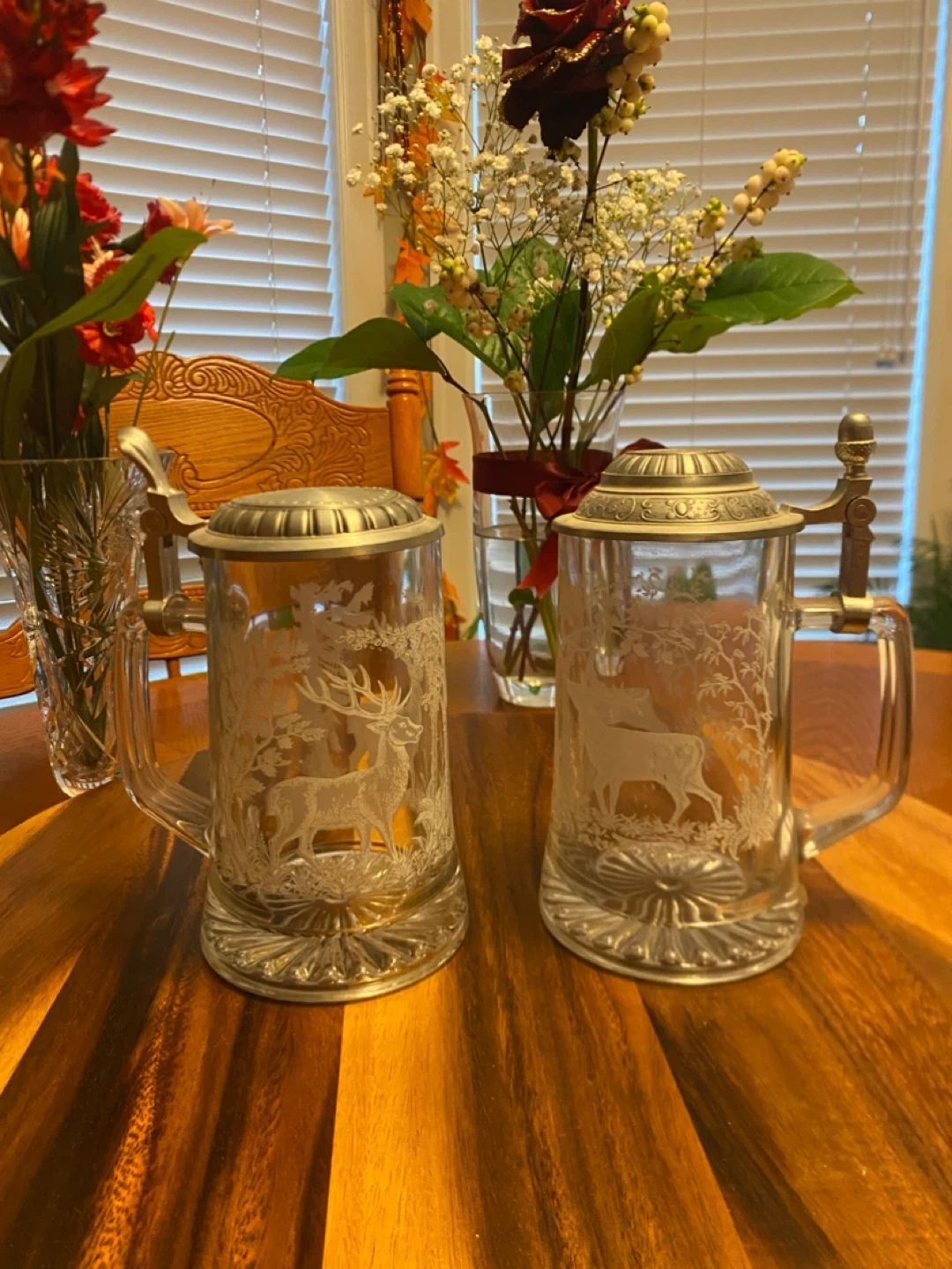 Selling a pair of vintage beautiful glass beer steins. They feature a lovely etched deer design and metal lids. Perfect for adding a touch of rustic charm to your home bar or collection!