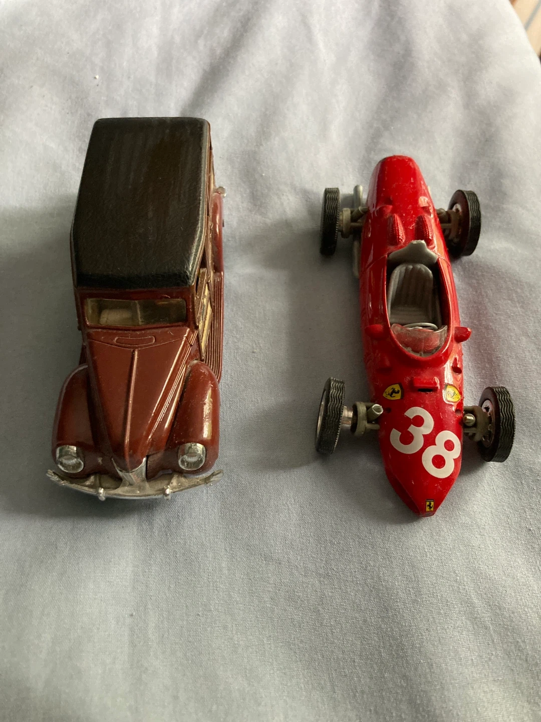 933Selling two vintage diecast toy cars. One is a brown woody-style car, and the other is a red race car with the number 38 on it. Both are in excellent condition. $5 each.