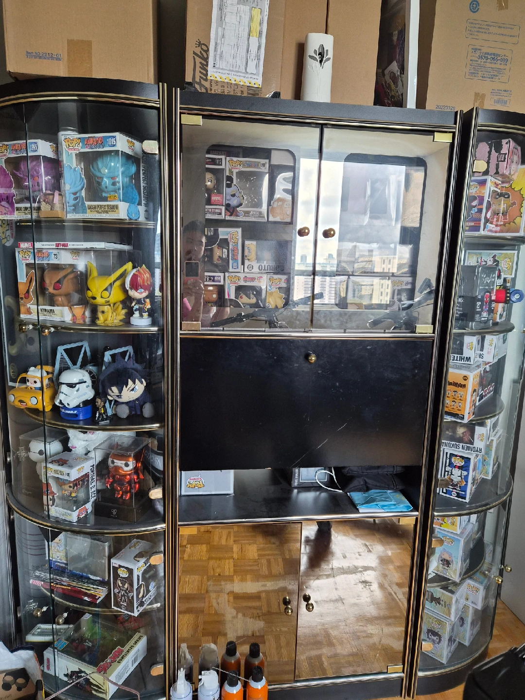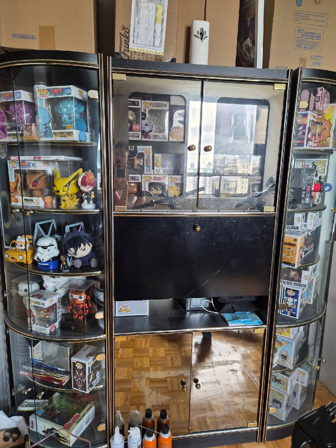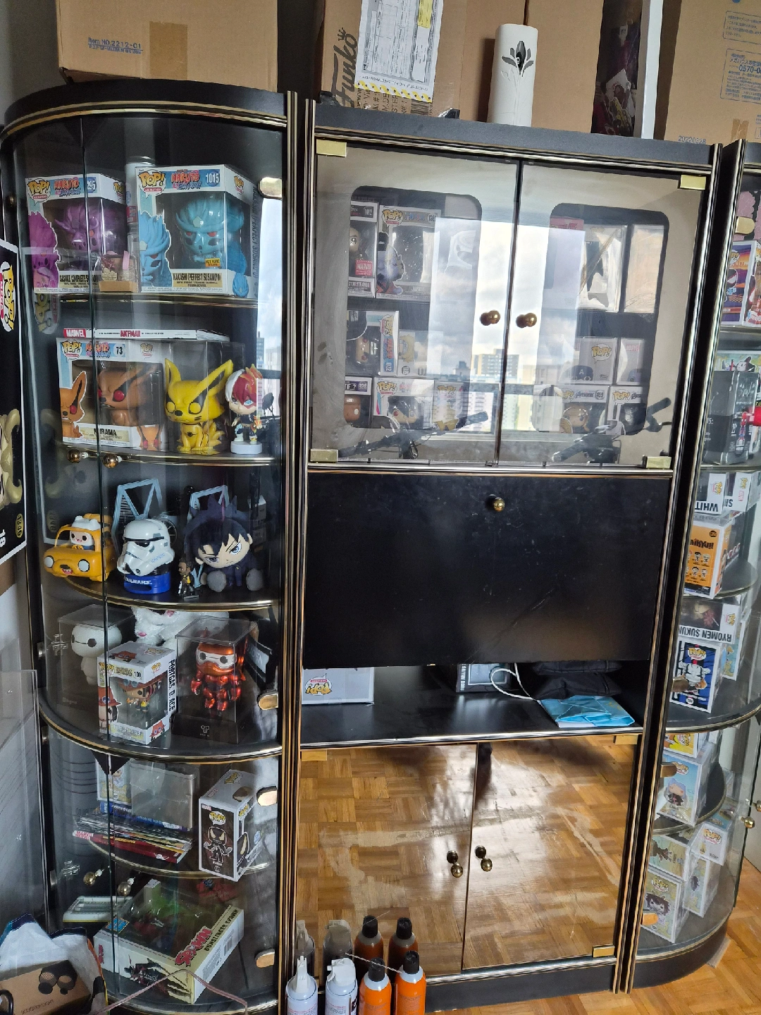 78Selling a vintage display cabinet with glass doors! It's perfect for showcasing your favourite collectibles or adding a touch of retro charm to your space. The cabinet features a unique design with gold trim and a mix of glass and wood finishes. It has multiple shelves for ample storage and display options. A great piece to add character to any room!