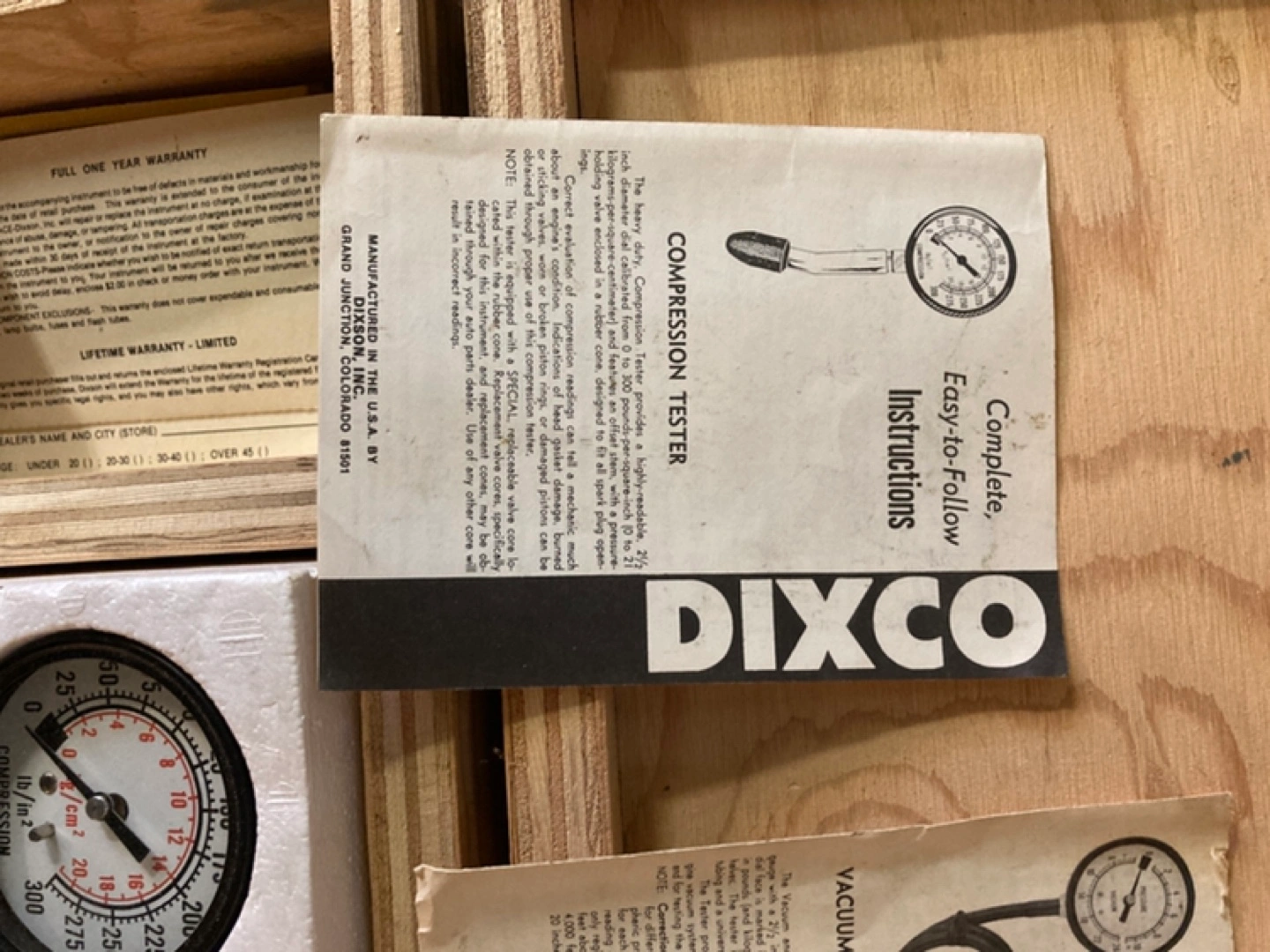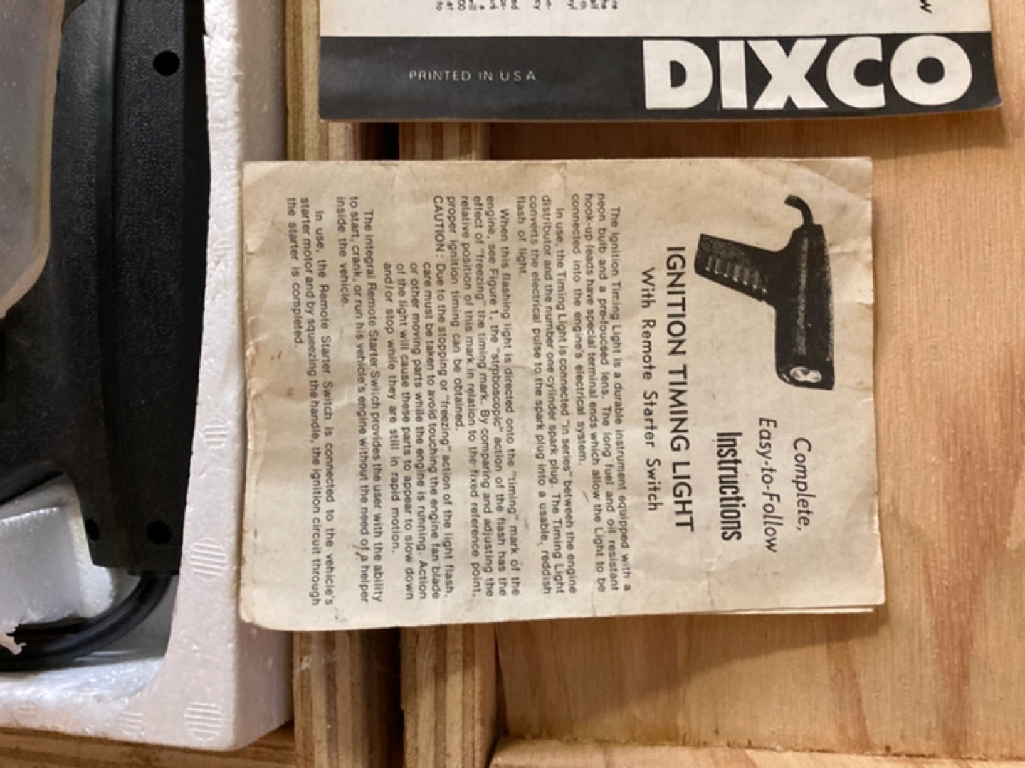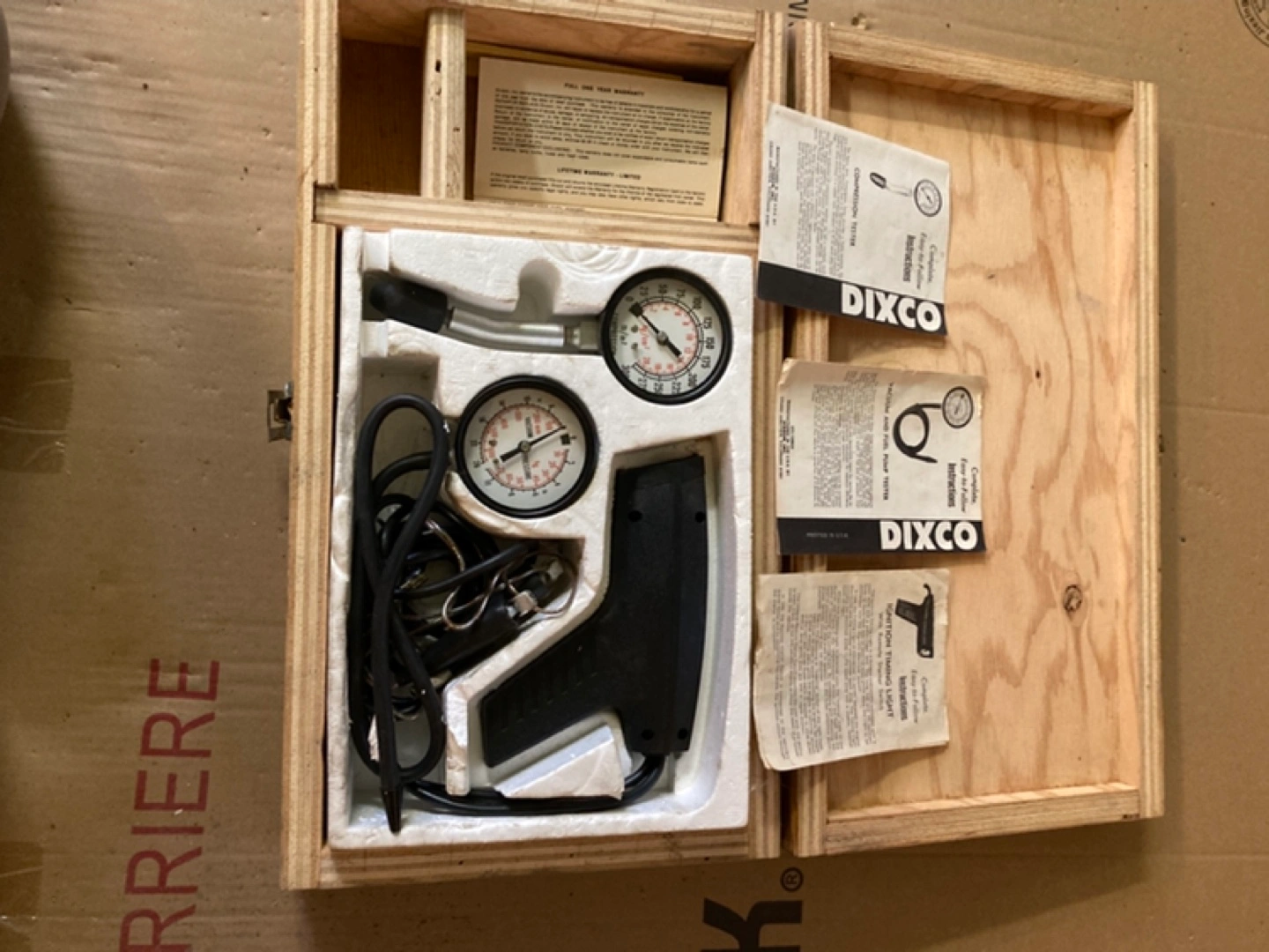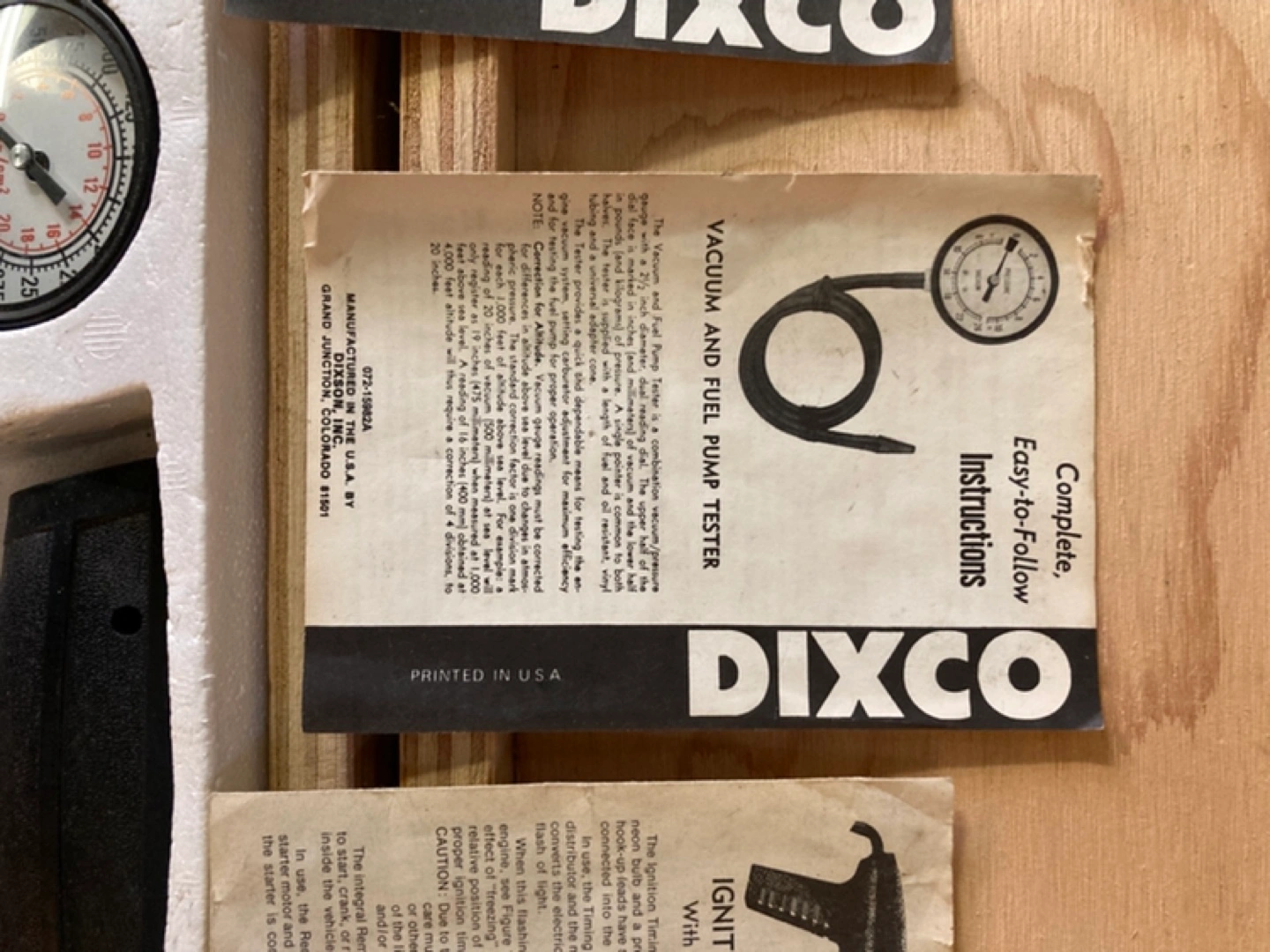 43Vintage automotive tune-up kit. Includes compression tester, vacuum and fuel pump tester, and ignition timing light. All in custom built wooden carrying case. Measures approximately 18" x 10" x 4". Pick up only Prefer cash