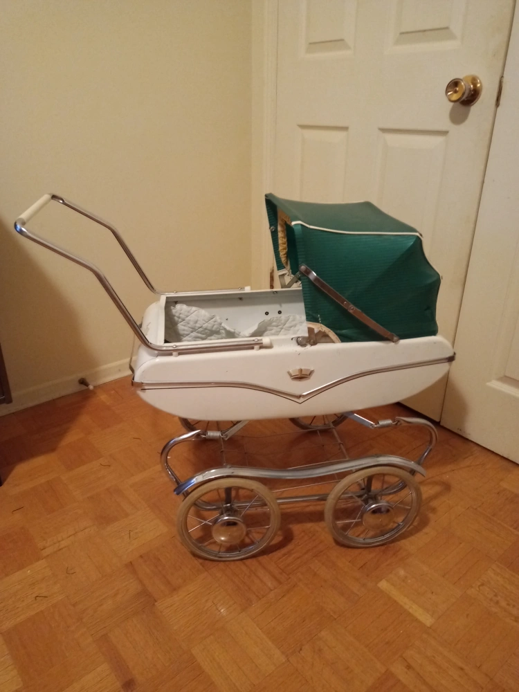 89Selling a vintage doll carriage. It's white with a green canopy. It shows some signs of use and love, as you can see in the photos, but it's still a charming piece. Perfect for collectors or those looking for a unique child 's toy.