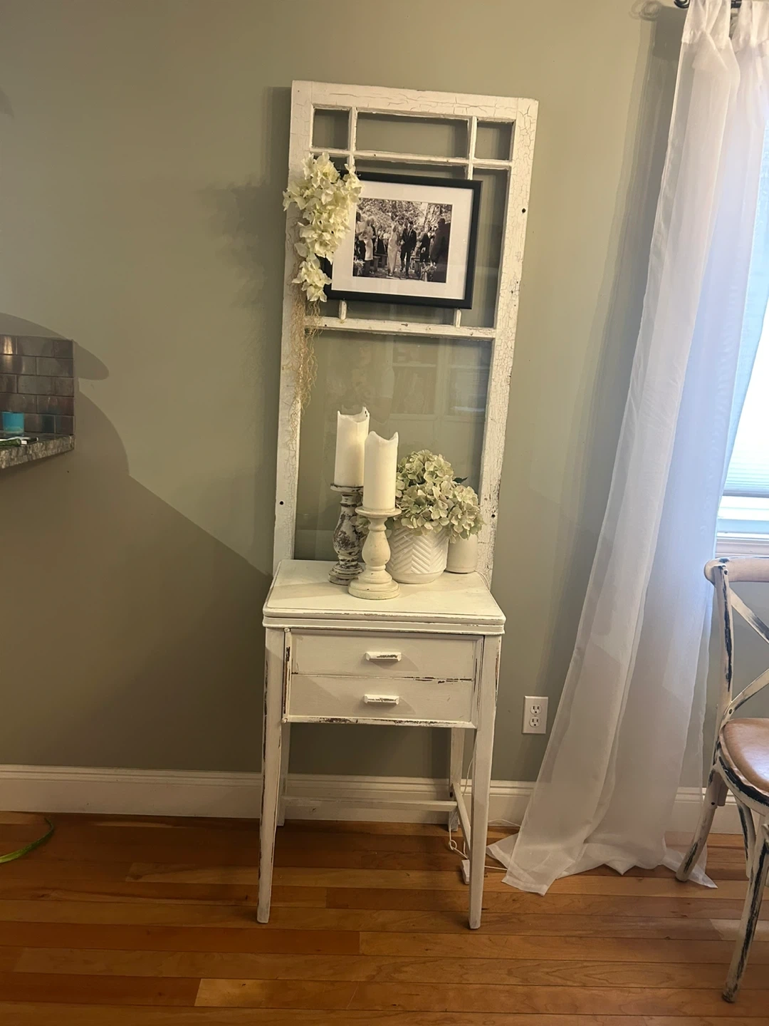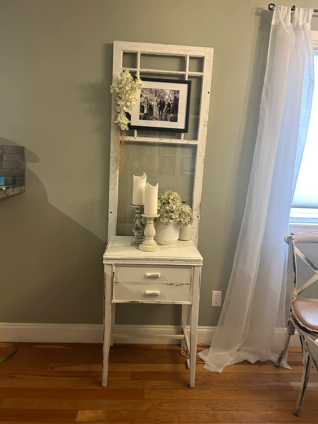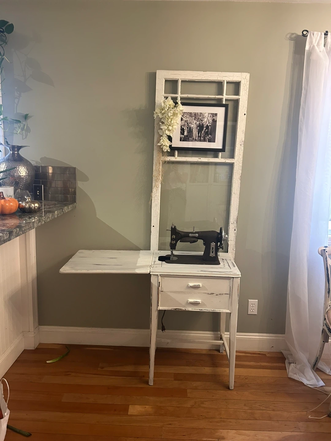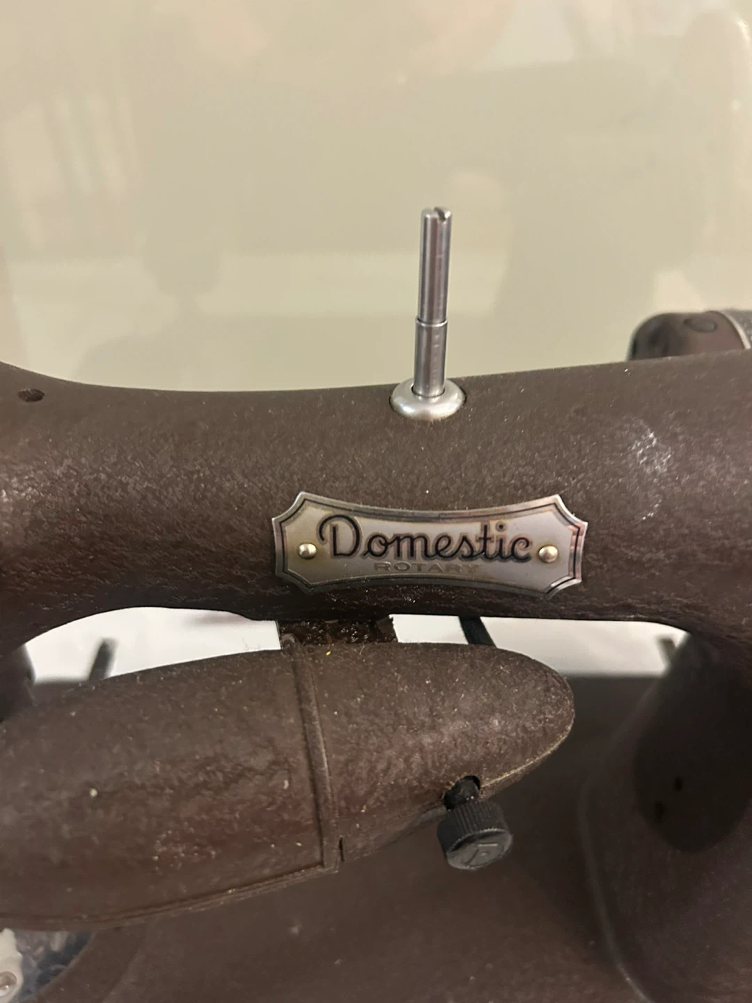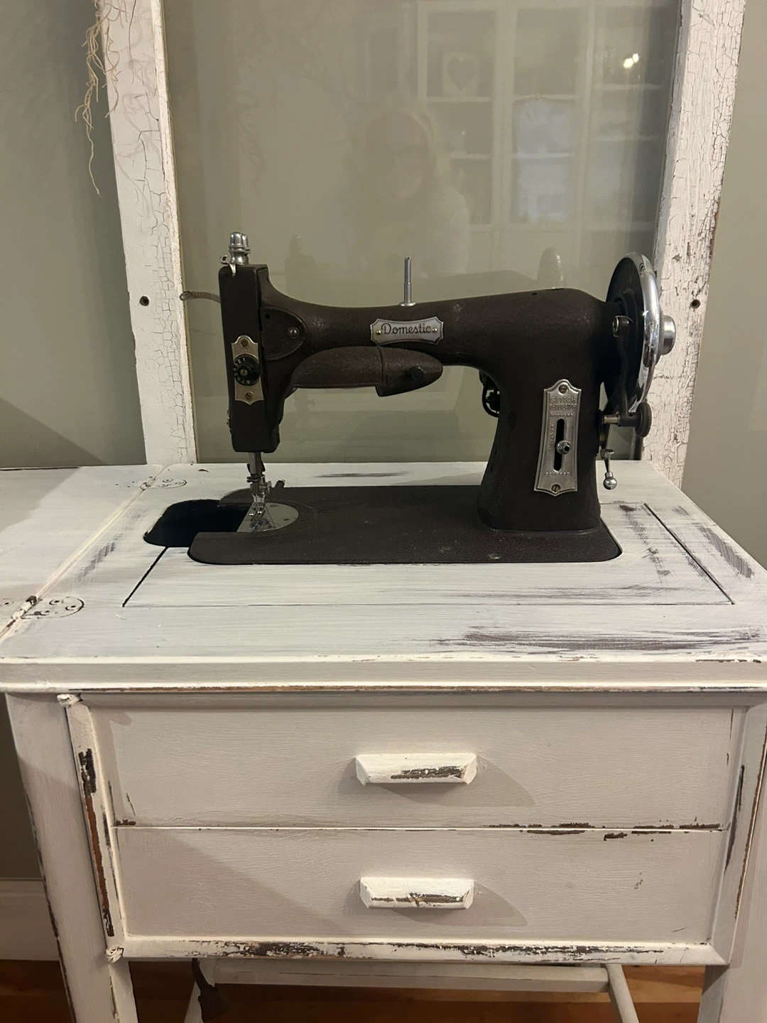 20Selling a vintage Domestic Rotary sewing machine with its cabinet. It's a beautiful piece of furniture with a classic sewing machine. The cabinet has a distressed white finish, adding to its charm. Perfect for collectors or anyone looking for a unique statement piece!