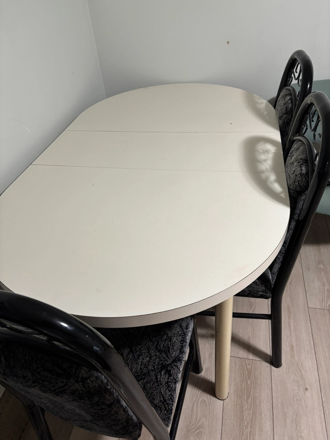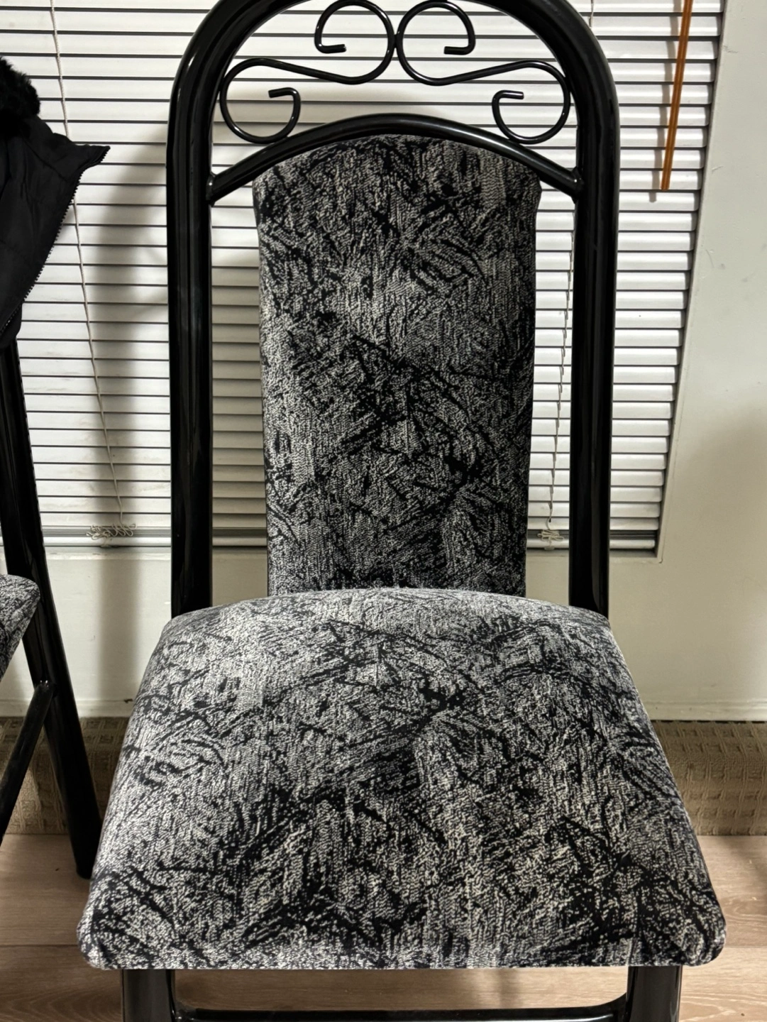 25Adjustable round drop-leaf table with six velvet covered chairs. White laminate tabletop, black metal frame chairs. Dark grey fabric upholstery. Good for small spaces. Pet-free household