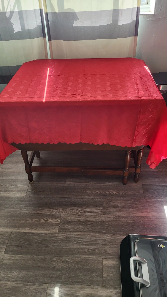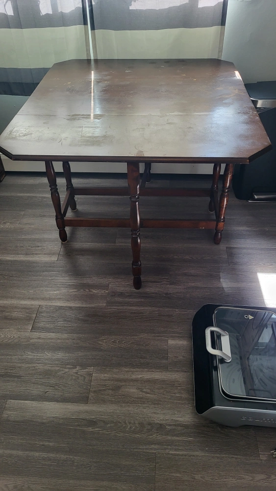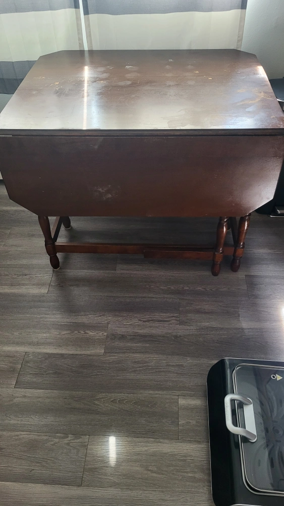 A vintage drop leaf table with a dark wood finish. The table has turned legs and a simple design. The top leaves drop down to make a smaller table. The table has a lower shelf. It would be a great addition to a vintage or farmhouse home. It's ready to be refinished or painted. The table is in used condition and has some marks and scratches.