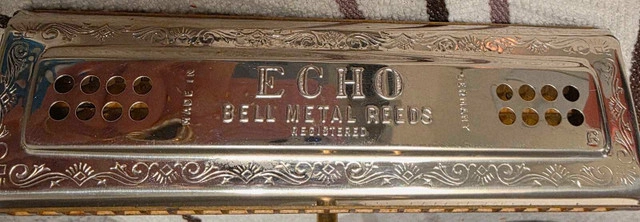 86This vintage M. Hohner Echo Harp harmonica, likely from the WW2 era, is in great shape and plays beautifully! A true collector's item with a rich history. Features bell metal reeds. Comes with original box. These harmonicas typically sell for $75-$125 on Kijiji, given the excellent condition, I've priced it at $100.