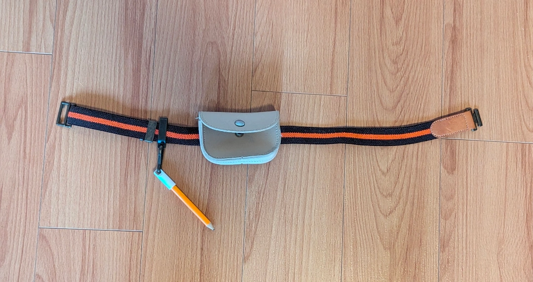 Selling a vintage elastic belt! It features a small pouch, perfect for carrying small items. The belt is black with orange stripes and has a leather detail on one end. It also includes a pencil.