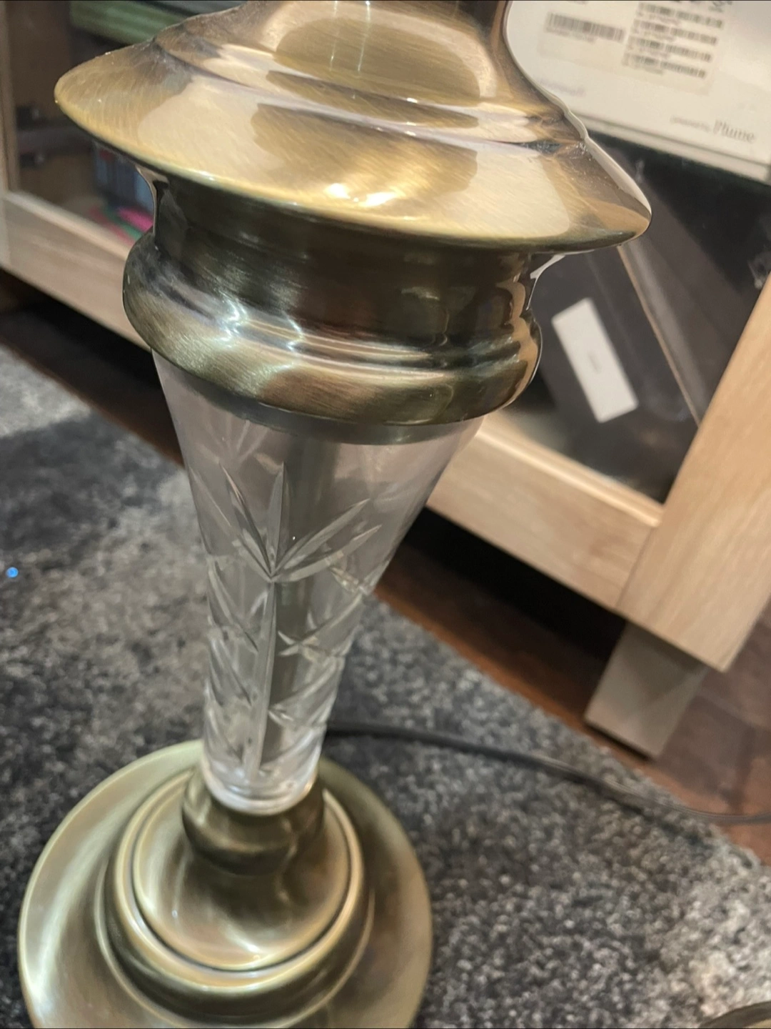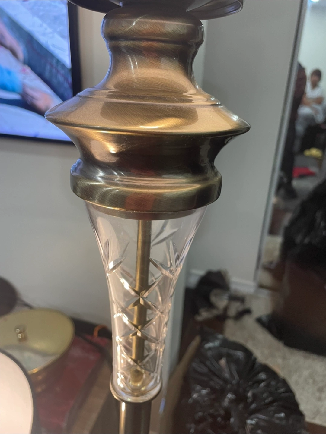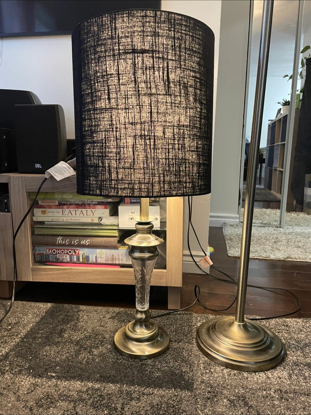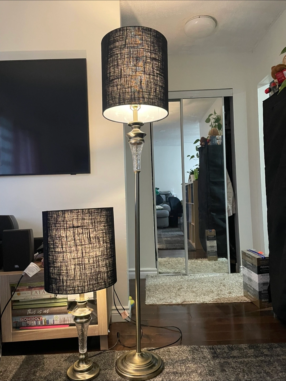 Matching table and floor lamps. Brass coloured bases and etched glass accents. Black linen shades included. Great for adding ambient lighting to your home.