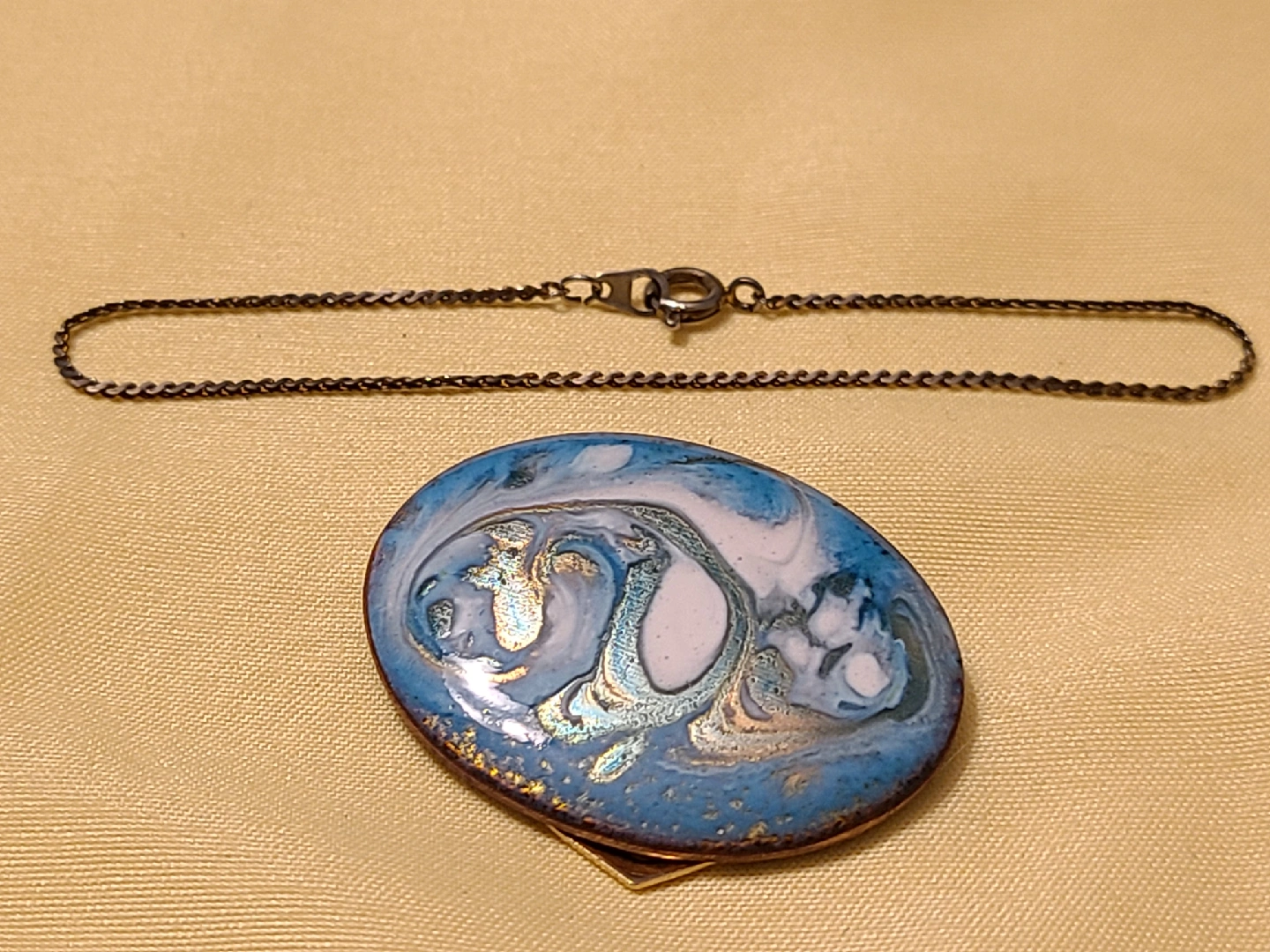 Selling a vintage enamel brooch and bracelet. The brooch has a unique design with swirling patterns in blues, whites, and golds. The bracelet is a delicate chain. Both pieces are in good condition and would make a lovely addition to any jewelry collection Pick up only. No delivery. Price negotiable.