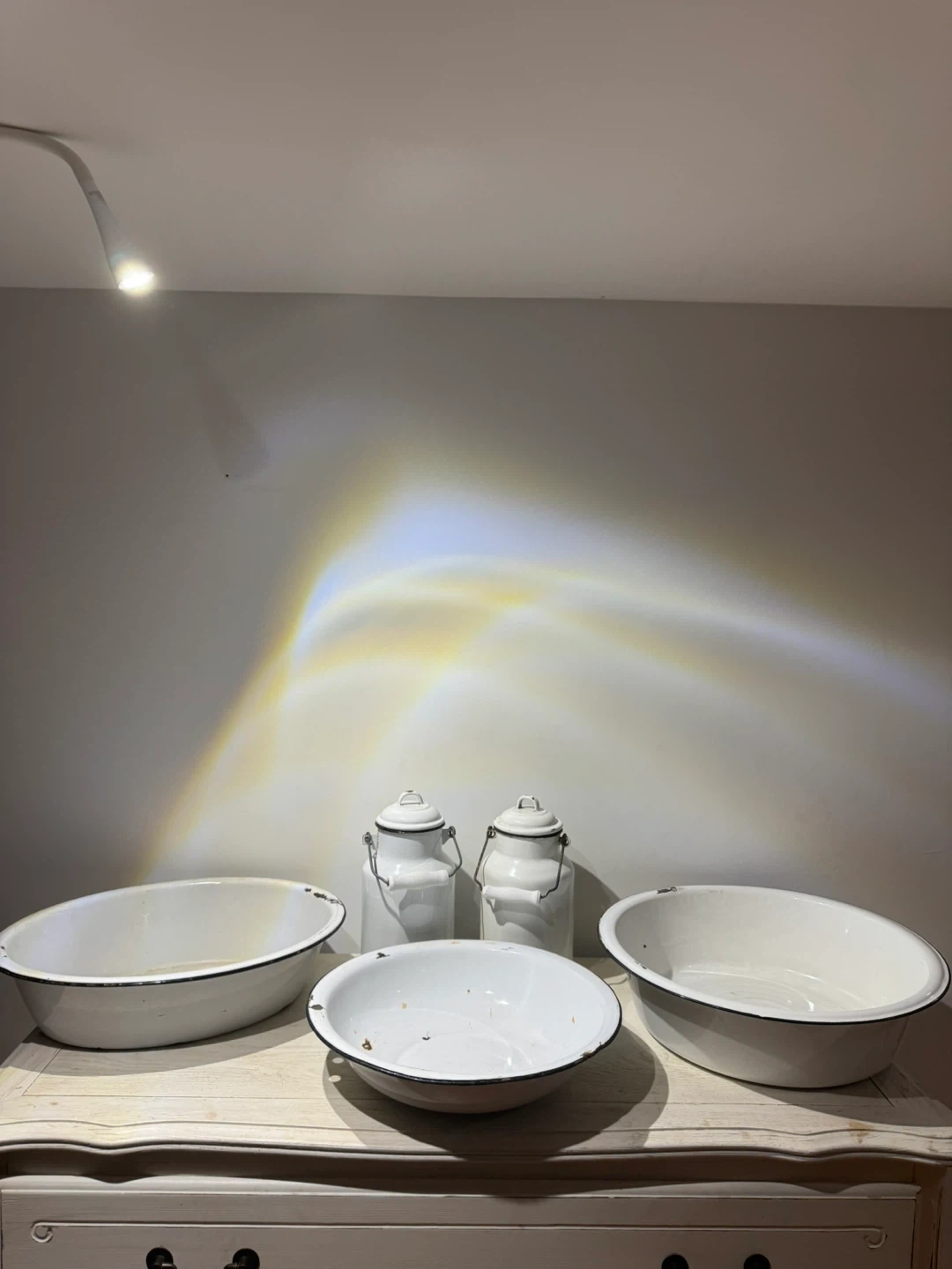 10Selling a collection of vintage enamelware items! Includes two milk cans and three bowls of varying sizes. These pieces have a classic, rustic look and would be great for decor or practical use. They show some signs of wear consistent with their age, adding to their charm. Cash only Pick up Avenue road north of Lawrence.