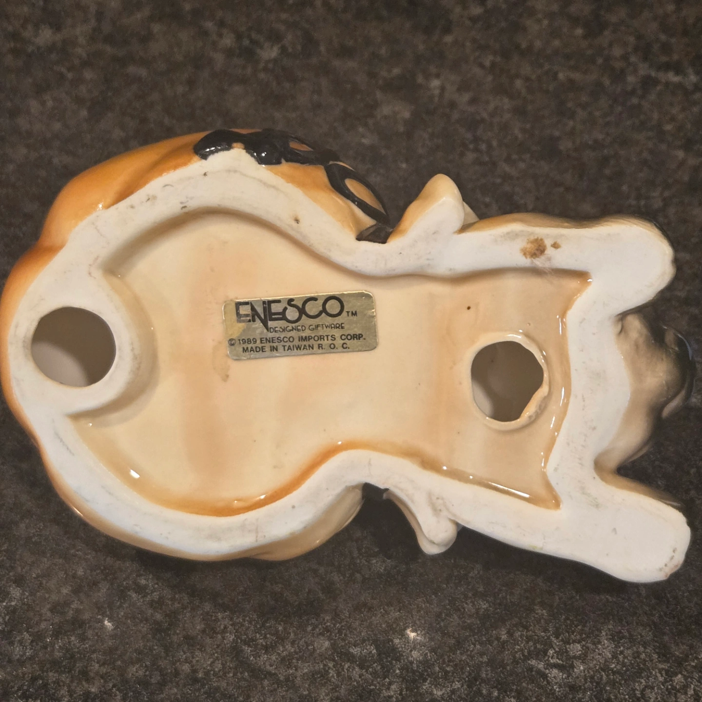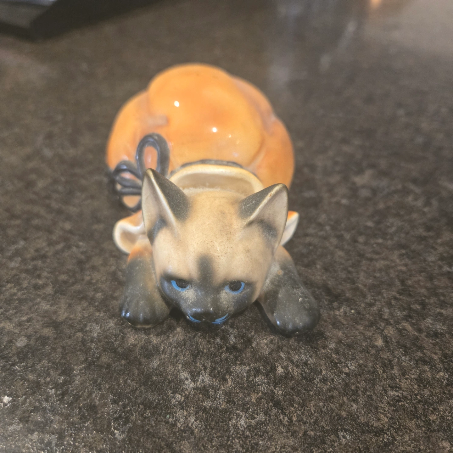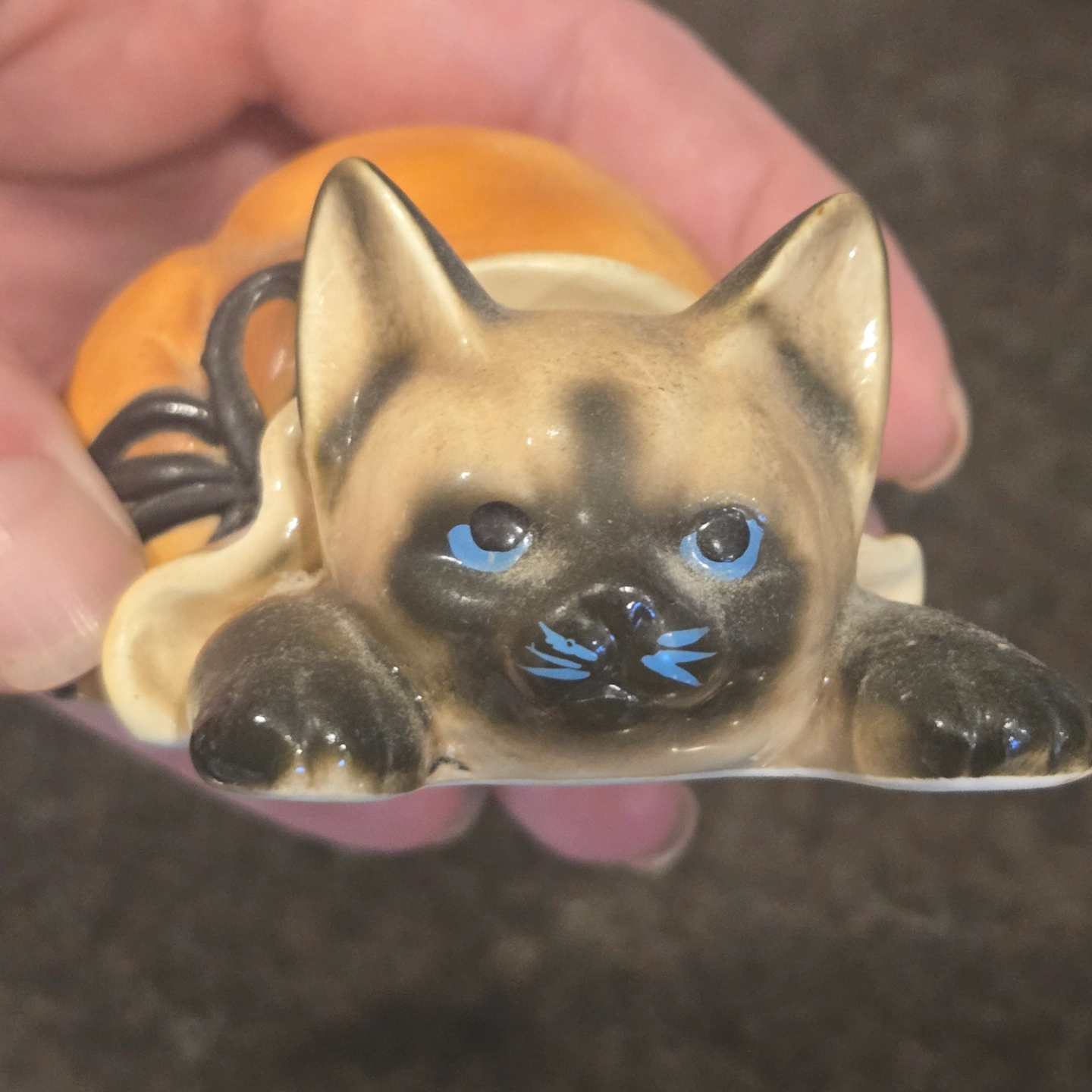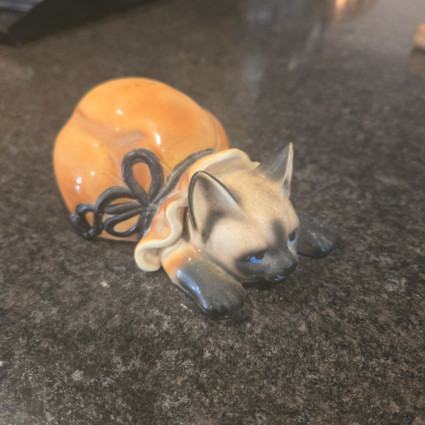71Adorable vintage figurine. Absolutely adorable Siamese kitten resting halfway in a string pouch. Symbolic of the idiom; 'Looks like the cat's out of the bag'. Finely detailed, this would be a nice pick-me-up on any desk, be it office, or home. Collectible item.