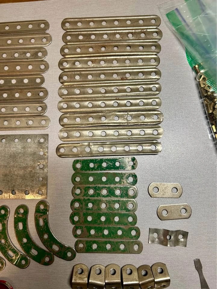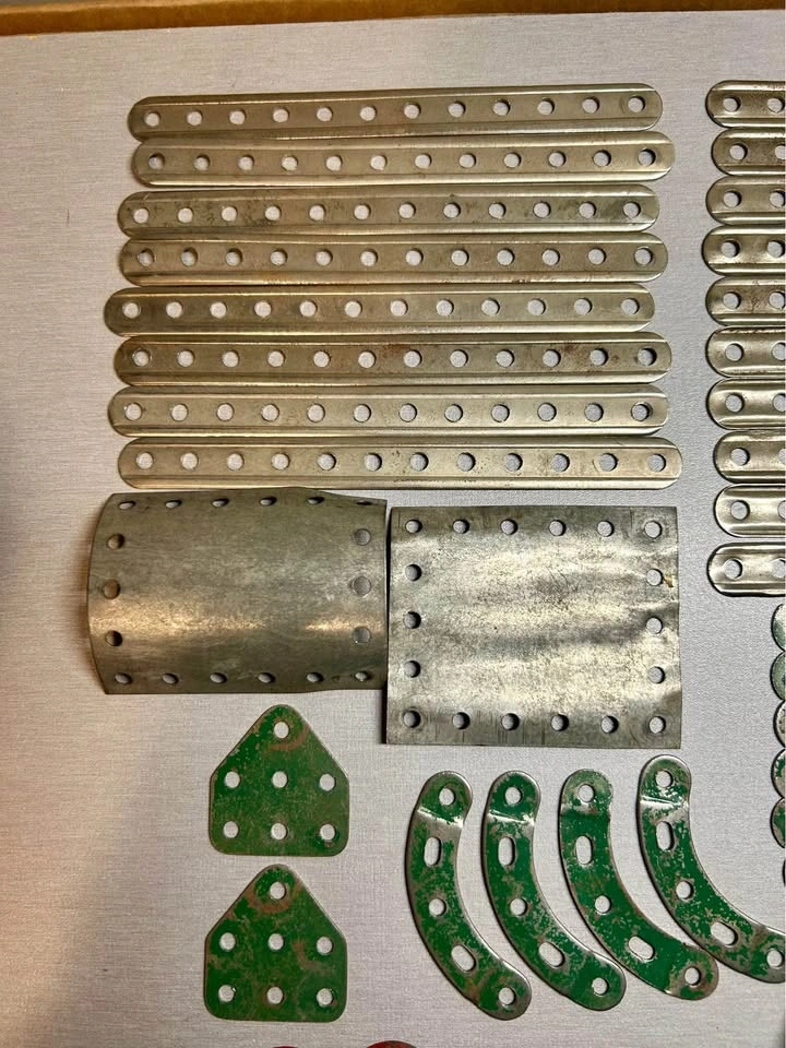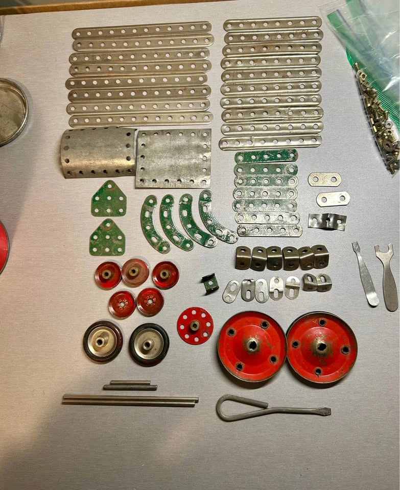 Original The Engineer Junior educational construction set made by Armstrong Bros. Engineering Ltd., Toronto, and distributed by John Strait Sales. Canadian Meccano-style metal building set, likely late 1940s to early 1950s. Comes with the original red tin showing printed label and $1.98 price mark. Inside are mostly original parts including eight 6-inch bars (missing two), ten 4-inch bars, curved and triangular plates, metal brackets, rods, pulleys/wheels, small tools, and a bag of brass bolts and nuts. Tin and pieces show normal age wear with light patina and some paint loss. Partial but clean, authentic example — great for display, restoration, or completing another vintage set. Pickup willow park drive and bonaventure drive SE, cash please