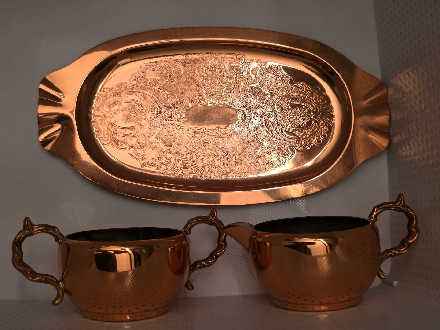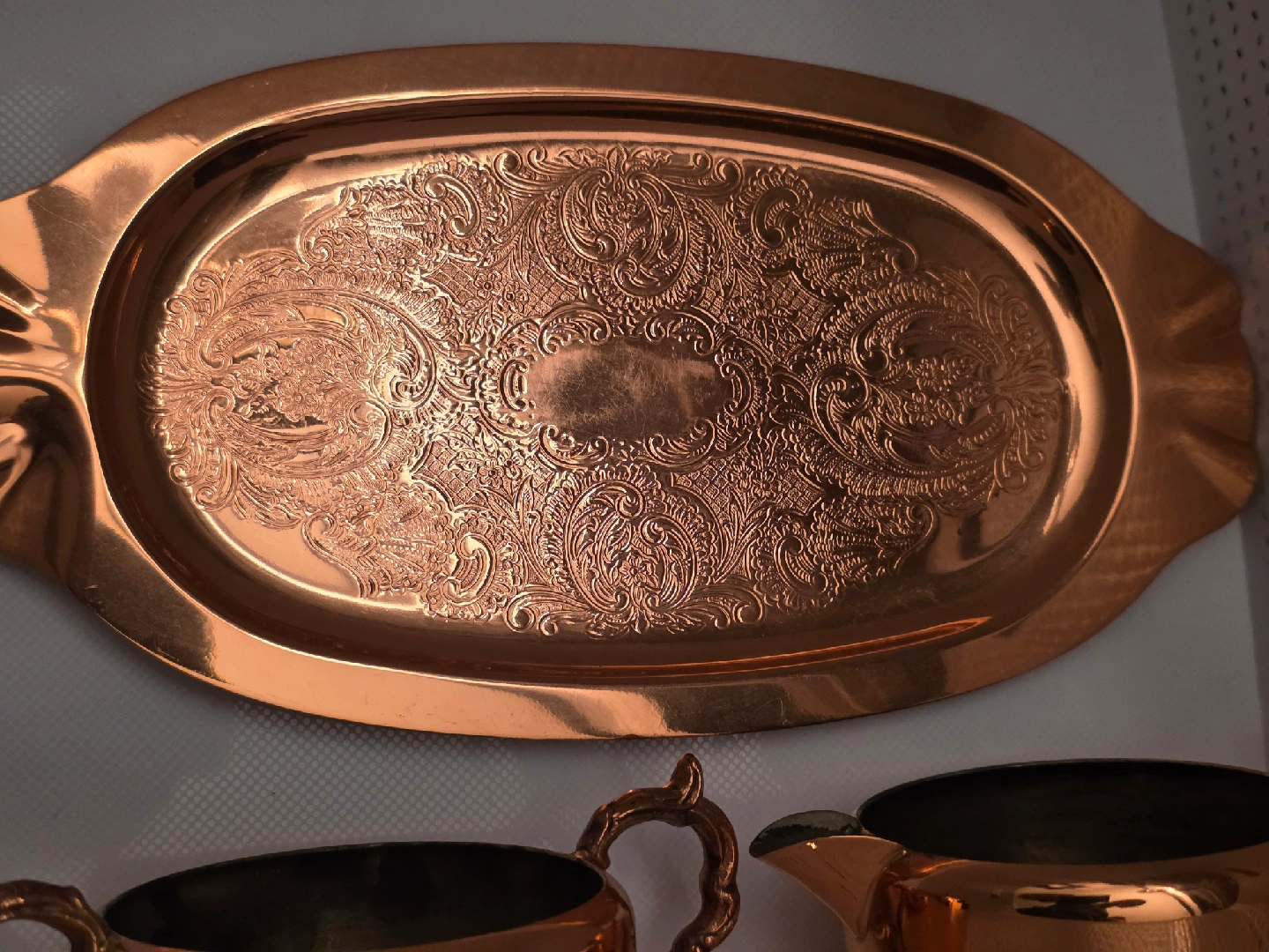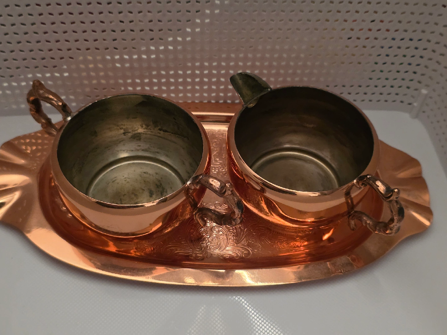 25Vintage EP Copper tray with sugar and creamer set. The tray has an ornate design. Perfect for adding a touch of vintage charm to your home!