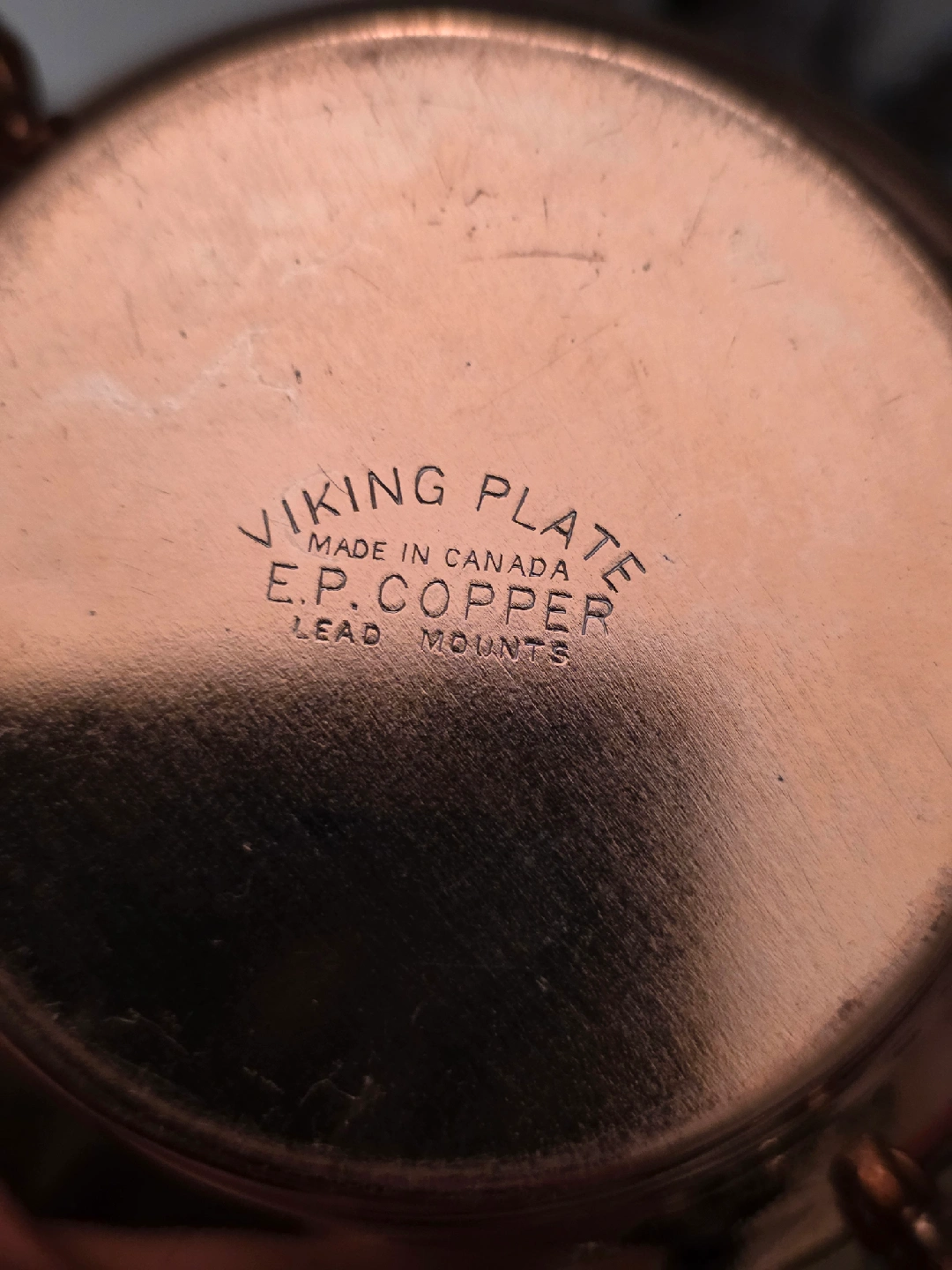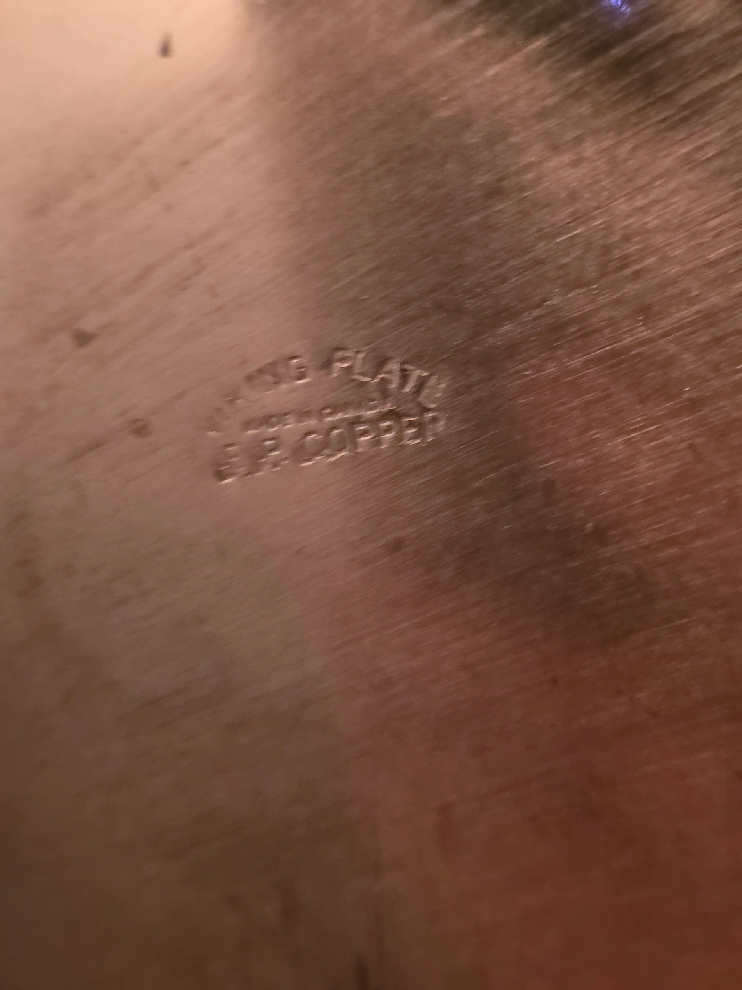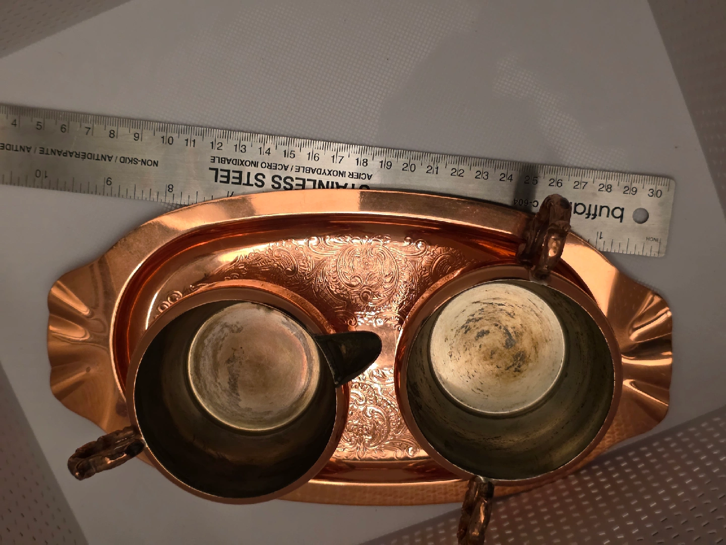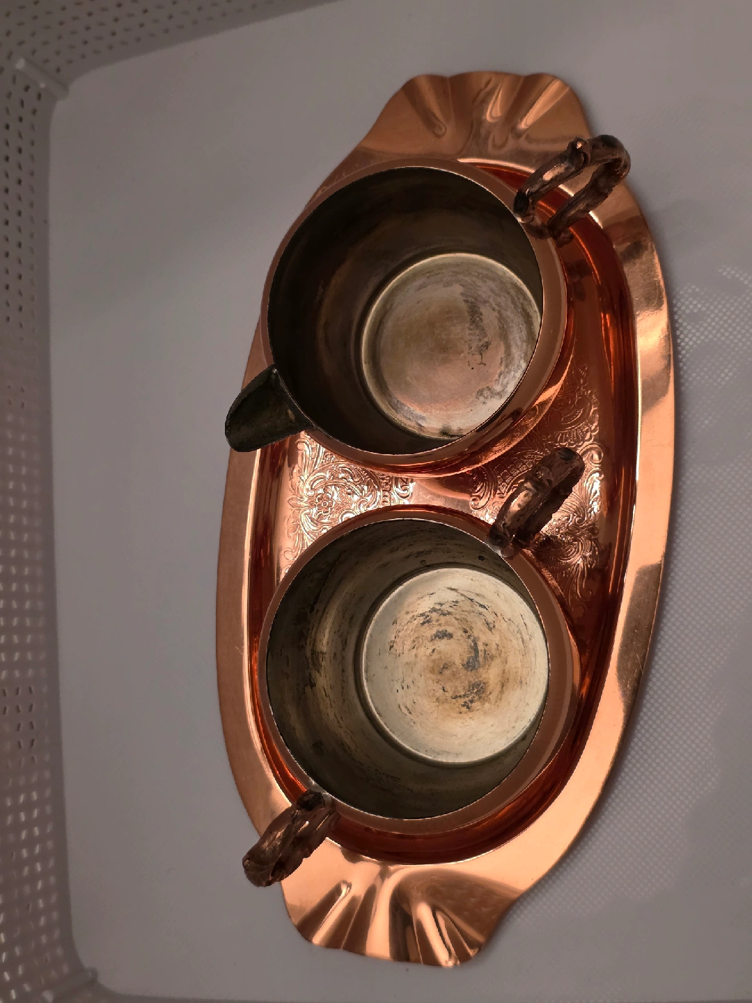 25Vintage EP Copper tray with sugar and creamer set. The tray has an ornate design. Perfect for adding a touch of vintage charm to your home!