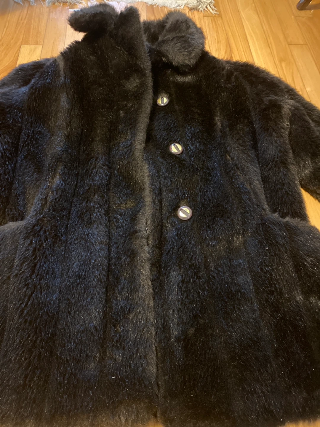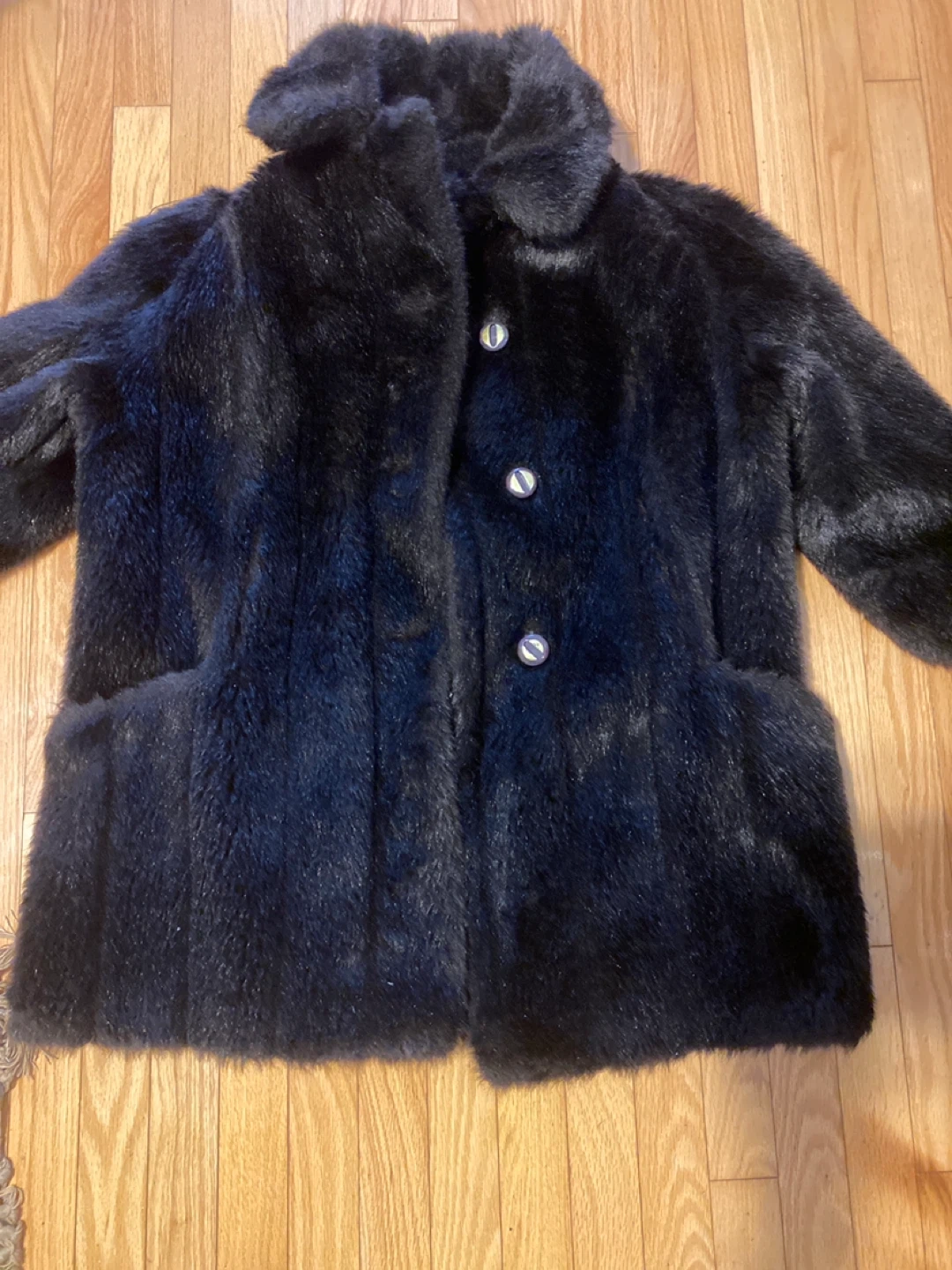 10Selling a vintage faux fur coat in black. It's in great condition and perfect for adding a touch of retro style to your wardrobe. The coat features a classic design with a soft, plush feel. It has a button-up front and pockets for added convenience. This coat is sure to keep you warm and stylish during the colder months