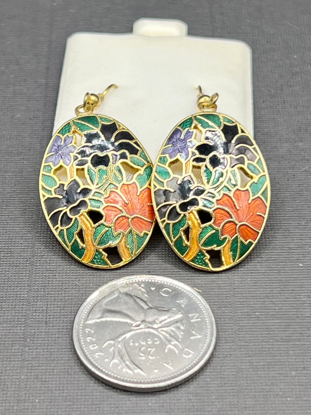 53These are a pair of cloisonné earrings with a floral design. They are in good condition and ready to wear!