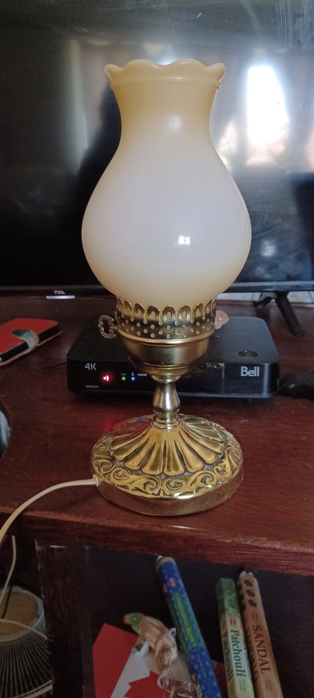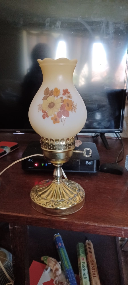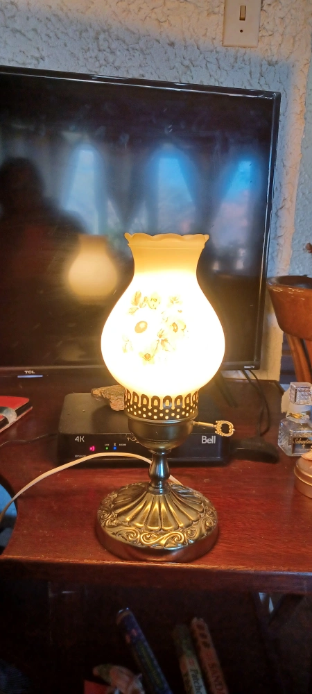 2 Beautiful Vintage Floral Hurricane lamps. In Great Condition. no chips, cracks, solid. In a smoke, pet free home. very clean. this classic milk glass lamps has a brass base complement the delicate Floral pattern on the shade.