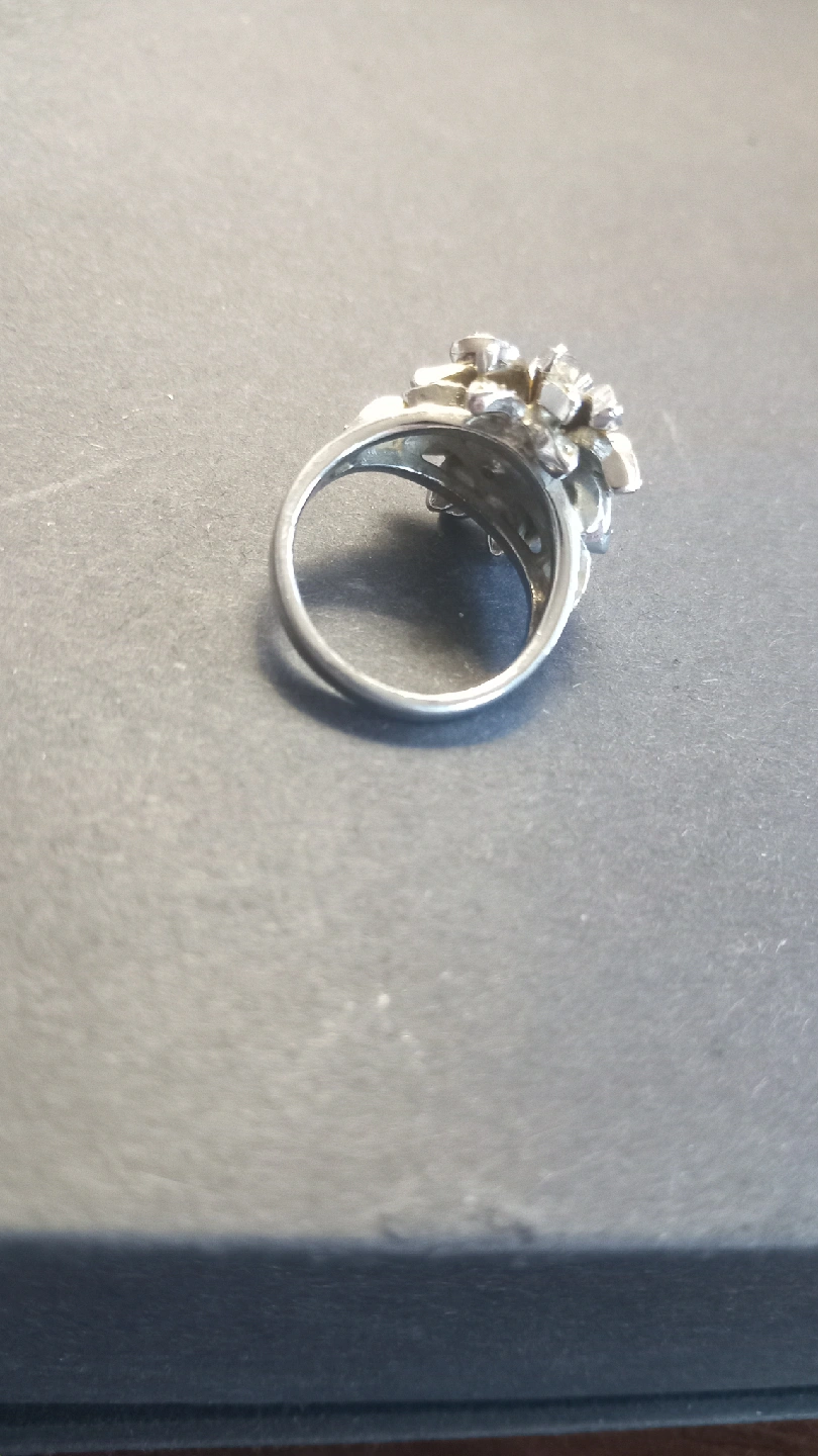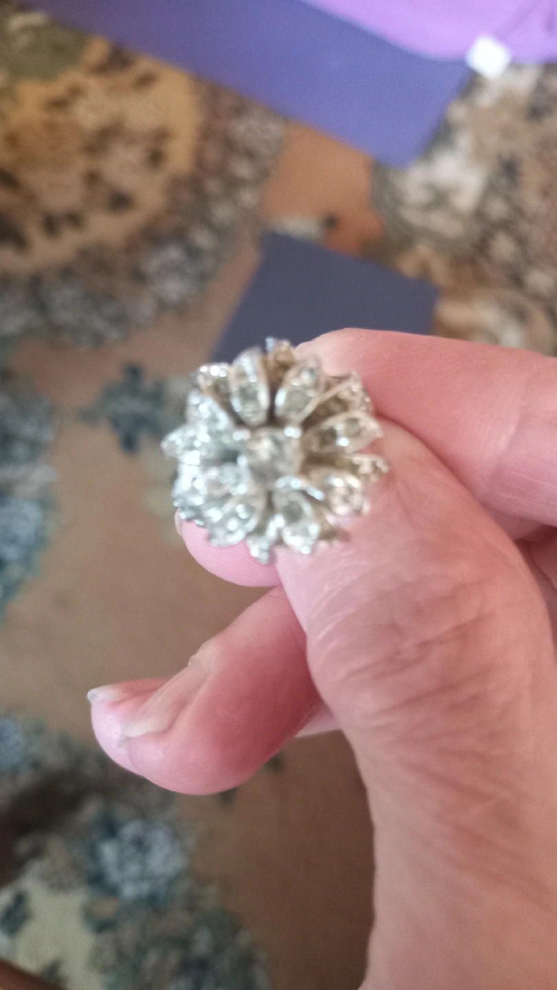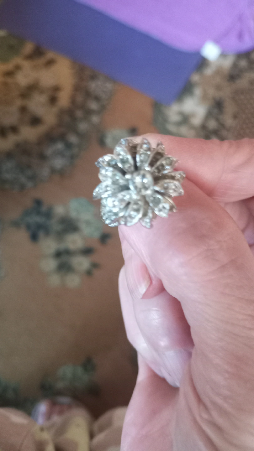 Selling a vintage flower ring. It has a lovely floral design with what looks like small stones set in the petals. The ring is in great condition and would be a beautiful addition to any jewelry collection. I have small fingers. it's too big for me. Belonged to my late mother not sure of size would have to try on.