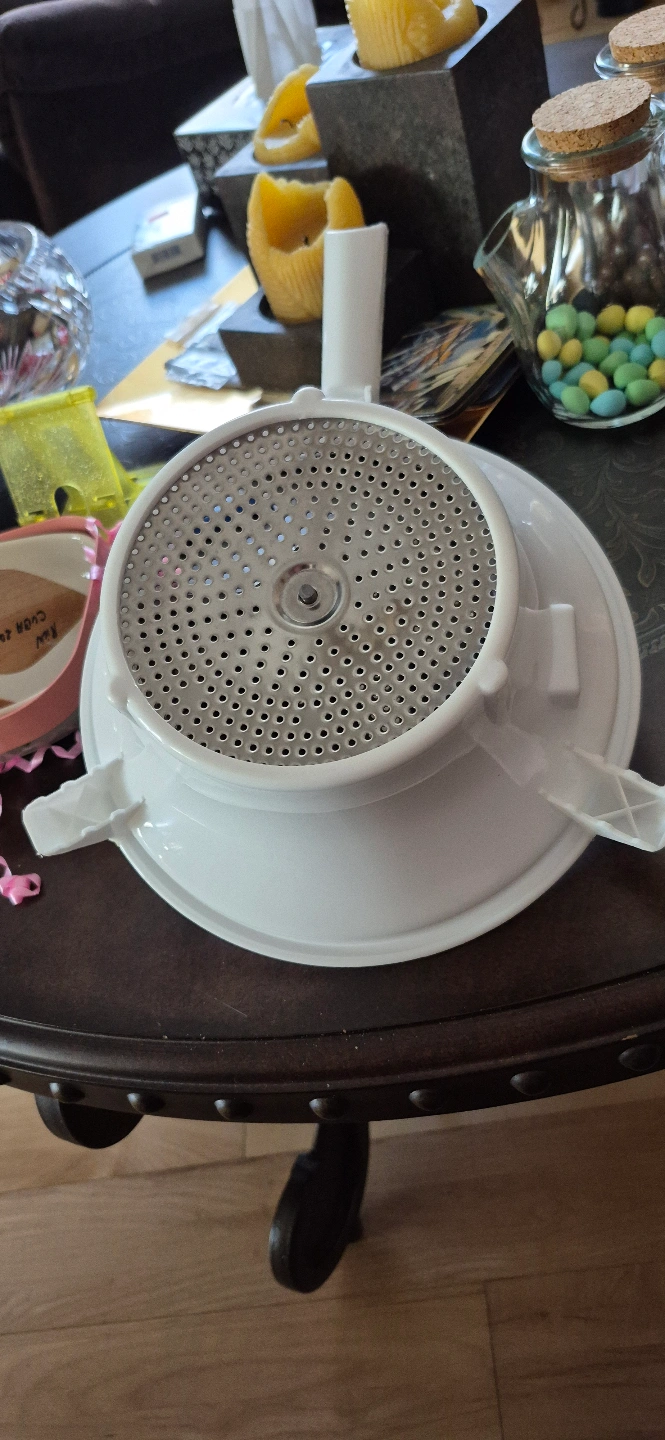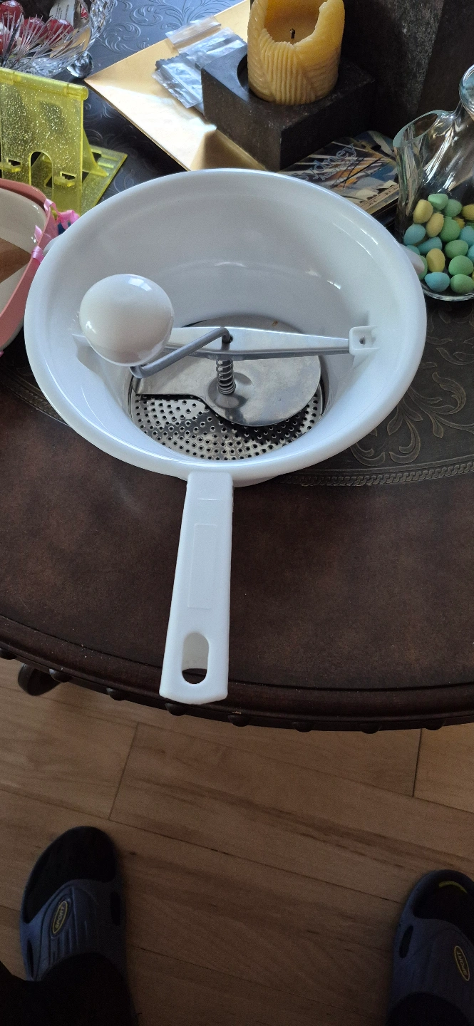 White thick, strong plastic food mill. Metal grinding plate. New, never used. perfect for making sauces, purees, and baby food. this versatile kichen tool is ready to assist in your culinary adventures!