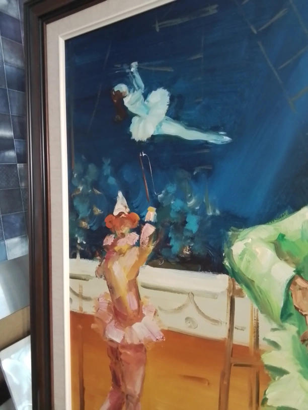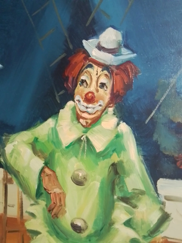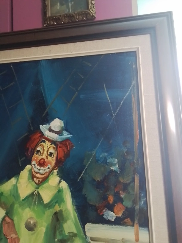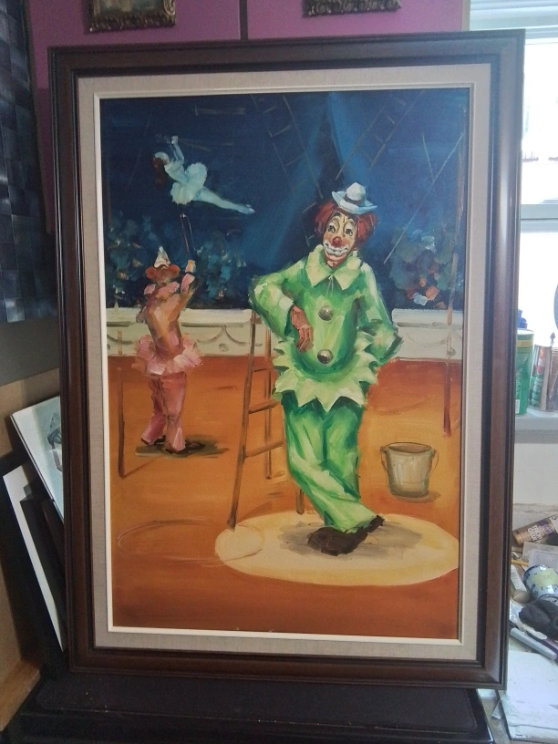 114Vintage Framed Oil Painting – Circus Clown and Performers Scene This vintage framed oil painting captures a whimsical circus scene with a clown as the central figure, showcasing vibrant colors and unique artistic expression. It's a great conversation piece! This item is used and sold as is. Lively and colorful vintage oil painting on canvas depicting a whimsical circus scene with a central clown figure in a green suit, flanked by a pink-costumed performer and a trapeze artist soaring overhead. The bold brushwork and vivid palette capture the energy and spectacle of the big top. Set in a wood frame with a linen-style inner liner. Unsigned. Frame and canvas in very good condition with minor wear. A striking statement piece for collectors of circus art or vintage decor lovers Measurements: 30x42 Additional details: - Medium: Oil on canvas - Frame: Ornate wooden frame - Subject: Circus clown - Style: Vintage If the ad's still up, yes, it's still available! Snatch it up before the circus leaves town! Yonge Street and Steeles Avenue
