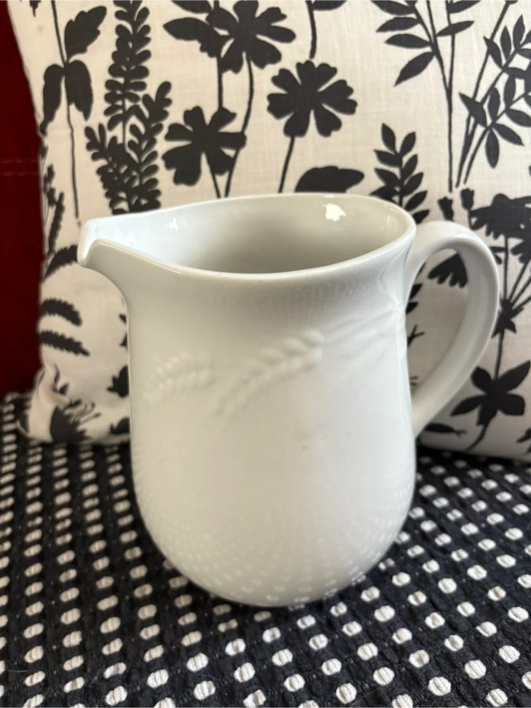 26Selling a lovely white ceramic creamer pitcher. There are some minor signs of wear on the spout, as shown in the photos, but otherwise, it's in great shape! Wheat detail on the pitcher Please see photos Chip and some minor scratches Priced accordingly