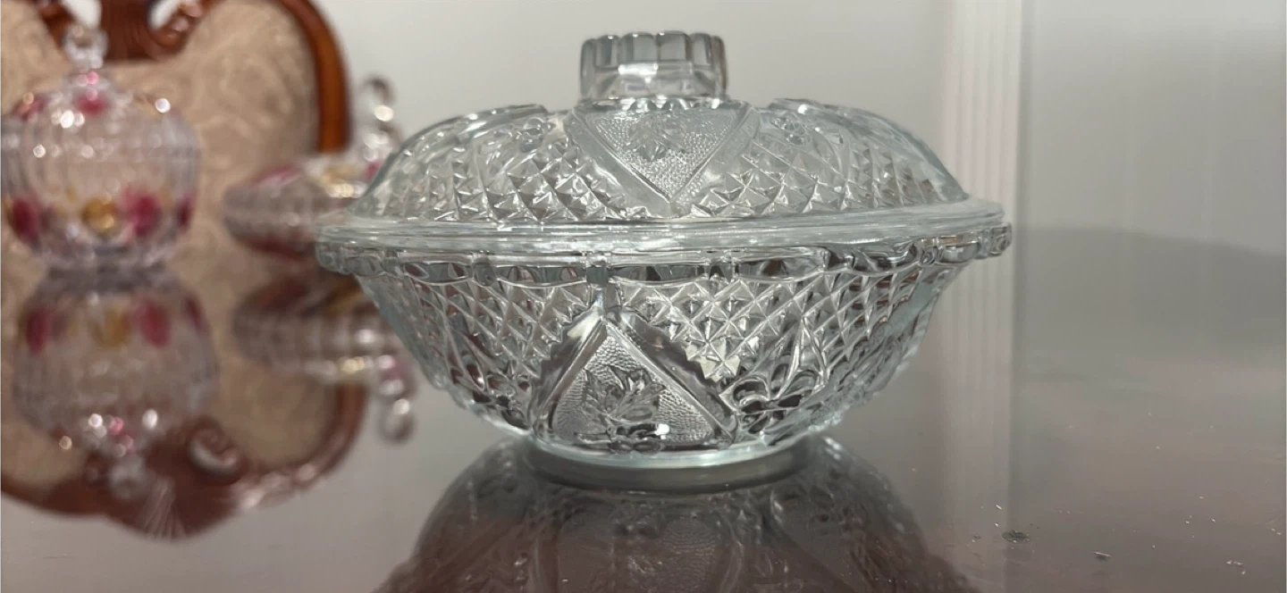 62Selling a lovely vintage glass candy dish with a lid. It has a beautiful heart design and a classic look. Perfect for adding a touch of elegance to your home decor or for serving candies and treats