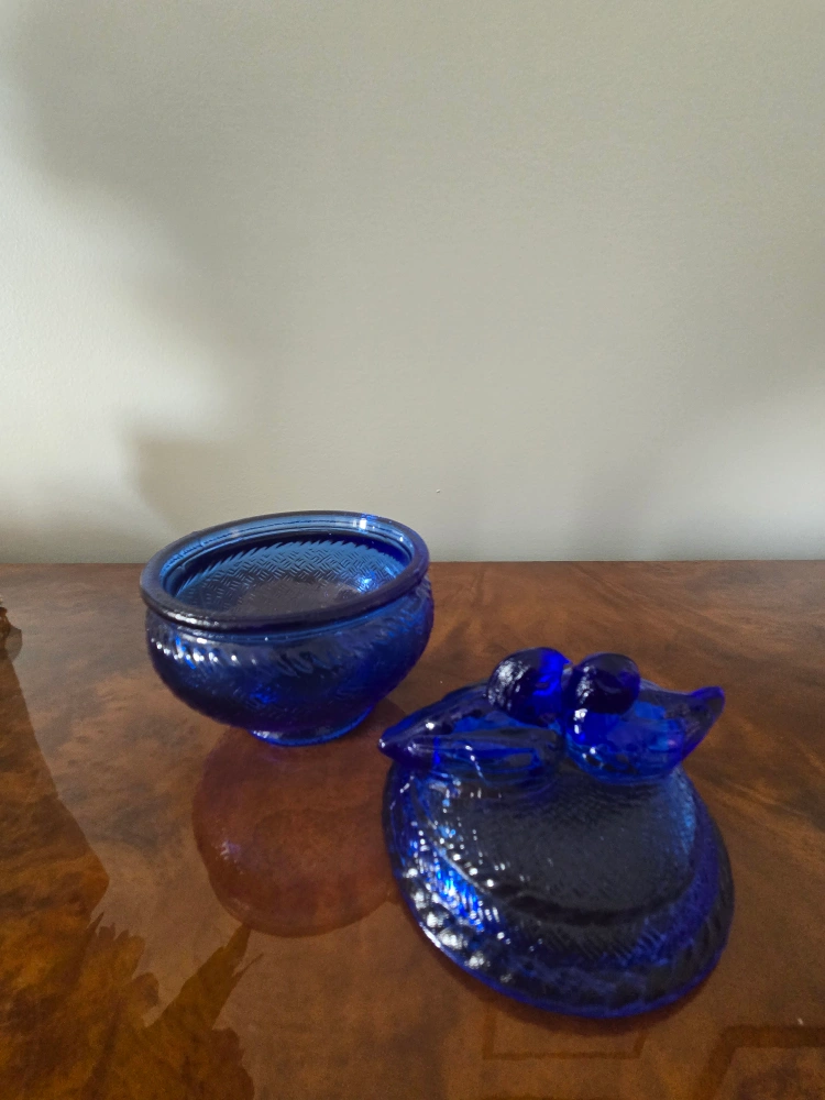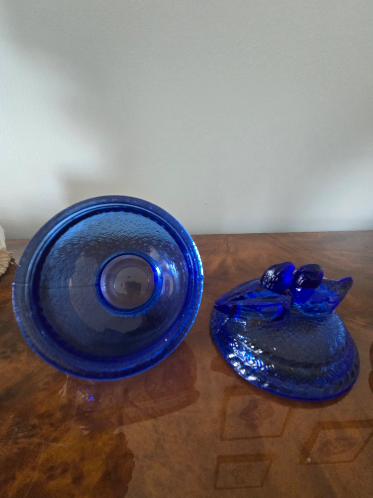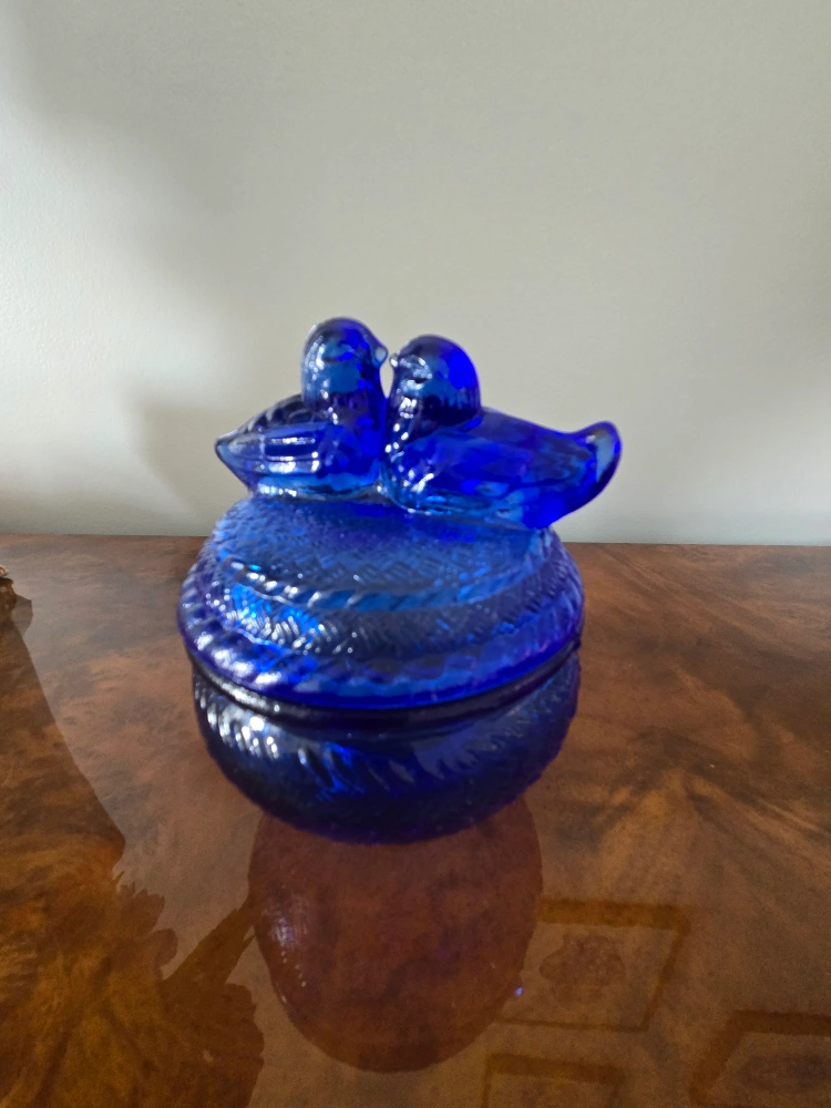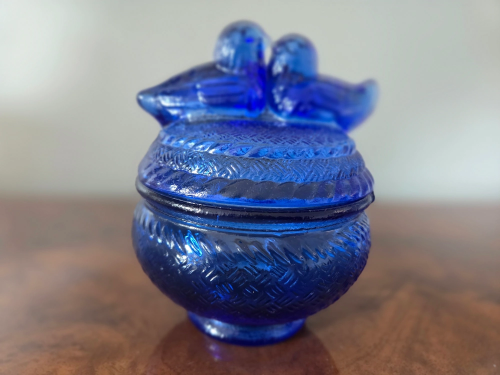 This is a beautiful vintage blue Cobalt trinket dish featuring two kissing birds on lid c1950's . It's perfect for storing small items or just as a decorative piece in your home. The dish is in great condition and ready to find a new home!