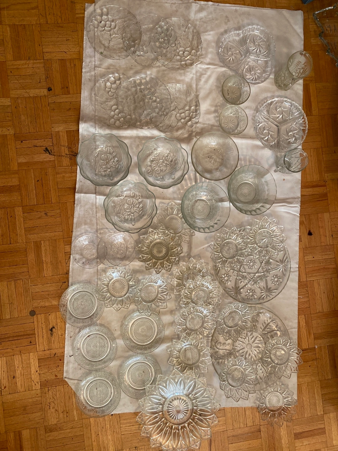 5047 piece Set of vintage glassware, includes various bowls, plates, and cups. All glass pieces are in good condition.