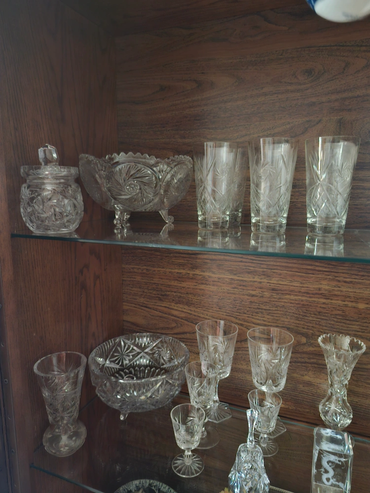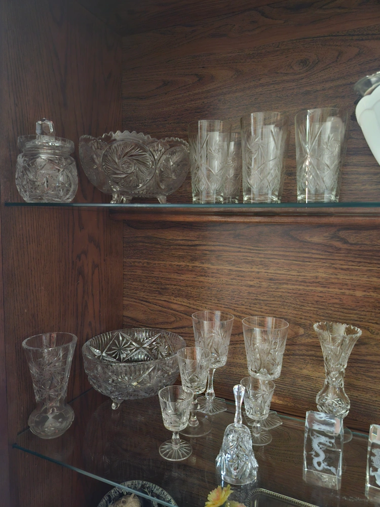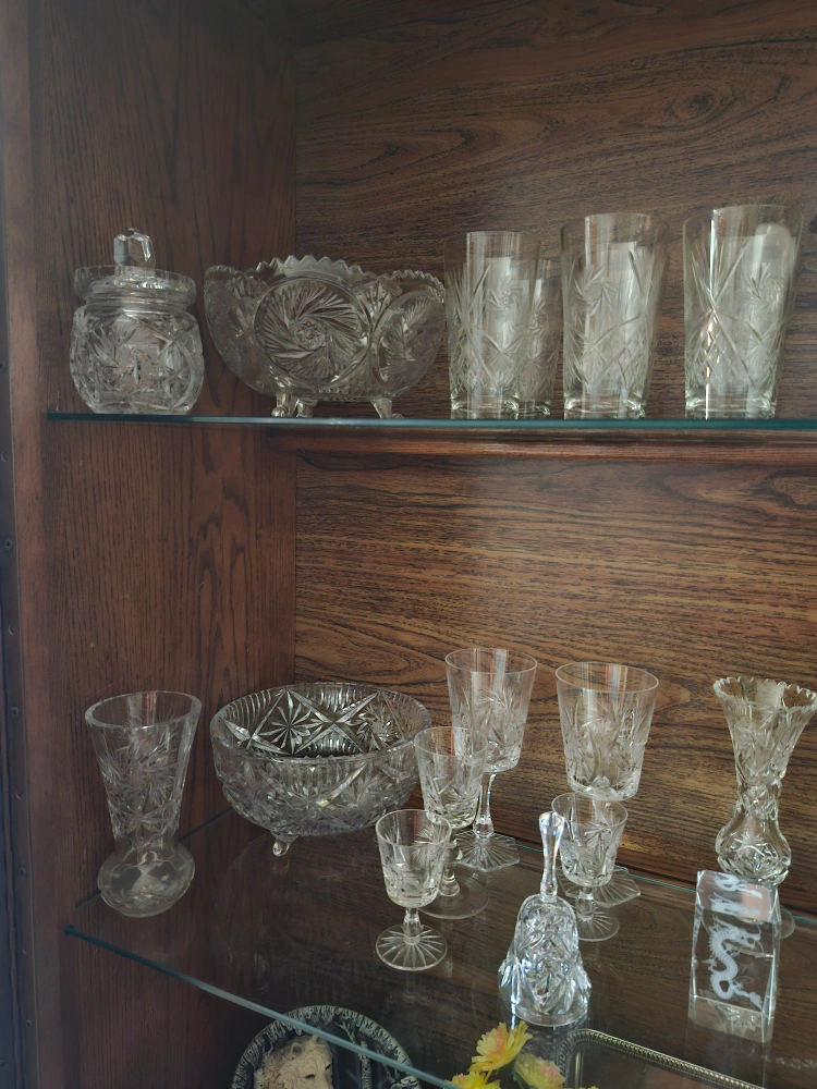 I am offering a beautiful vintage glassware set. A variety of cut glass pieces including bowls, glasses, a bell, and a jar. Perfect for elegant gatherings. It will create a peaceful ambiance for you and your guests. pinwheel crystal.